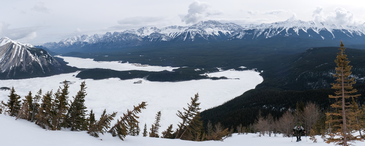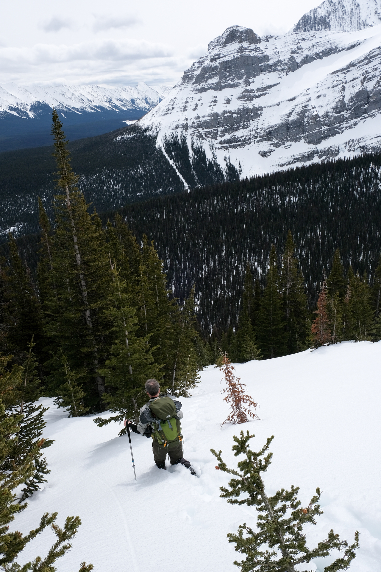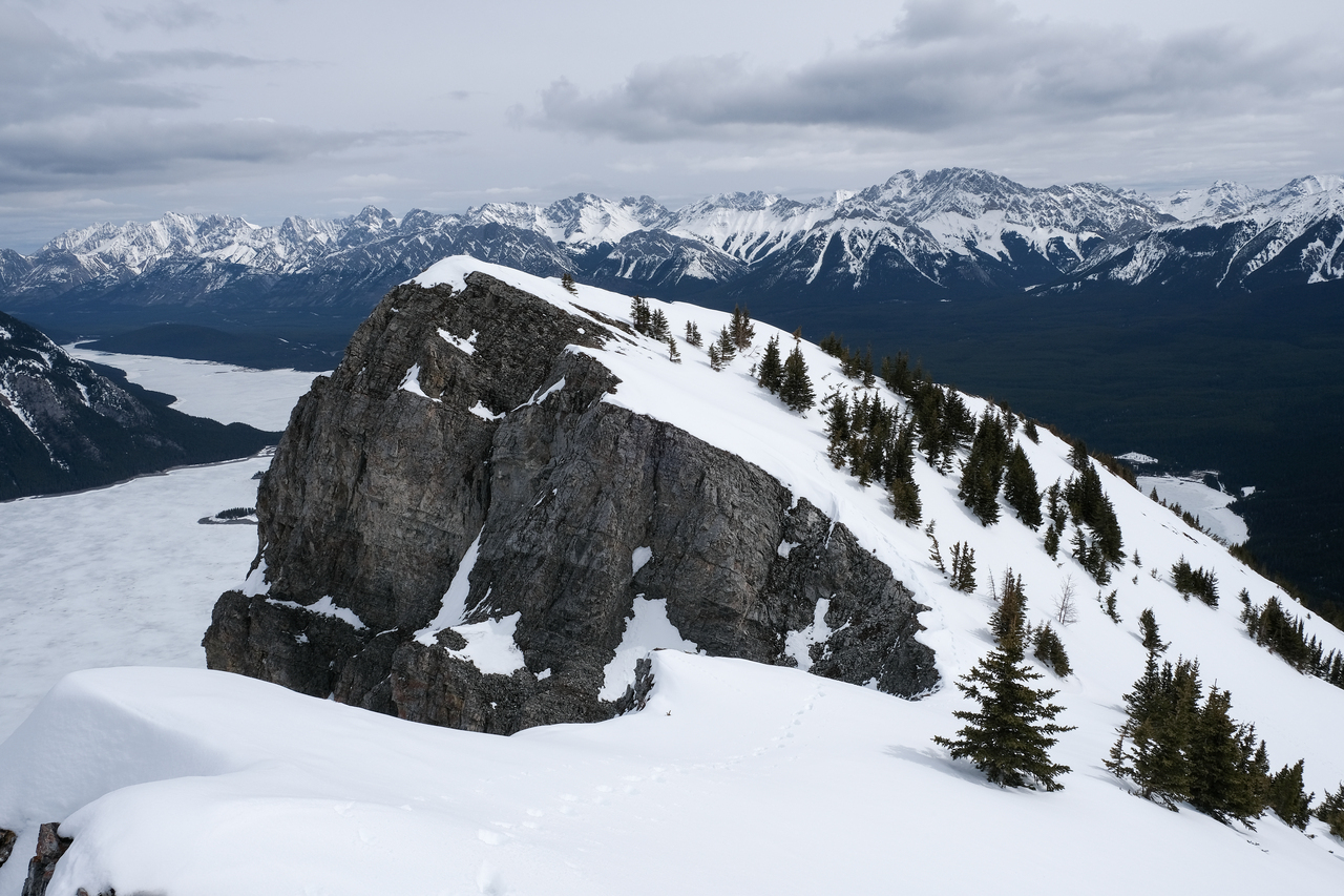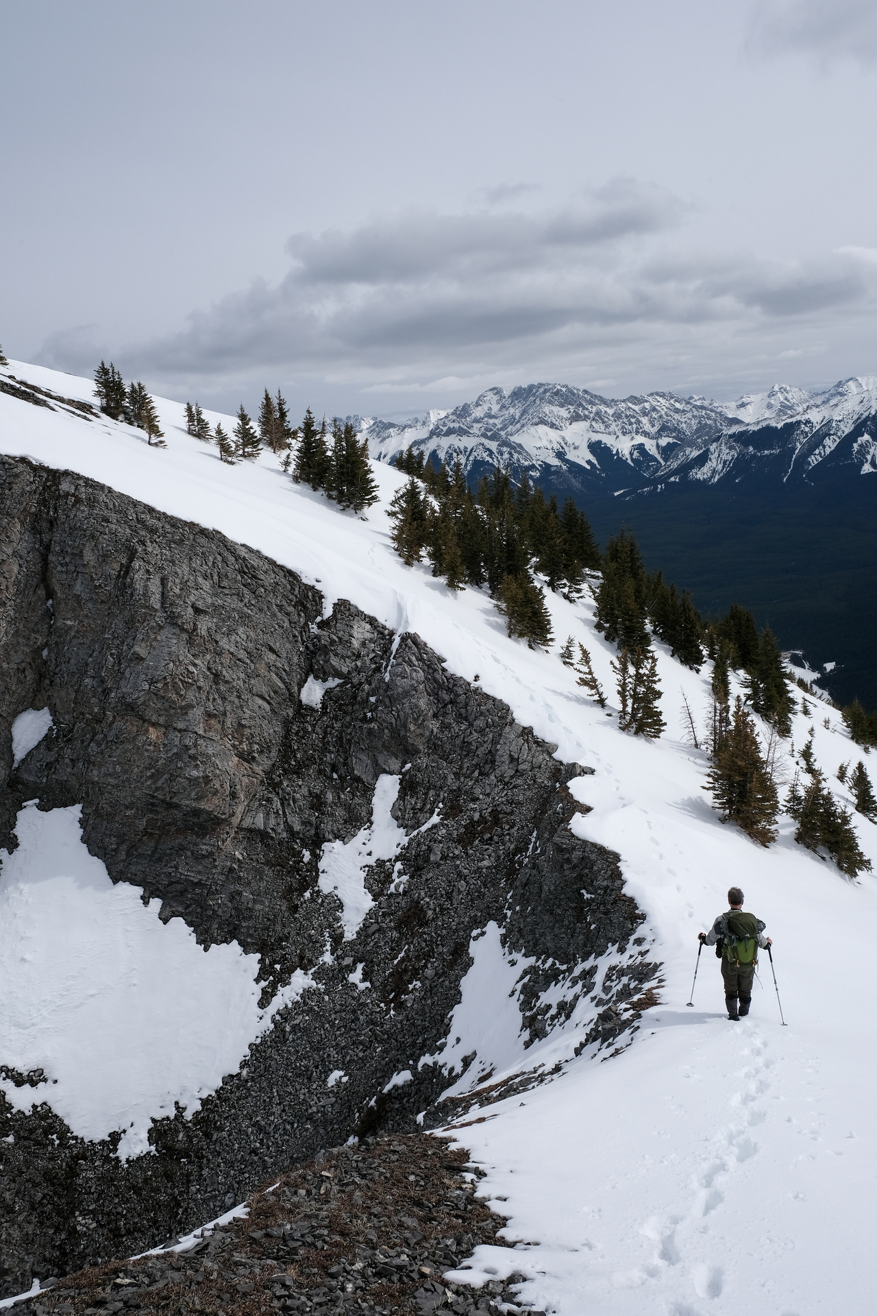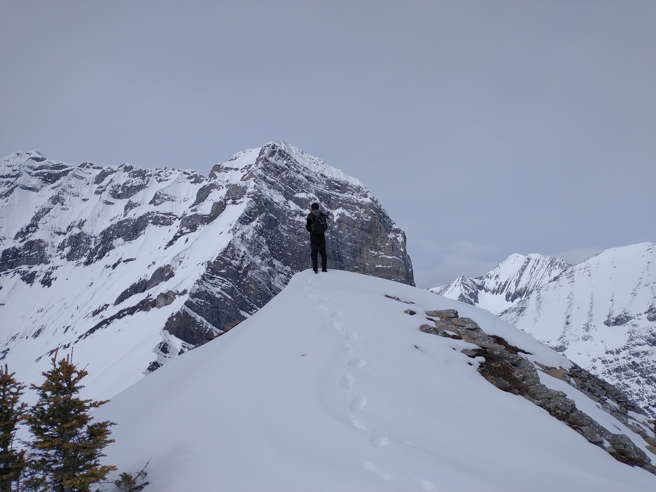 It's a long way down! Once on the ridge, you haven't escaped all hazards quite yet! The ridge does narrow at some points, with a sheer drop down to Upper Kananaskis Lake on your right, and a super steep snow gully (just waiting to slide!) on your left! Although it would be a walk in the park in summer, cornices can make for quite a dangerous situation!
