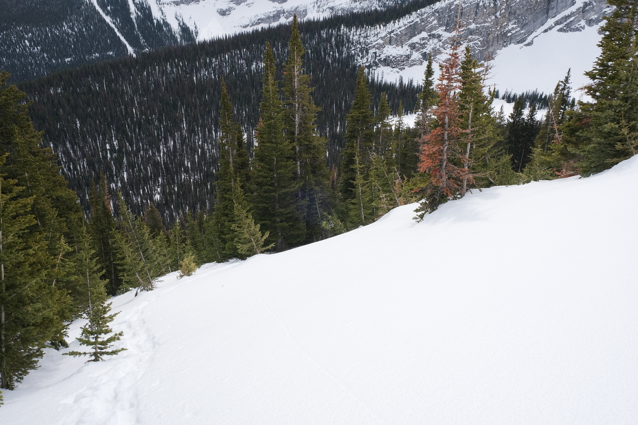 We soon reached the horizontal wall of trees, and traversed back to the opposite side of the open slope. (My dad blends in with the trees, center.)