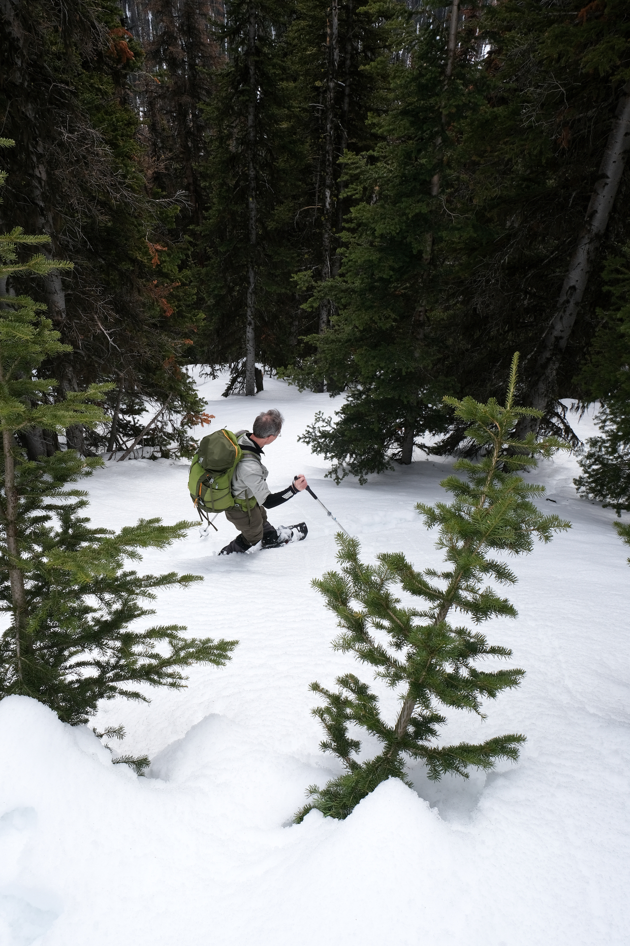 If you've ever snowshoed on wet, heavy, steep snow, you know how unstable it feels! The snowshoes just want to sit on the top layer and slide! These conditions forced us to descend very slowly and methodically.