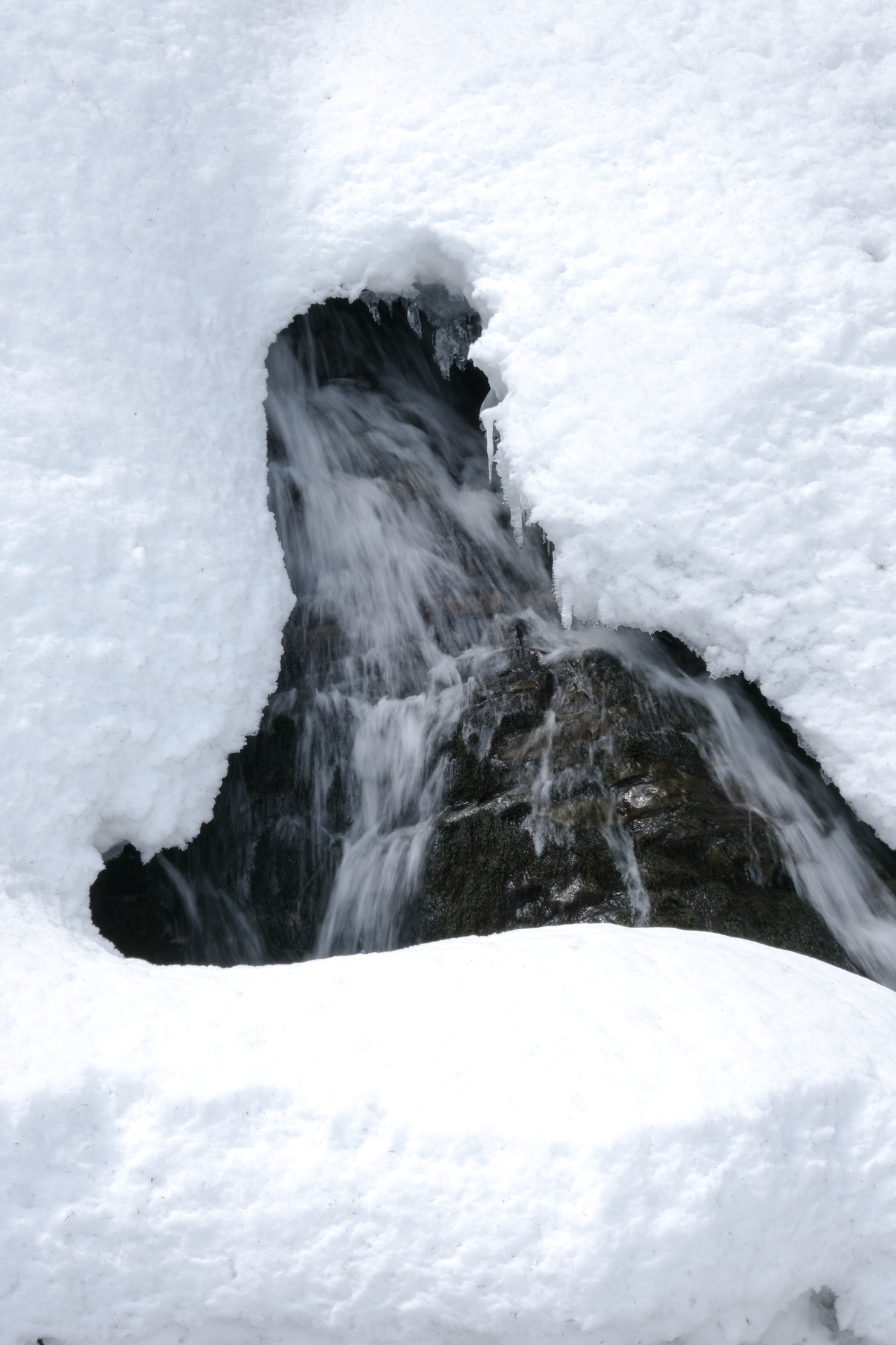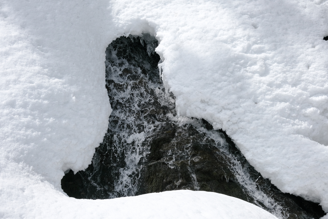 Although the views at this point were already stunning, this was not the final goal, and we didn't waste much time, before crossing the outlet stream (luckily still heavily snow-bridged), and headed into the forest.