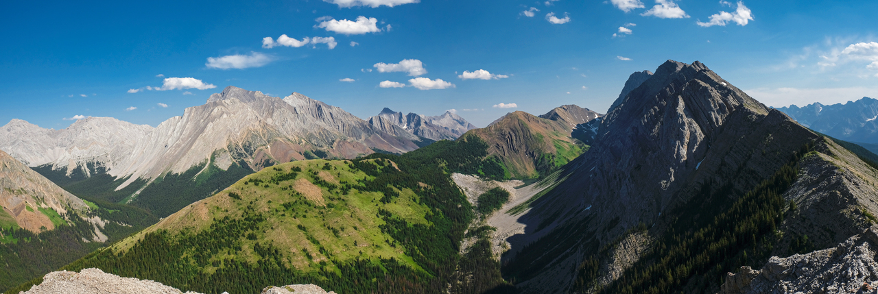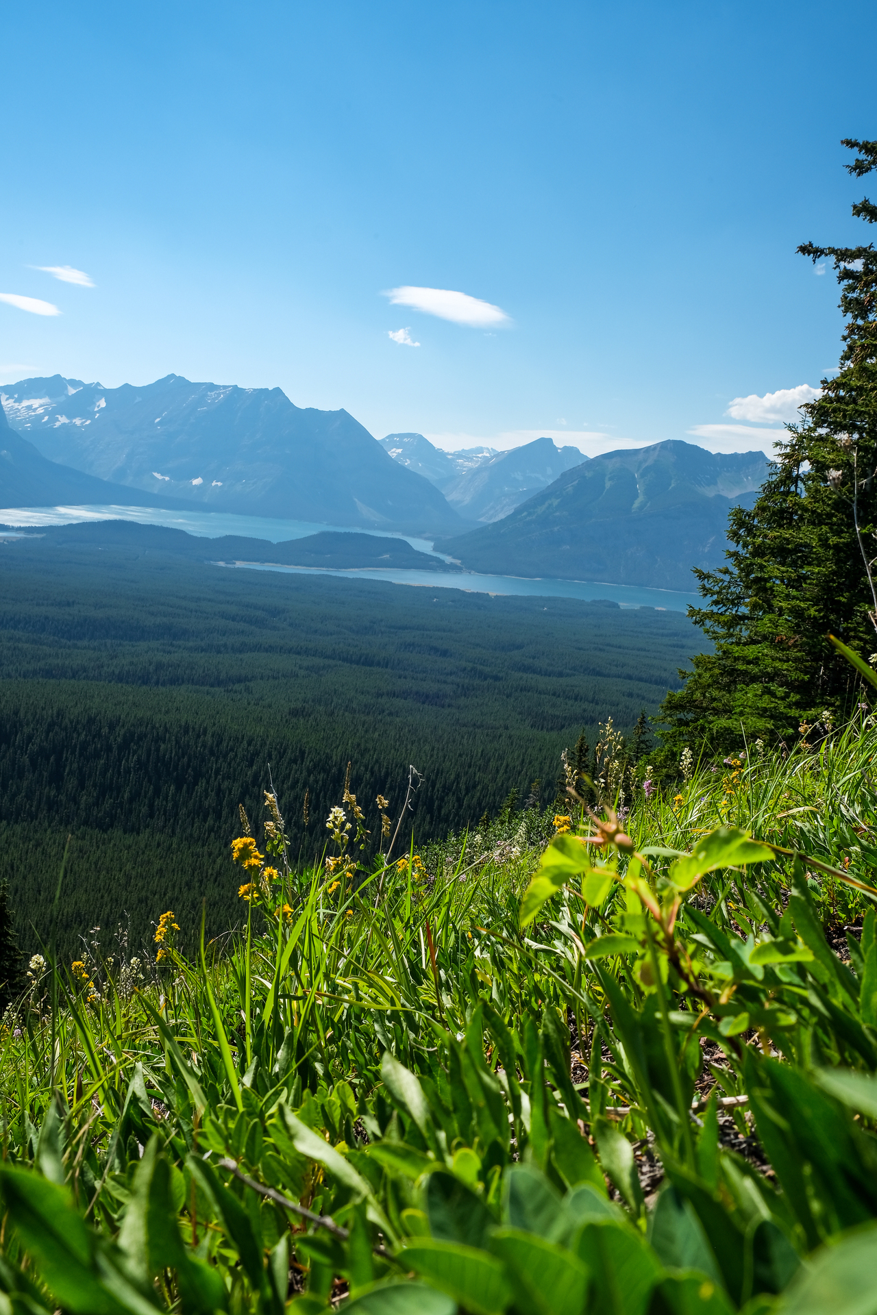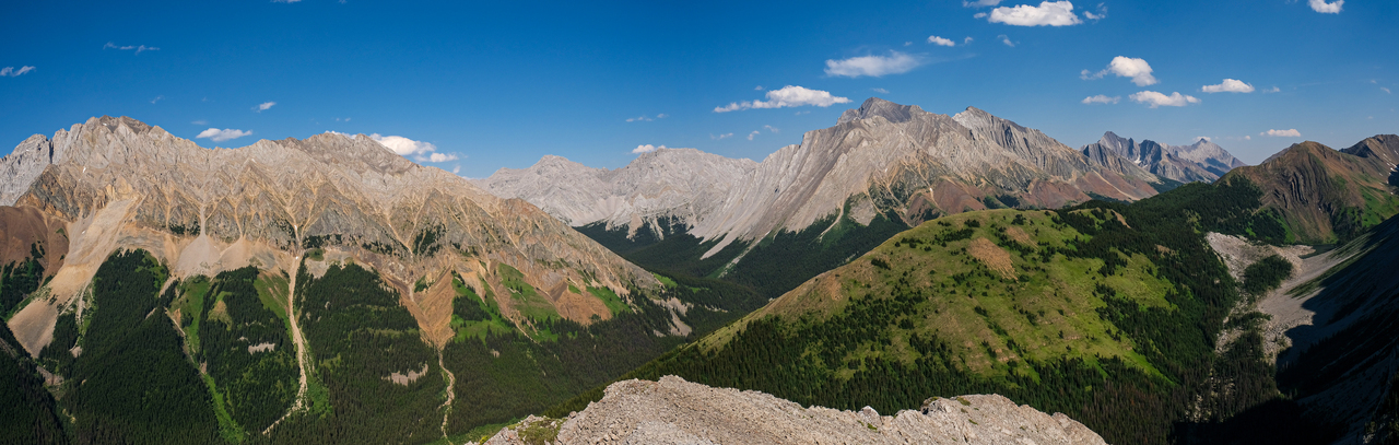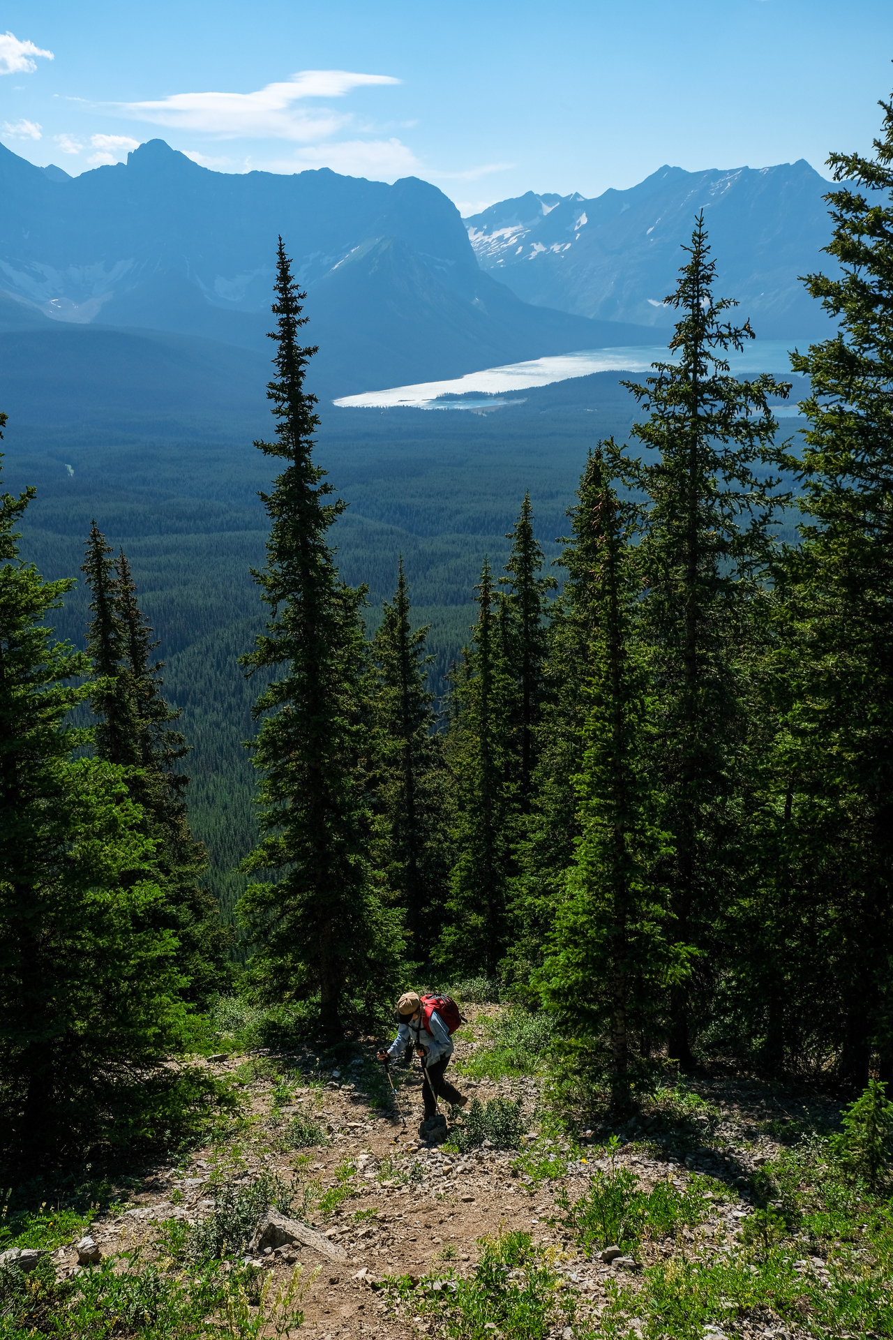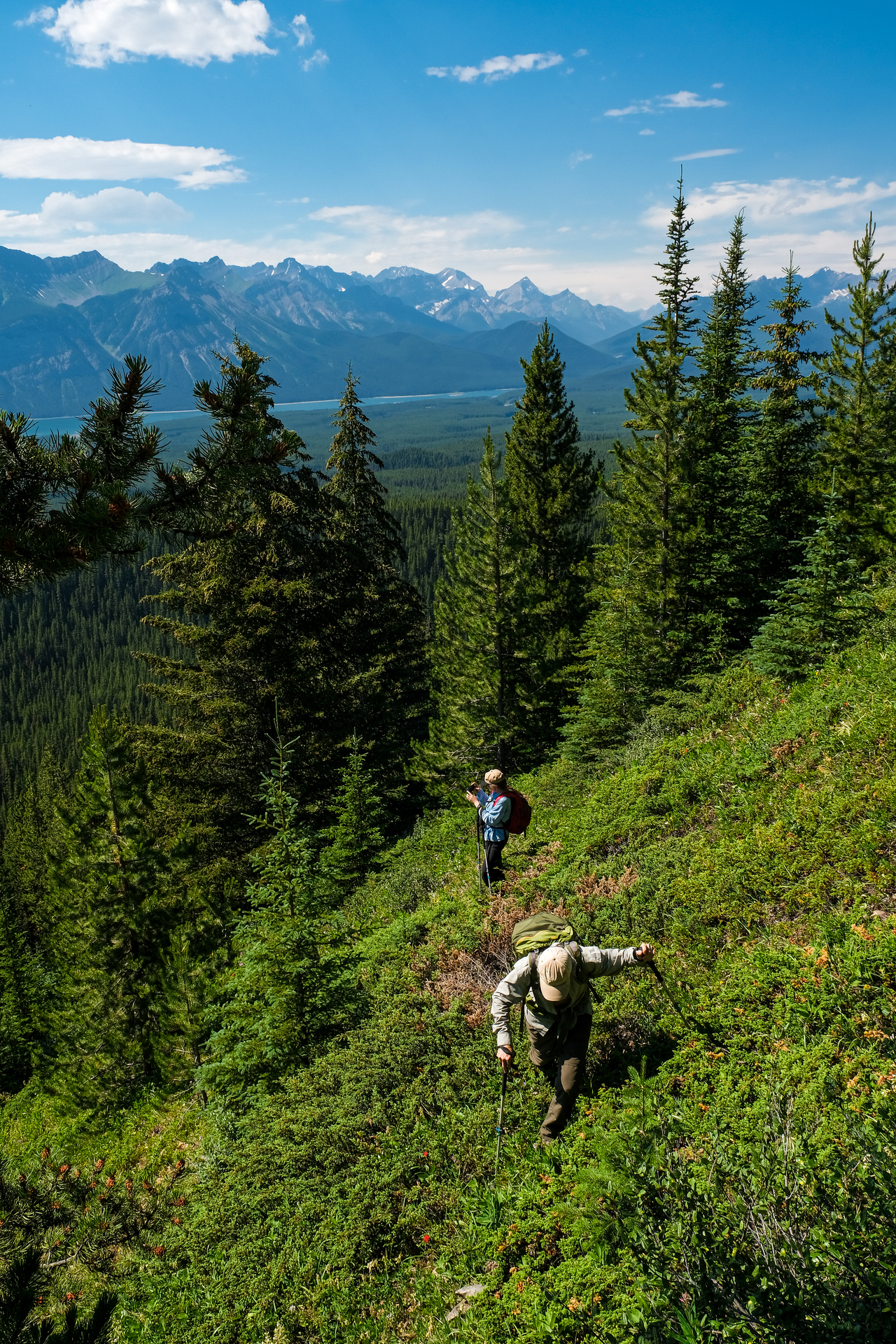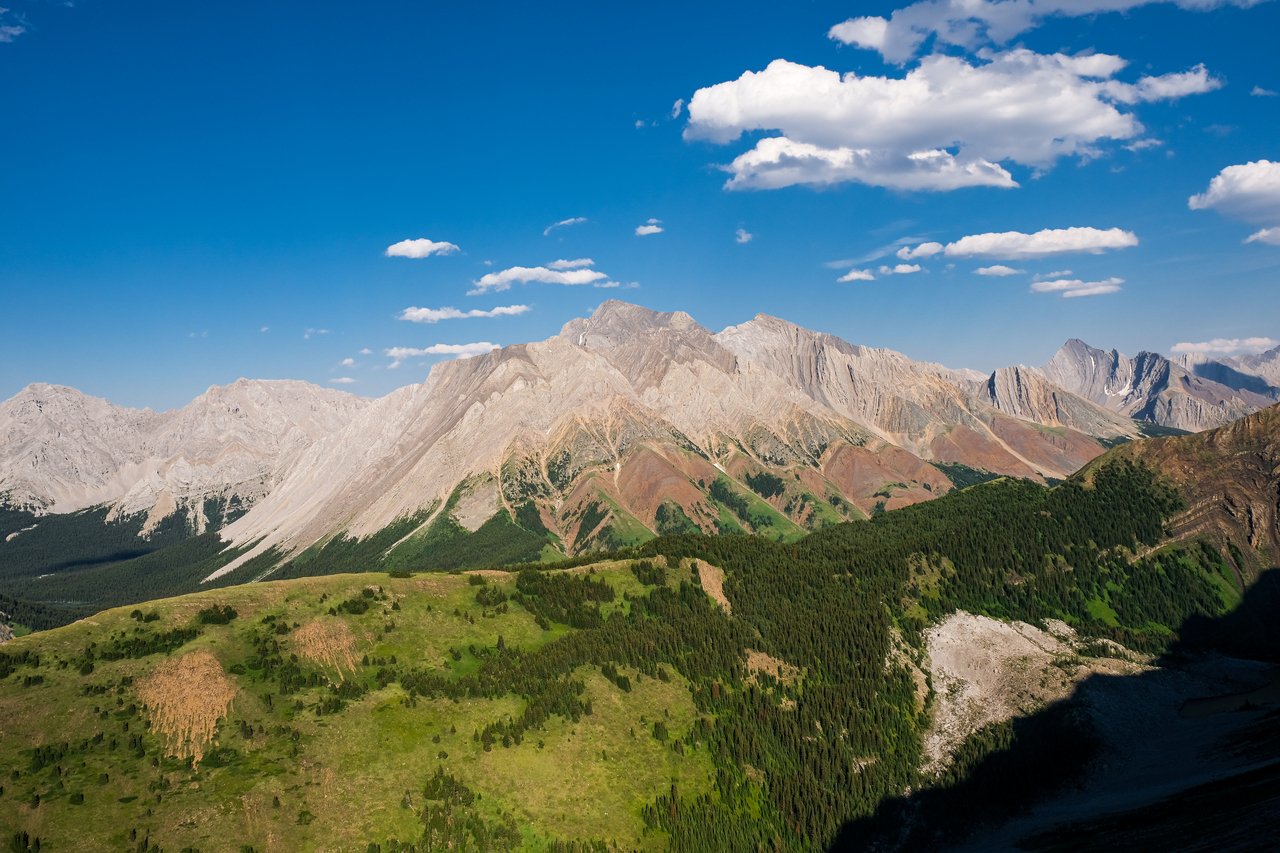 Luckily, we didn't have to endure the steep bush for too long, and soon emerged to open, grassy slopes, where we were rewarded with already impressive (although hazy) views down to Kananaskis Lakes.