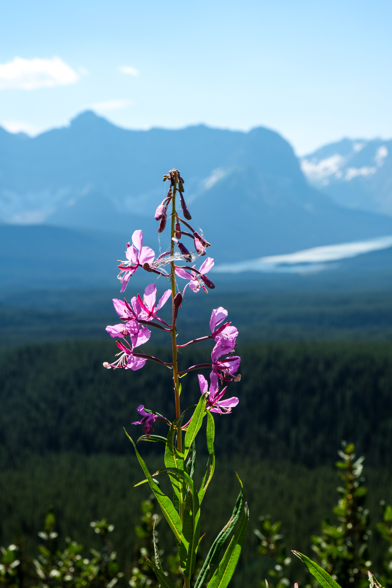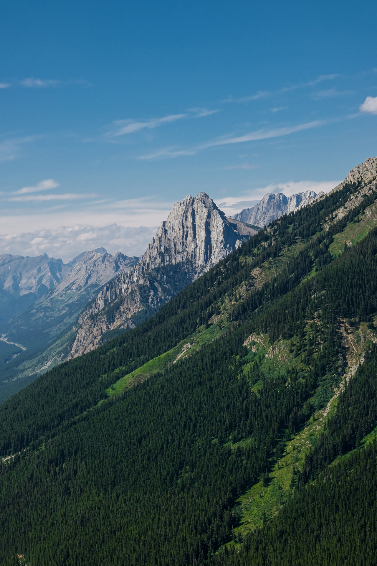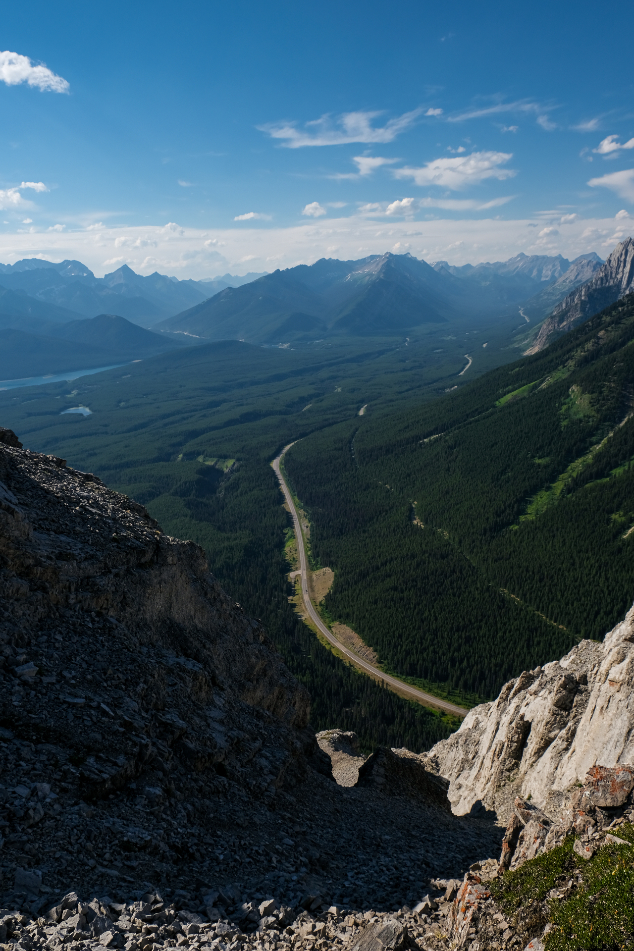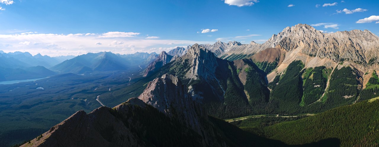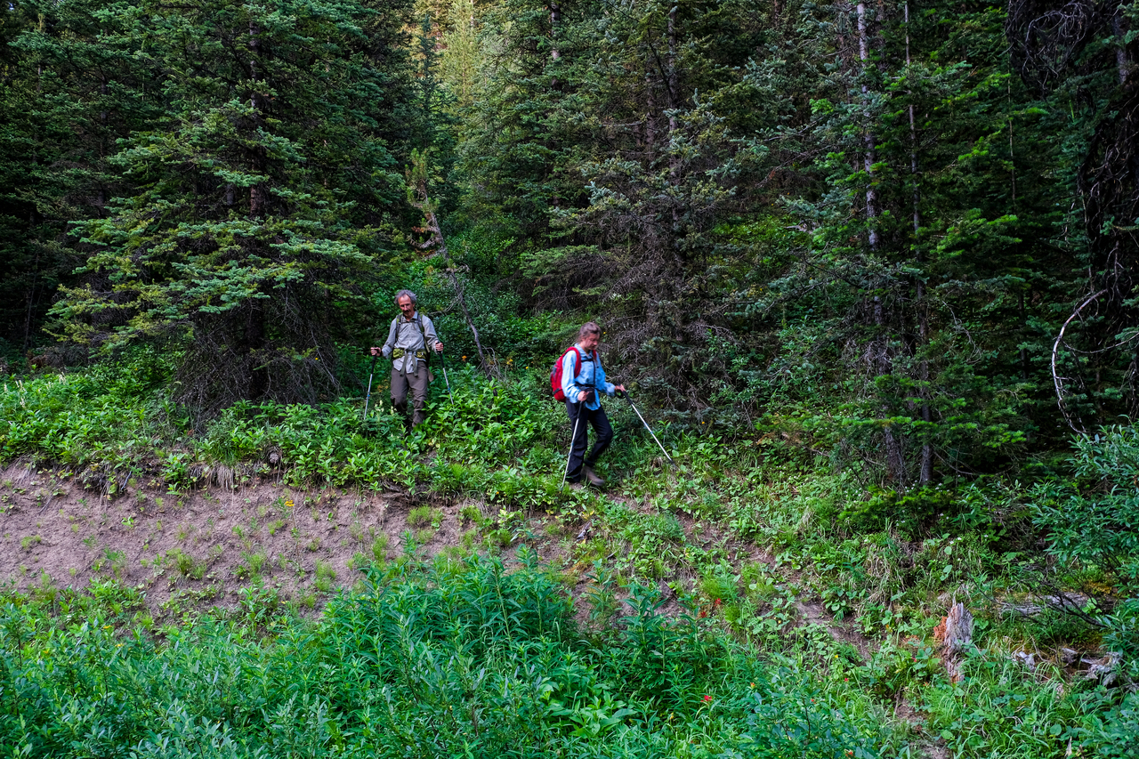 Luckily, we didn't have to endure the steep bush for too long, and soon emerged to open, grassy slopes, where we were rewarded with already impressive (although hazy) views down to Kananaskis Lakes.