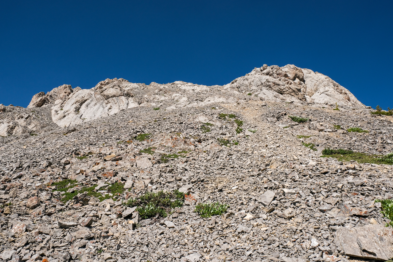 It wasn't long before I neared the high point, looking up the loose scree ramp leading to its summit.