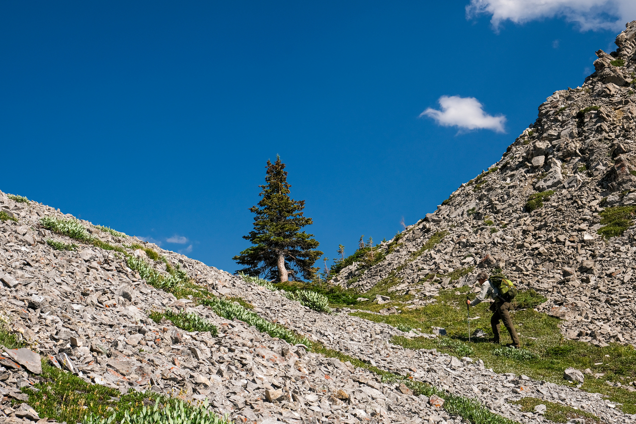 The trail easily took us the rest of the way, and we were soon approaching the unique col with one lone tree.