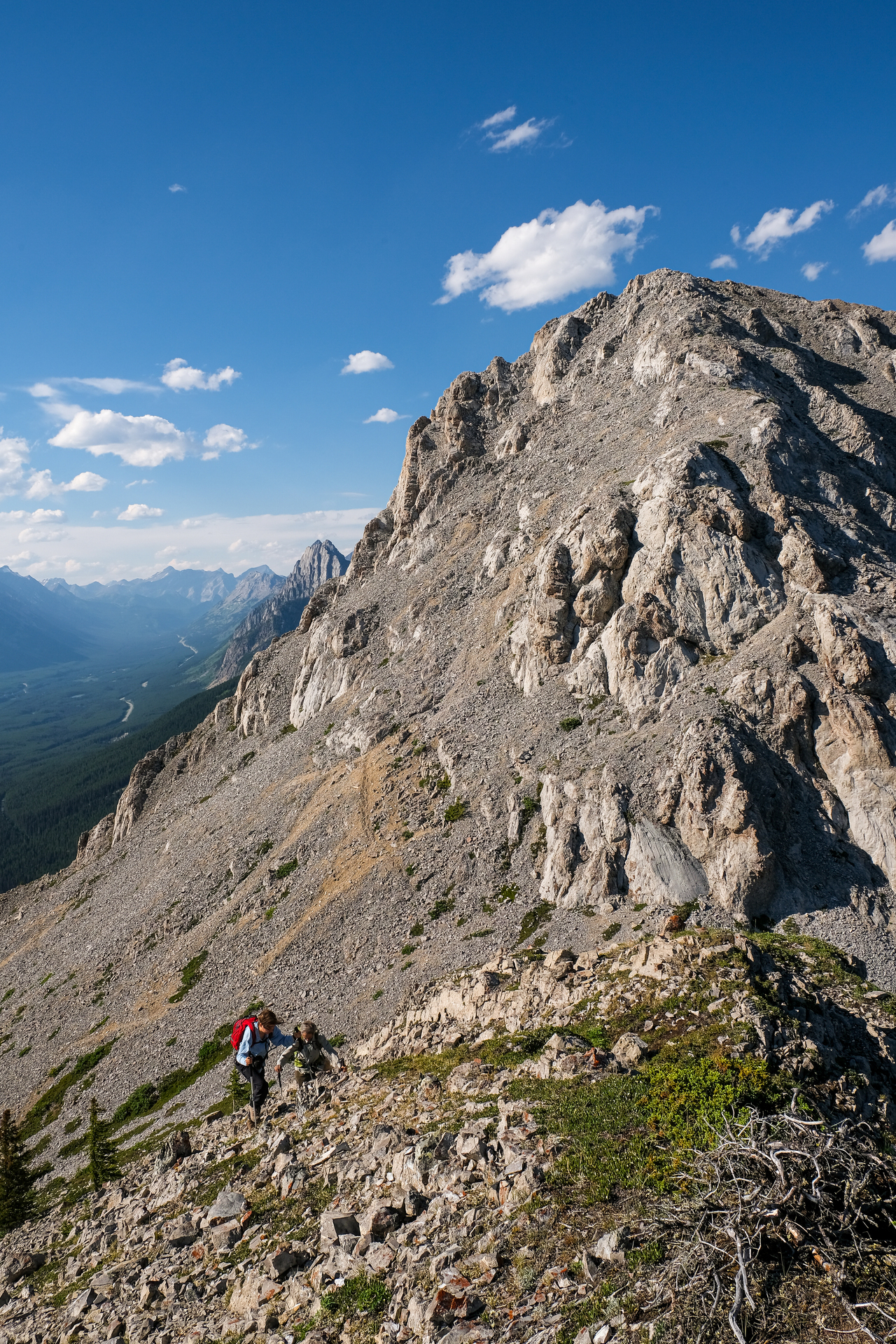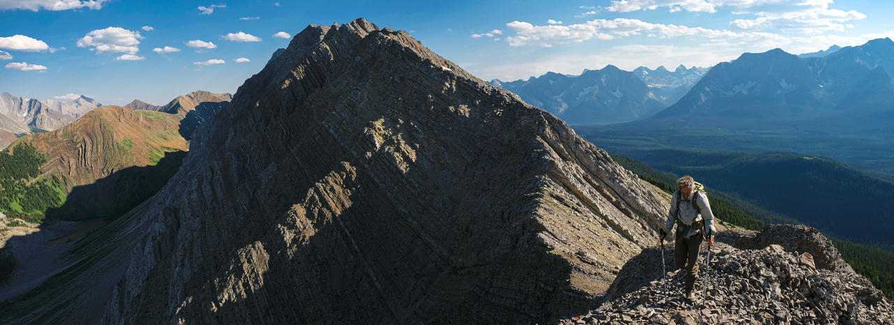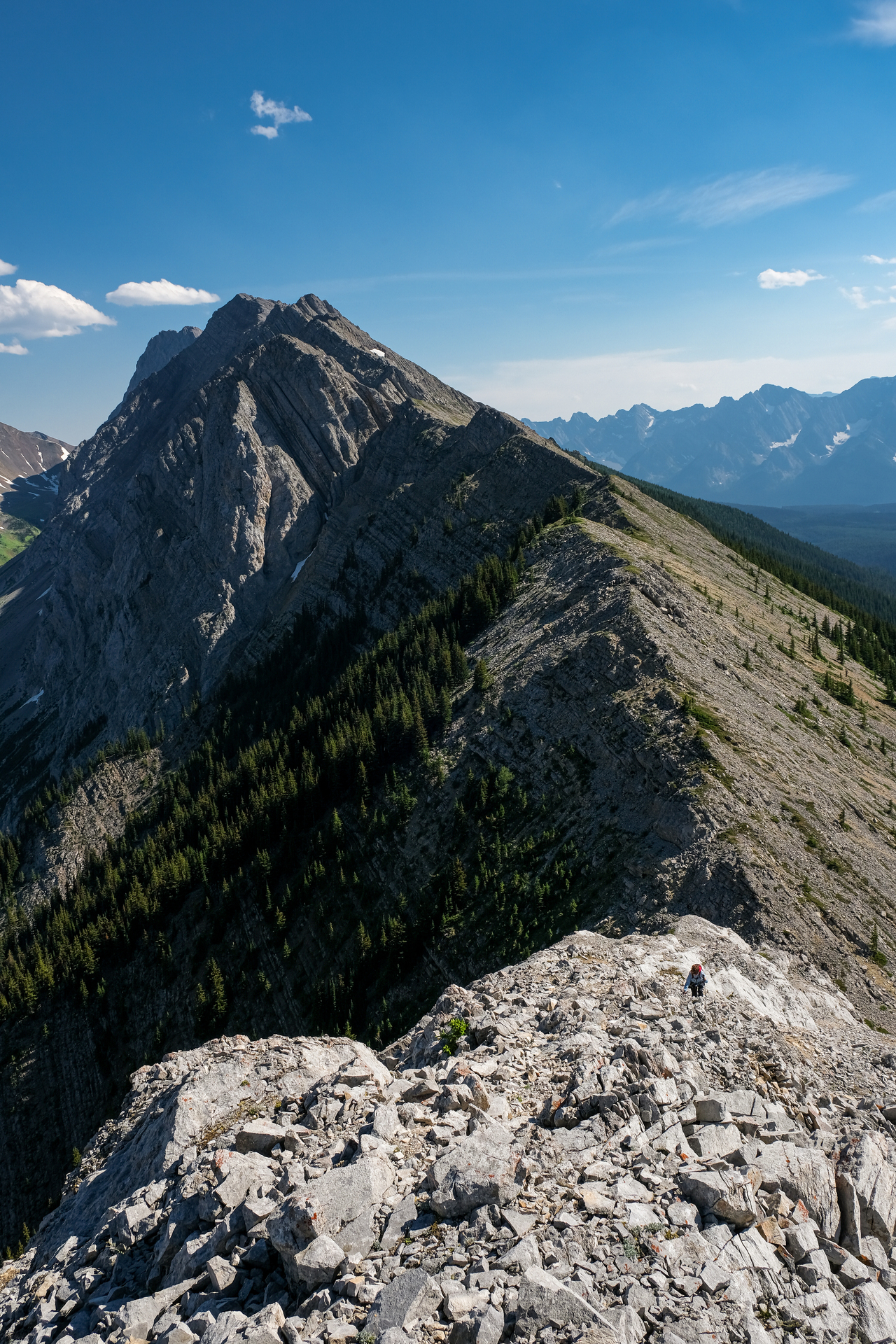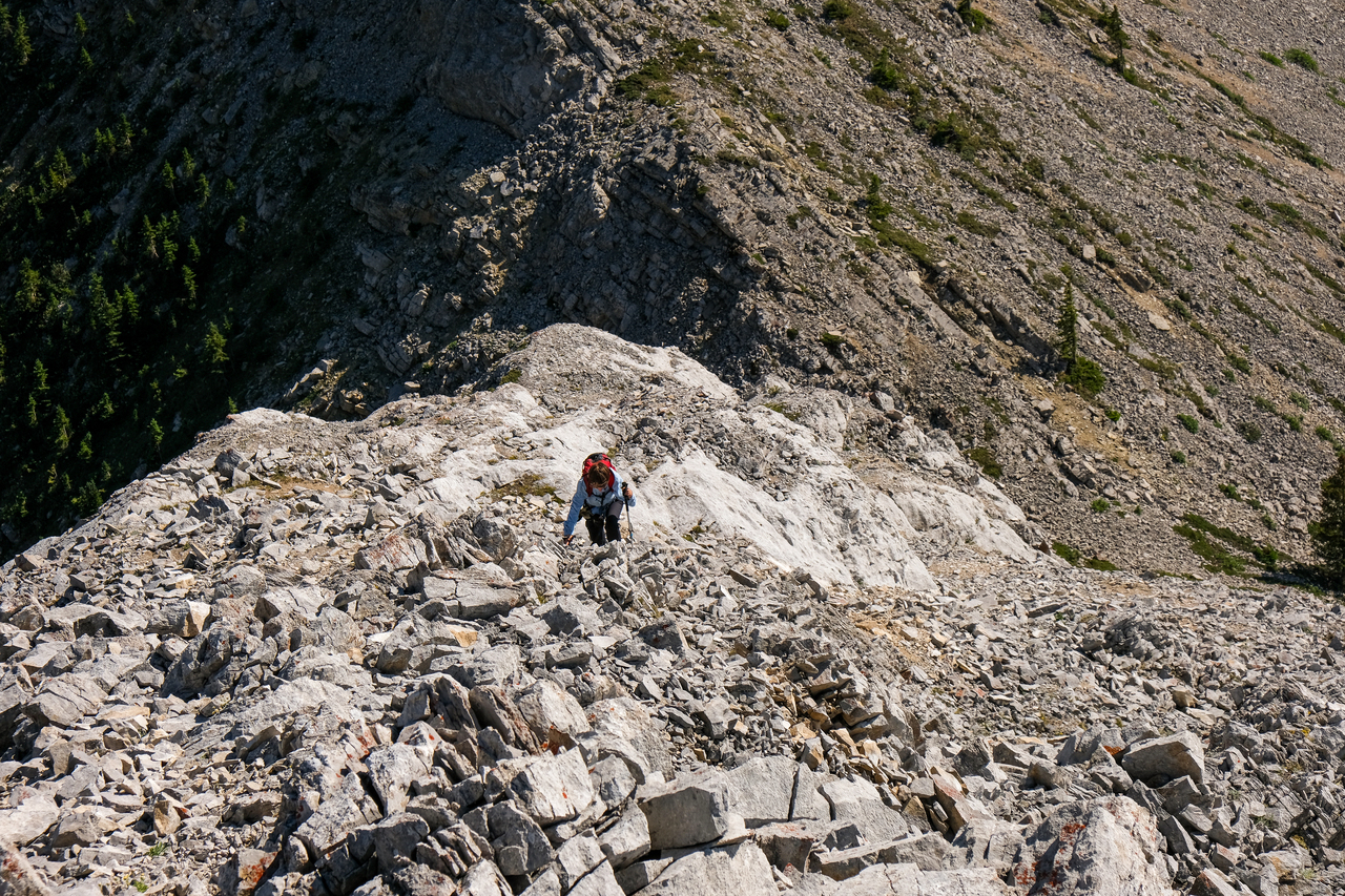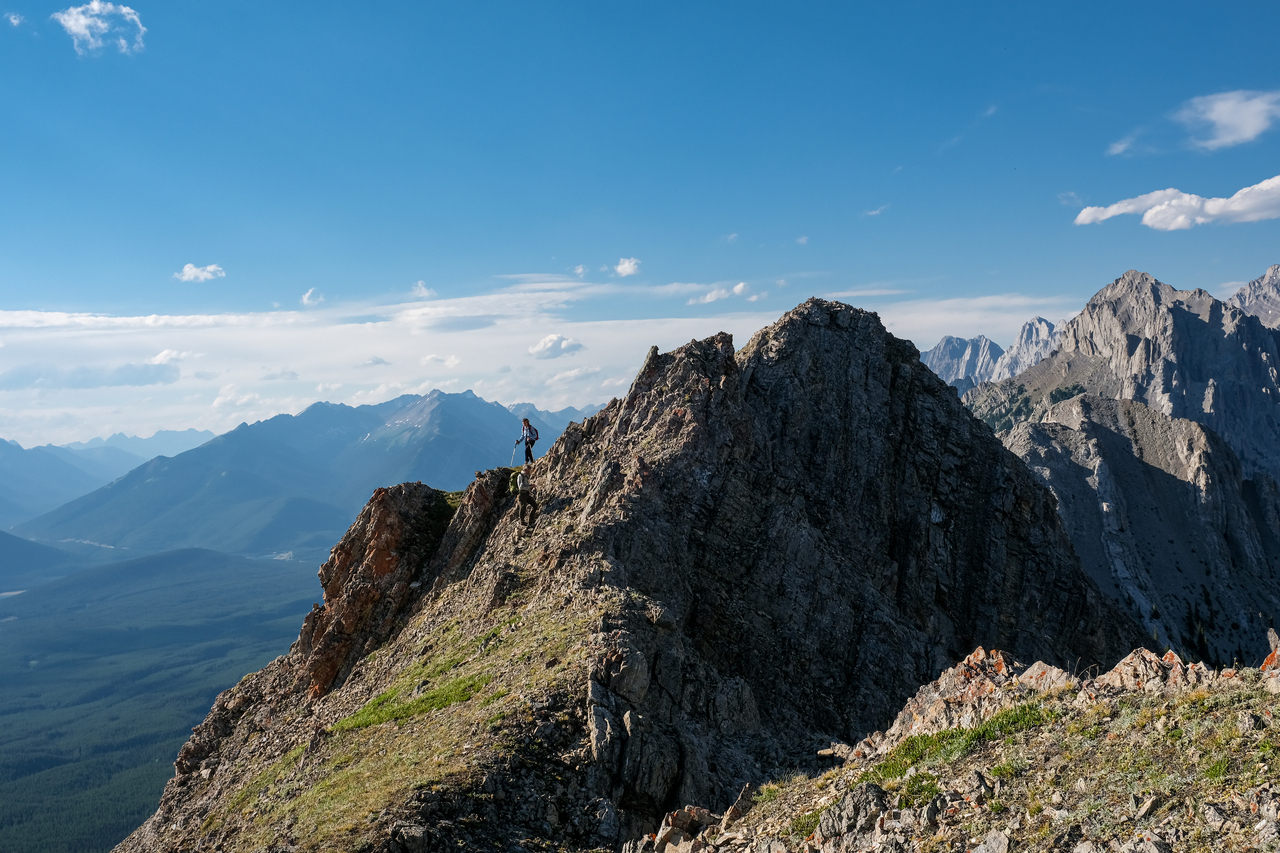 Looking back from the false summit. Kaitlyn ascends below the lengthy connecting ridge to Mount Pocaterra.