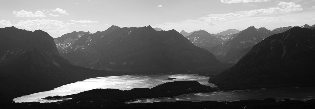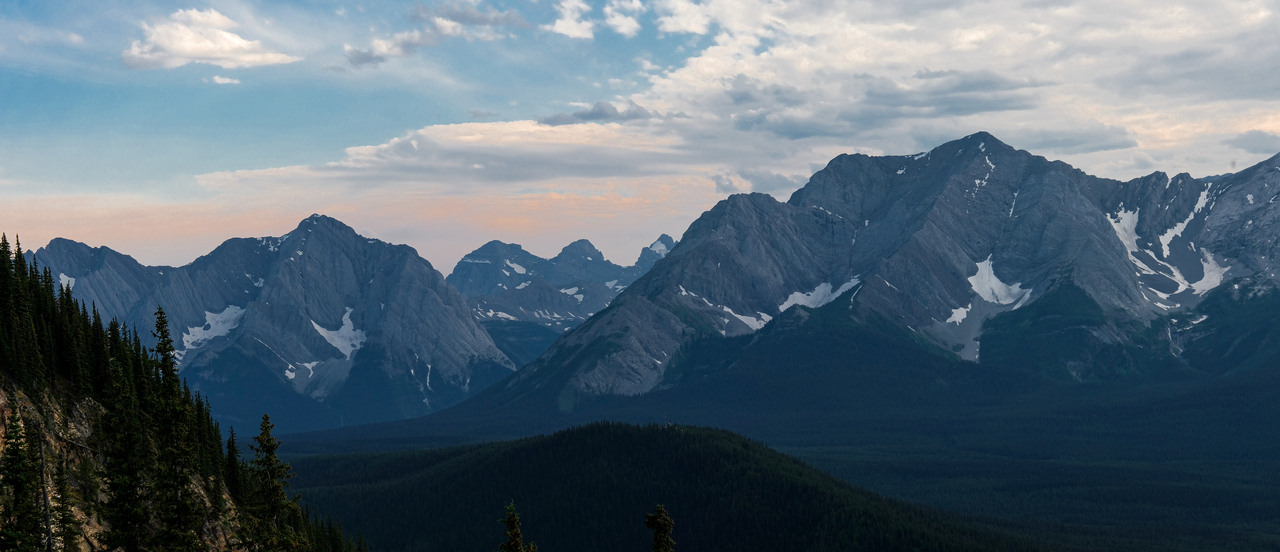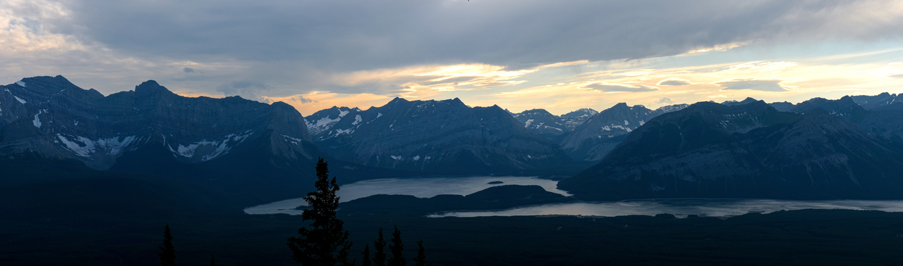 The sun begins to drop below the mountains across Kananaskis Lakes.