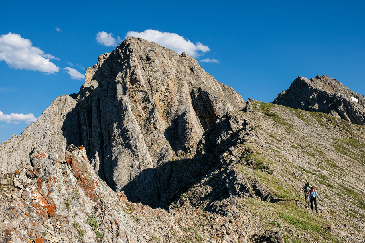 Looking along the impressive east face, as we easily hike up the ridge on the opposite side of the col. The high point we are aiming for rises center.