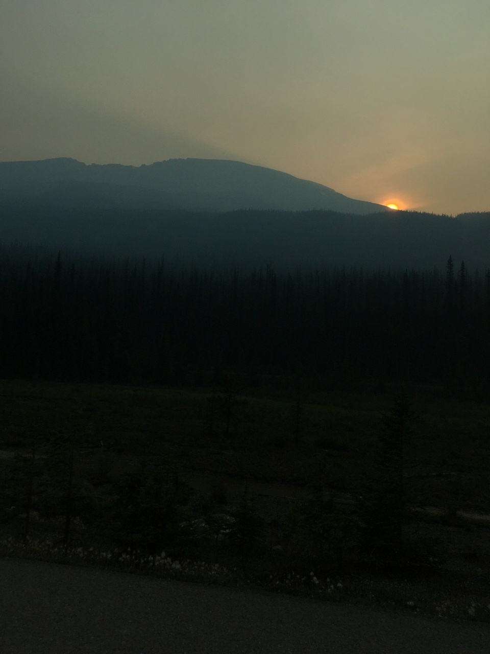 Eerie sunrise over smokey Sunwapta Peak as we drive down the Icefields Parkway towards Jasper!