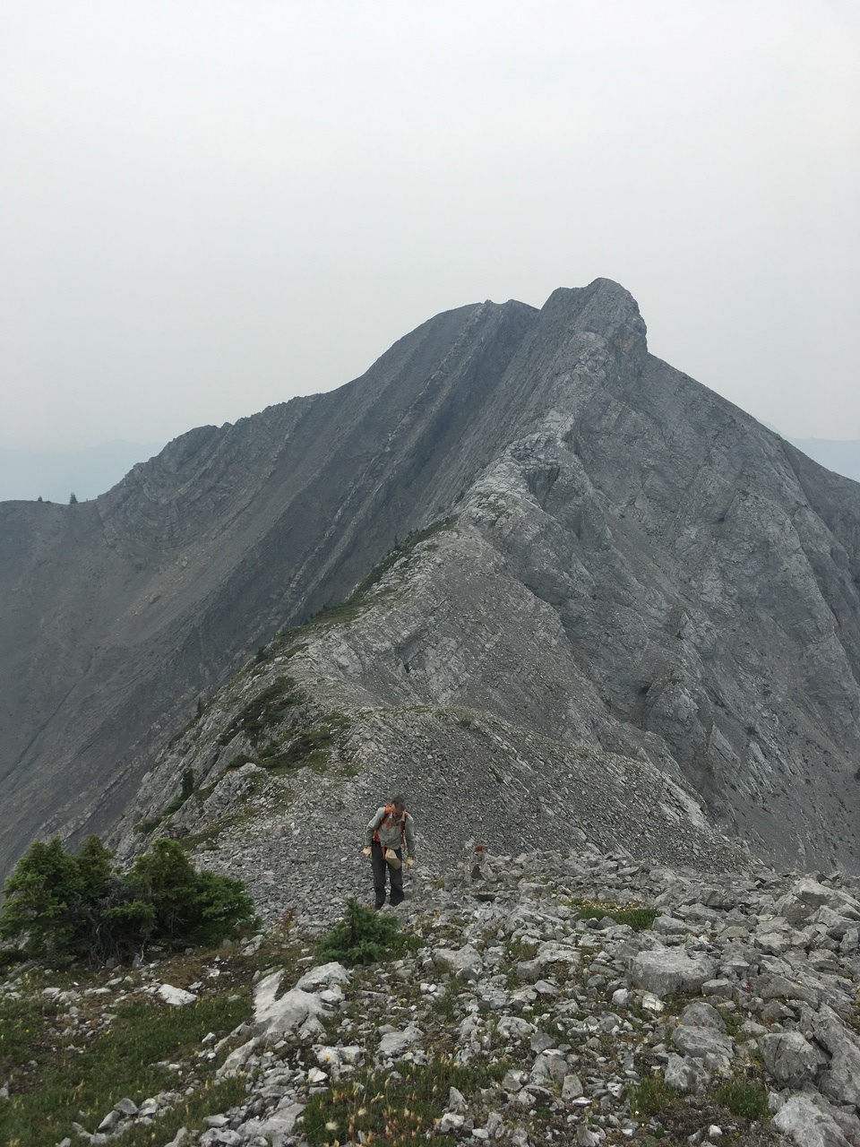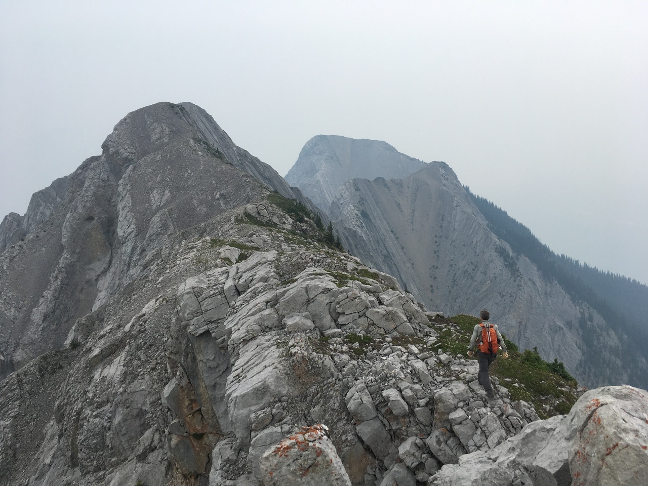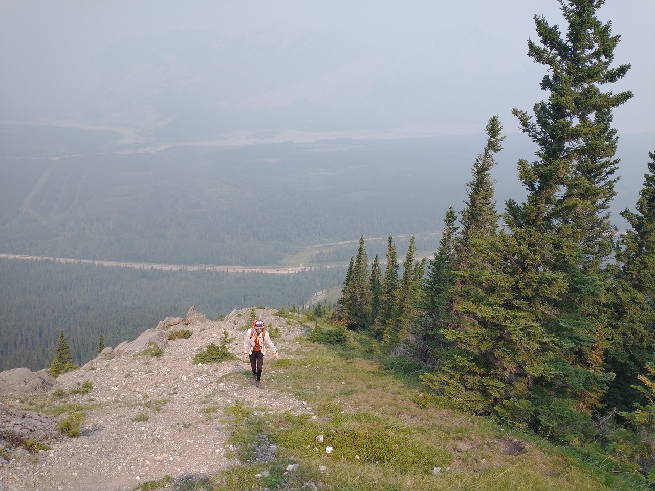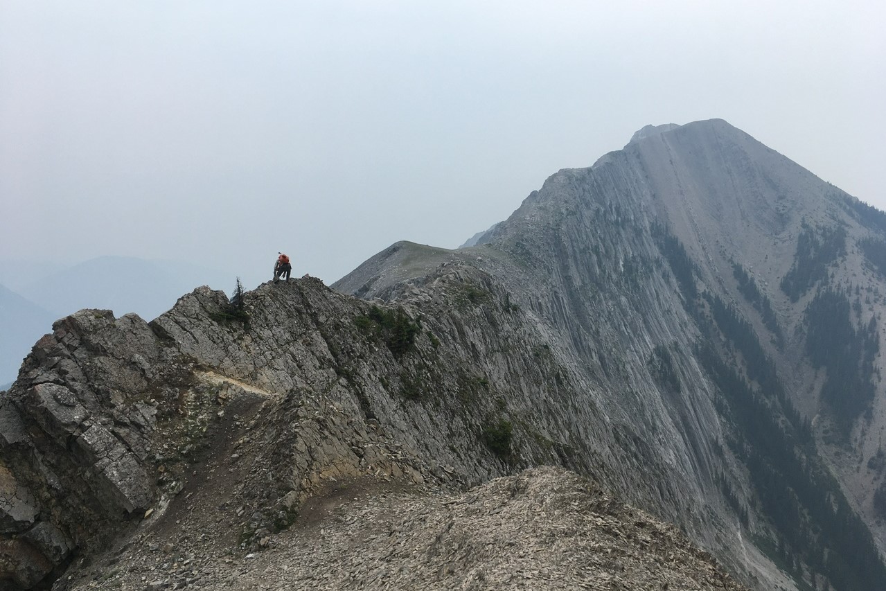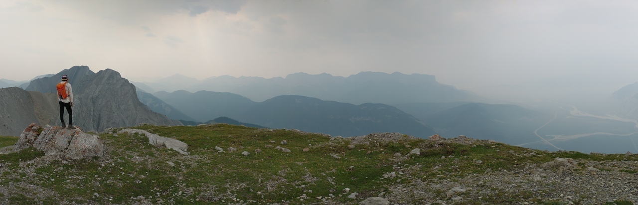 After waking up to smoke even thicker than what we experienced on Nigel Peak the day before, my original thought was that scrambling a peak would be a total waste! The smoke had just rolled in the day prior however, and we didn't know where it came from, so we decided to drive down the parkway towards Jasper, and hope the air quality might improve...Nope! Smoke was just as bad as we drove through Jasper, but knowing me with my "elevation addiction" as my dad calls it, I didn't want to miss out on bagging another summit while I was in the mountains! I frantically flipped through Kane's Scrambles, looking for an option where not being able to see anything wouldn't be the end of the world. I came across Roche à Perdrix, and hoped I could scramble Roche Miette in the future (on a clear day), for a similar view, to see what I missed. Little did I know that my modest goals of simply bagging a summit on this smokey day would grow into a whole ridge walk with some interesting route finding!