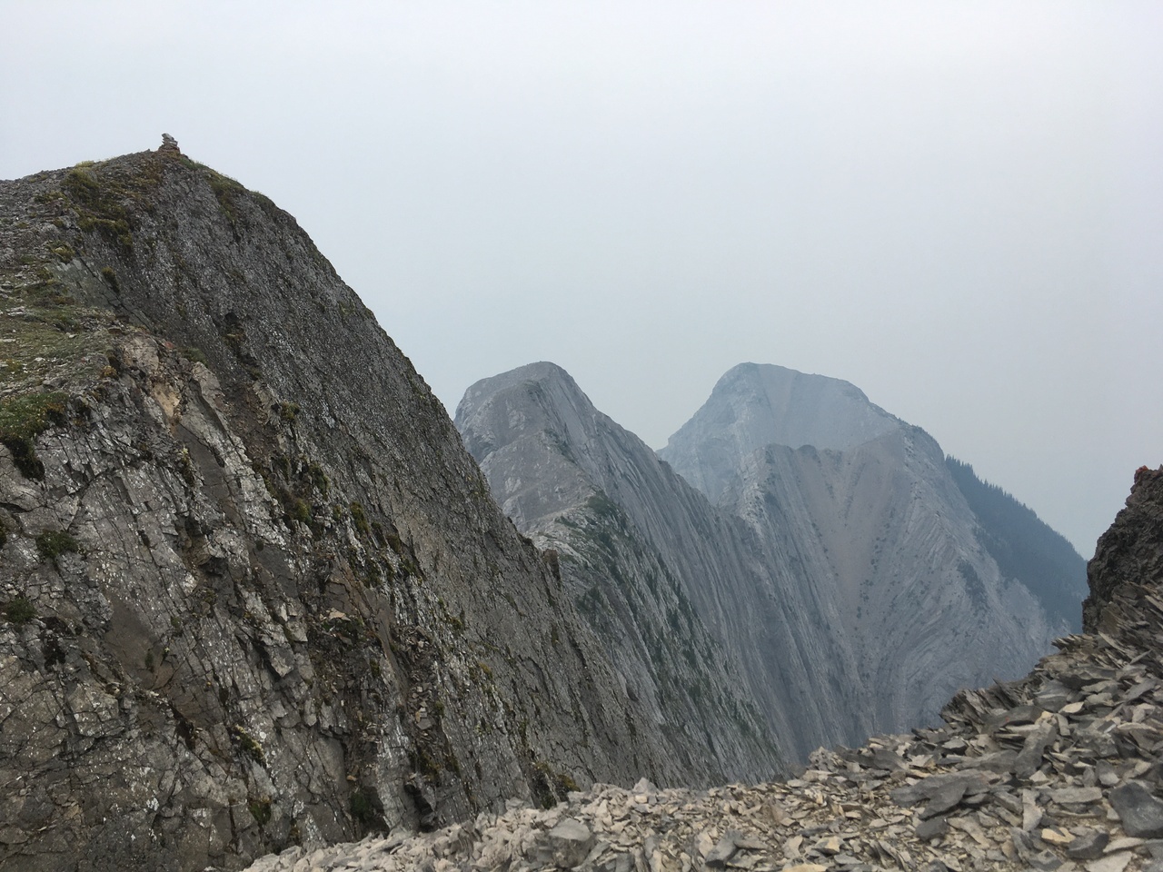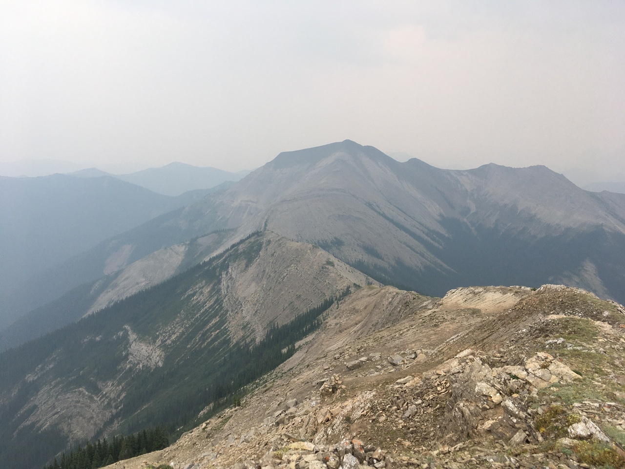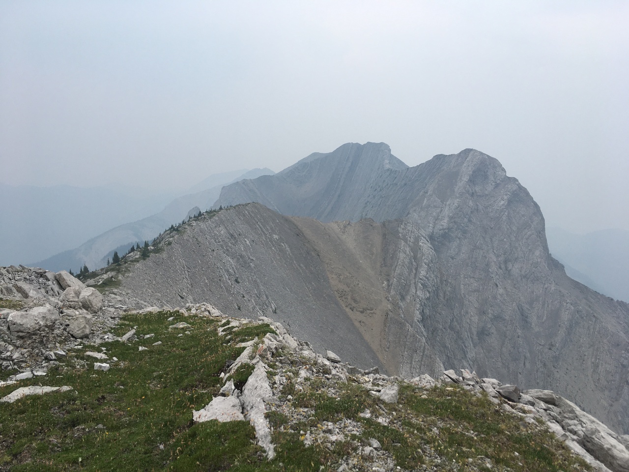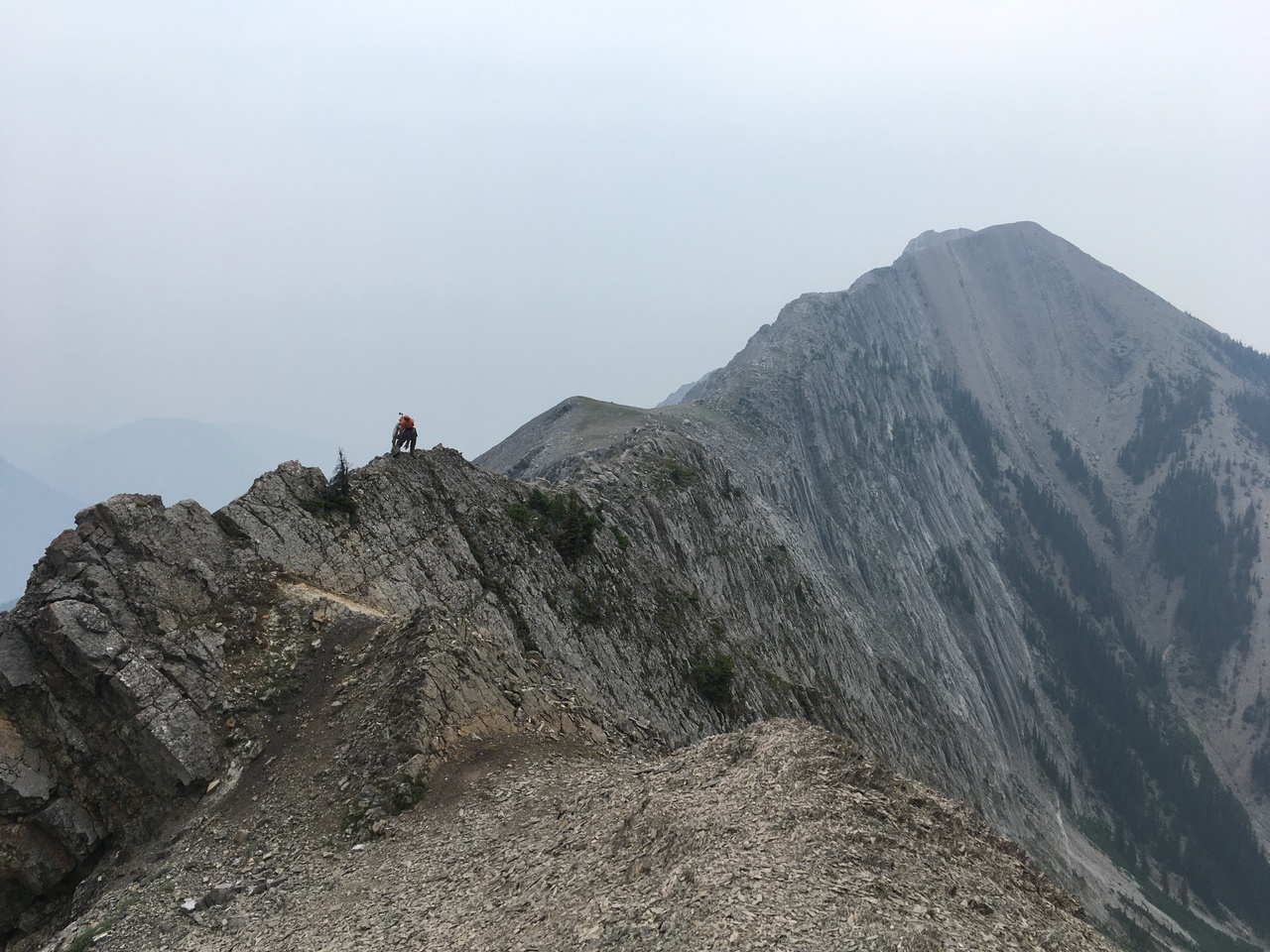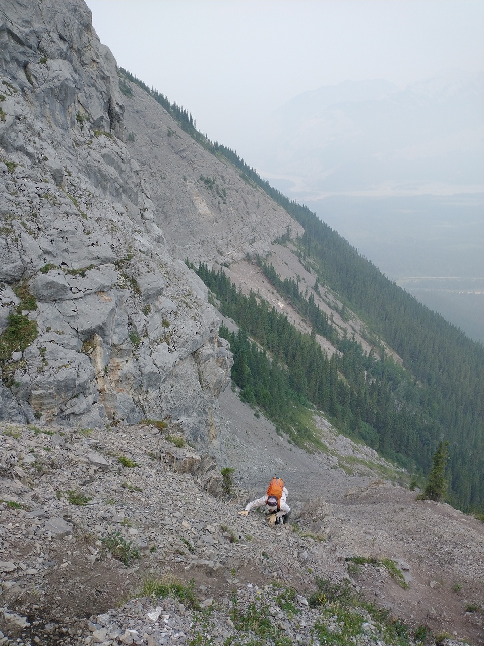 After waking up to smoke even thicker than what we experienced on Nigel Peak the day before, my original thought was that scrambling a peak would be a total waste! The smoke had just rolled in the day prior however, and we didn't know where it came from, so we decided to drive down the parkway towards Jasper, and hope the air quality might improve...Nope! Smoke was just as bad as we drove through Jasper, but knowing me with my "elevation addiction" as my dad calls it, I didn't want to miss out on bagging another summit while I was in the mountains! I frantically flipped through Kane's Scrambles, looking for an option where not being able to see anything wouldn't be the end of the world. I came across Roche à Perdrix, and hoped I could scramble Roche Miette in the future (on a clear day), for a similar view, to see what I missed. Little did I know that my modest goals of simply bagging a summit on this smokey day would grow into a whole ridge walk with some interesting route finding!