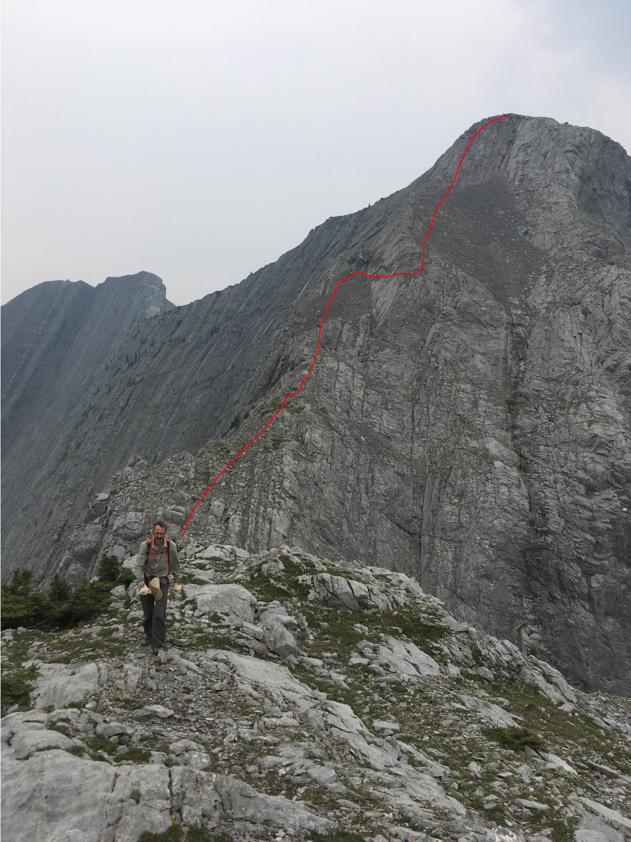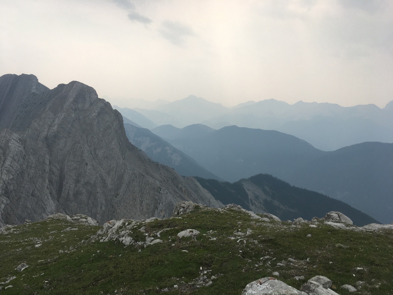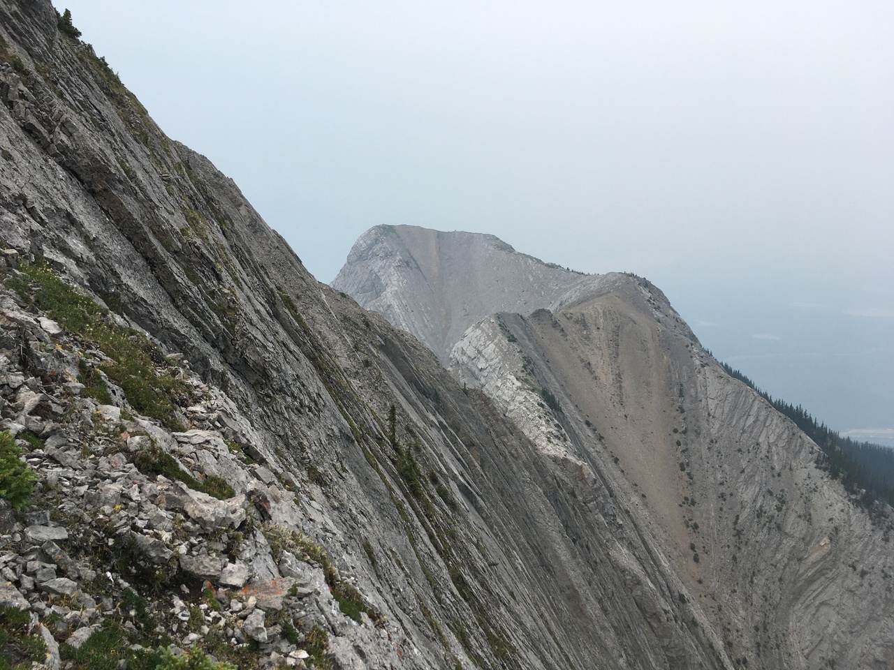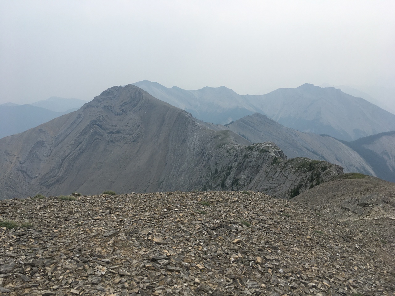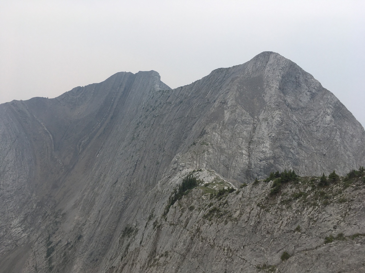 After waking up to smoke even thicker than what we experienced on Nigel Peak the day before, my original thought was that scrambling a peak would be a total waste! The smoke had just rolled in the day prior however, and we didn't know where it came from, so we decided to drive down the parkway towards Jasper, and hope the air quality might improve...Nope! Smoke was just as bad as we drove through Jasper, but knowing me with my "elevation addiction" as my dad calls it, I didn't want to miss out on bagging another summit while I was in the mountains! I frantically flipped through Kane's Scrambles, looking for an option where not being able to see anything wouldn't be the end of the world. I came across Roche à Perdrix, and hoped I could scramble Roche Miette in the future (on a clear day), for a similar view, to see what I missed. Little did I know that my modest goals of simply bagging a summit on this smokey day would grow into a whole ridge walk with some interesting route finding!