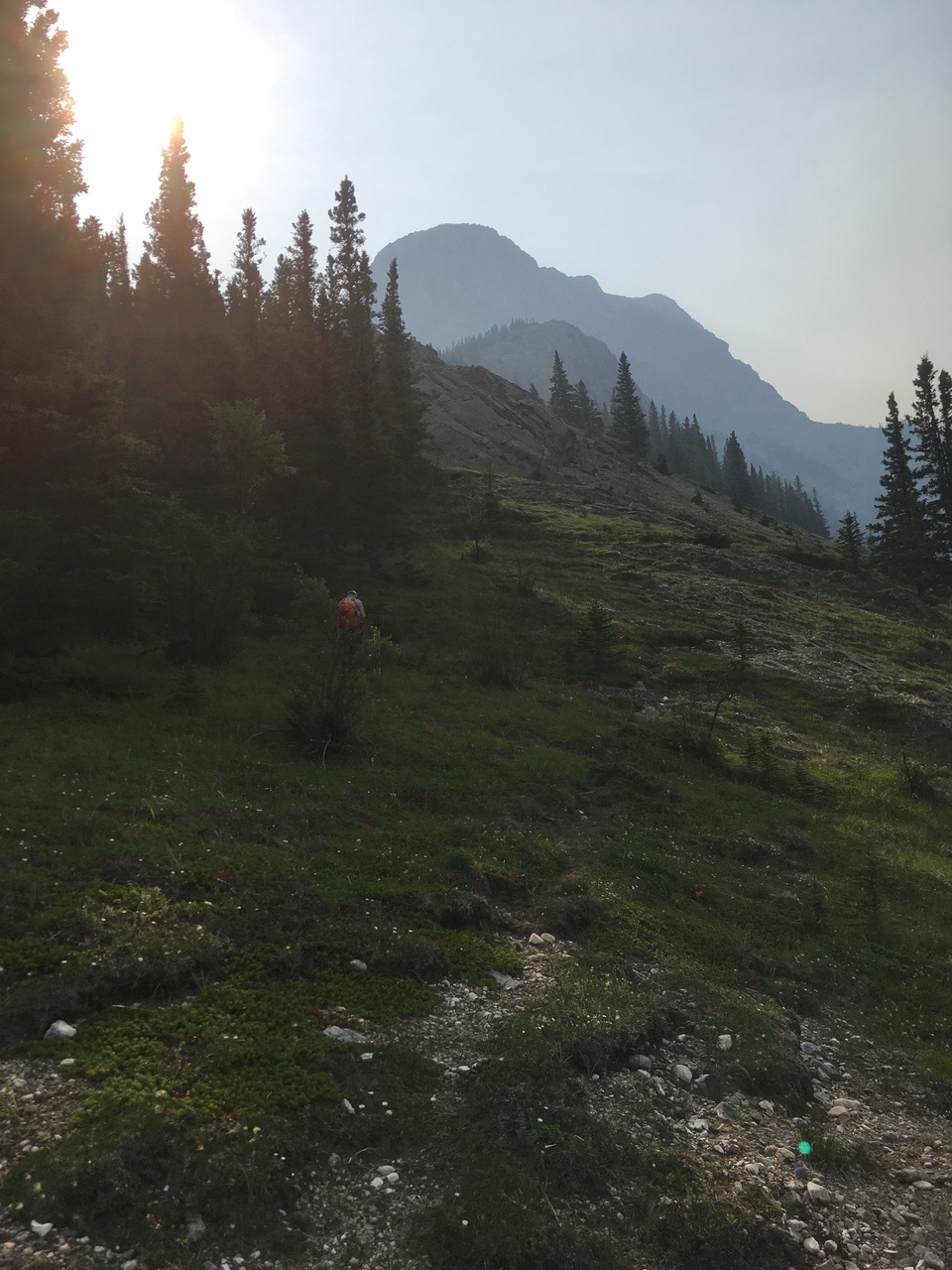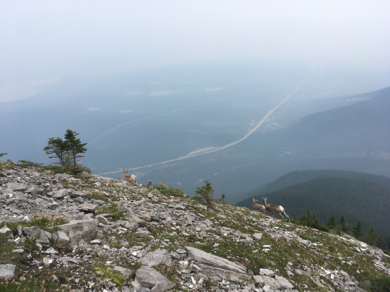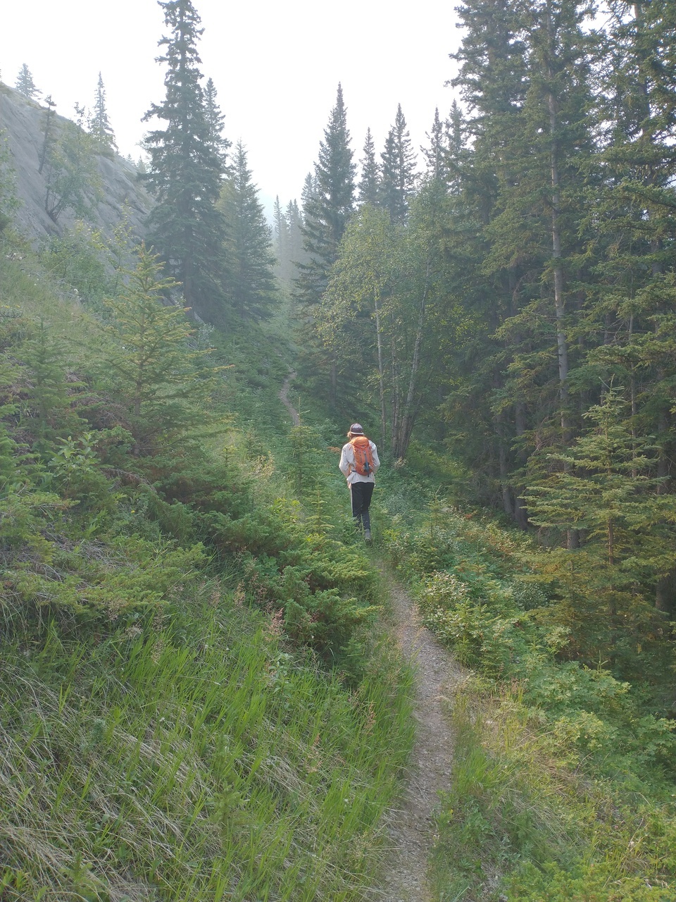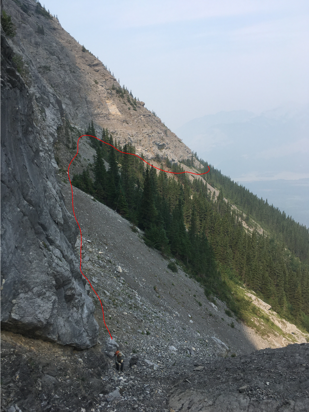 After waking up to smoke even thicker than what we experienced on Nigel Peak the day before, my original thought was that scrambling a peak would be a total waste! The smoke had just rolled in the day prior however, and we didn't know where it came from, so we decided to drive down the parkway towards Jasper, and hope the air quality might improve...Nope! Smoke was just as bad as we drove through Jasper, but knowing me with my "elevation addiction" as my dad calls it, I didn't want to miss out on bagging another summit while I was in the mountains! I frantically flipped through Kane's Scrambles, looking for an option where not being able to see anything wouldn't be the end of the world. I came across Roche à Perdrix, and hoped I could scramble Roche Miette in the future (on a clear day), for a similar view, to see what I missed. Little did I know that my modest goals of simply bagging a summit on this smokey day would grow into a whole ridge walk with some interesting route finding!