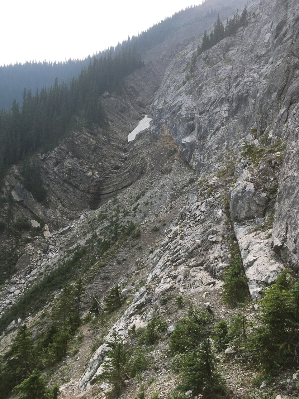 We continued along the cliffs on a trail that would cross the gully ahead, and continue up in the trees on the left side.