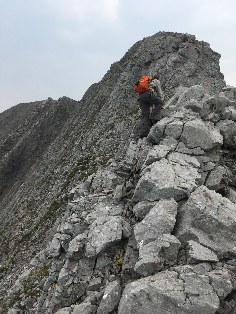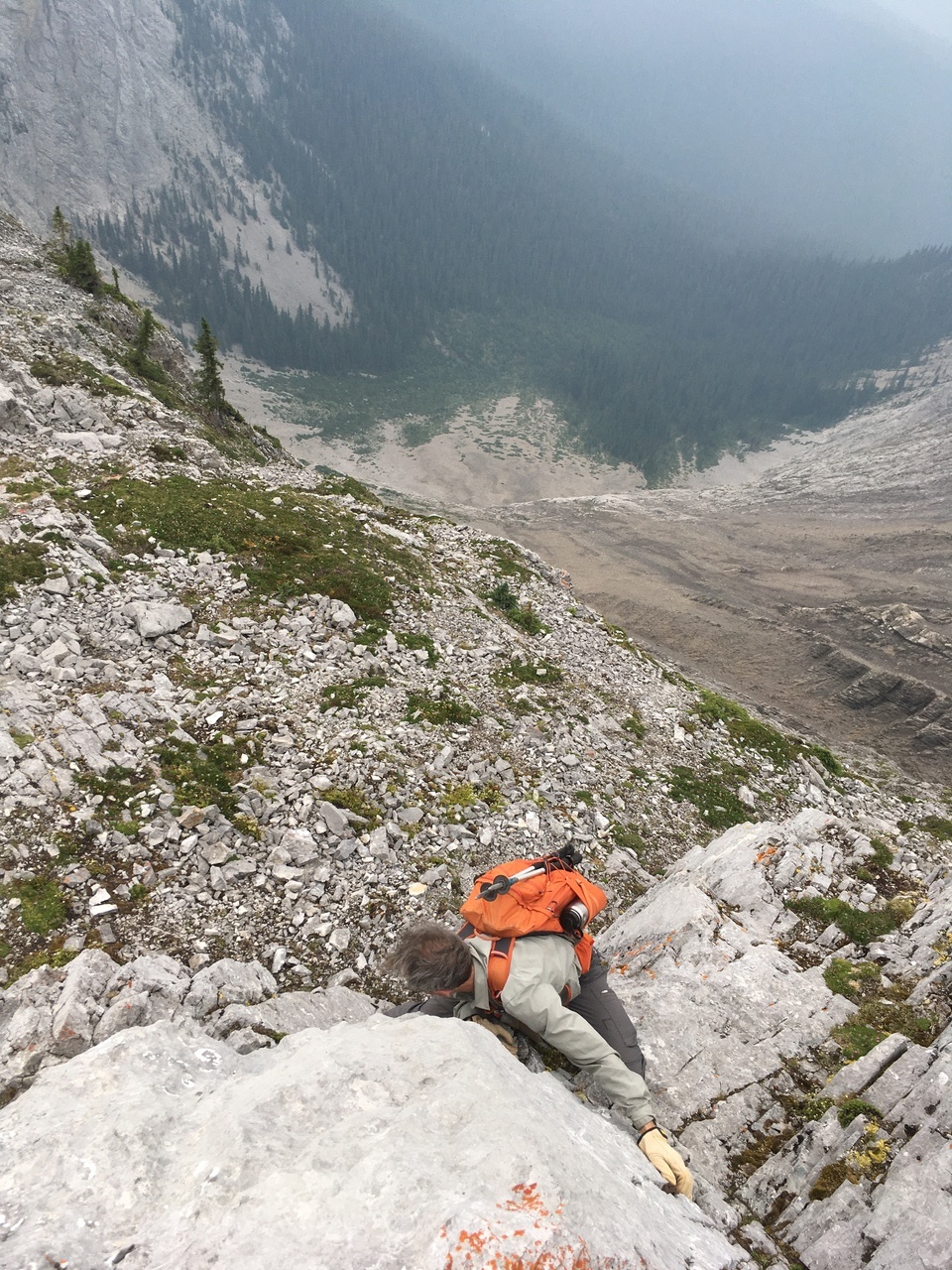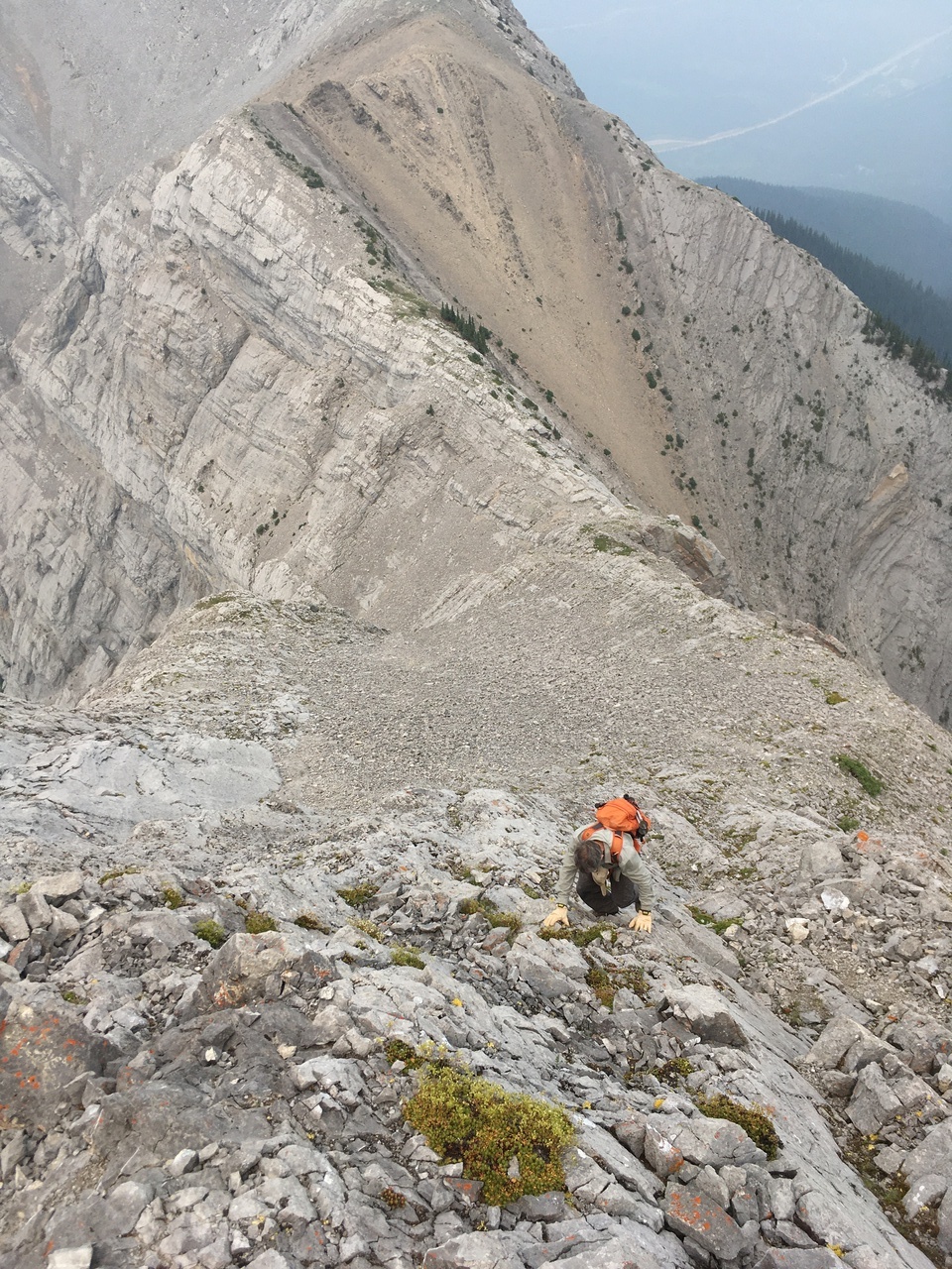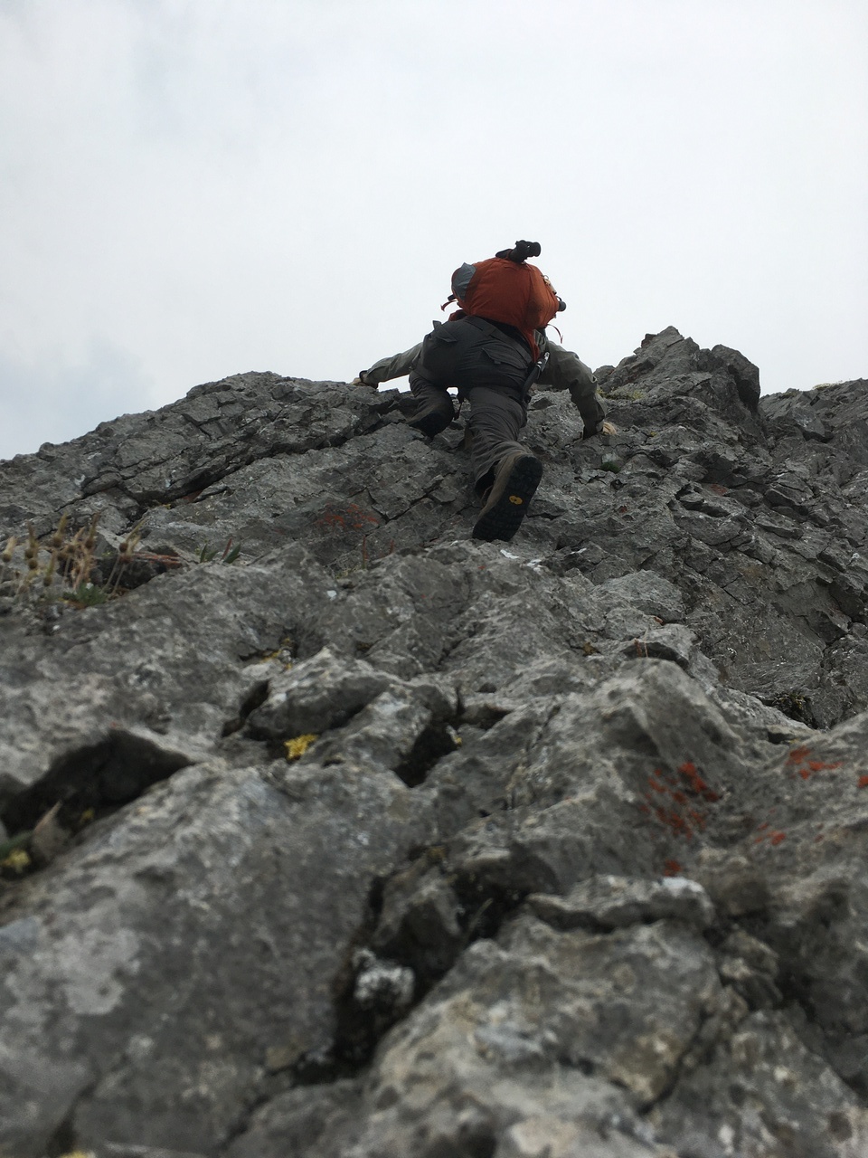 My dad climbing up the seriously exposed left side of the ridge! I gotta say my heart was racing as I stood at the top, watching him climb this horrific slope! This route started off okay near the bottom (not quite as steep or exposed) but that quickly changed! The slope steepened, and the long drop to the valley opened up below us! It would be one thing if we were on solid rock, but it was a mixture of dirt, moss, and rock, and holds were downsloping and would often pull out! Testing every hold was crucial, and there was no margin for error! If planning on doing this scramble, I strongly recommend taking the ridge crest, and don't even allow this route to be an option!