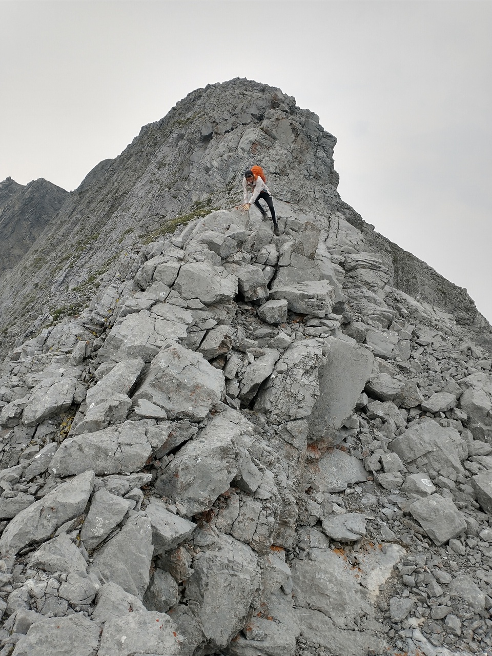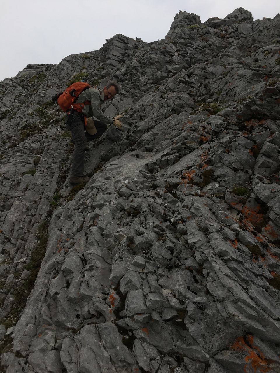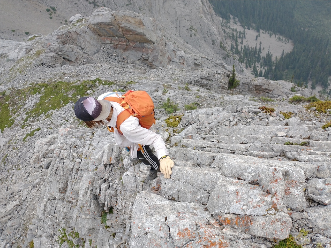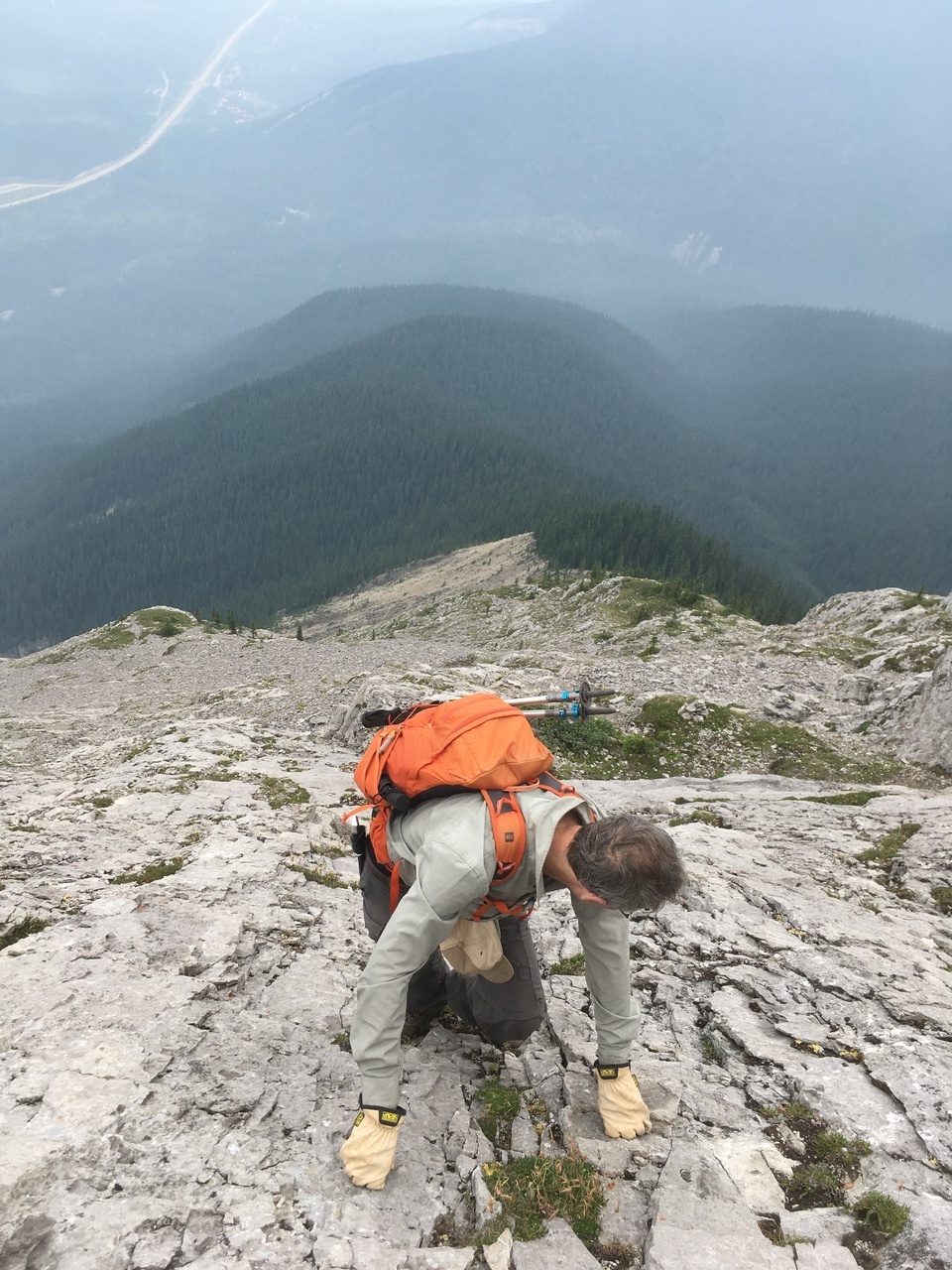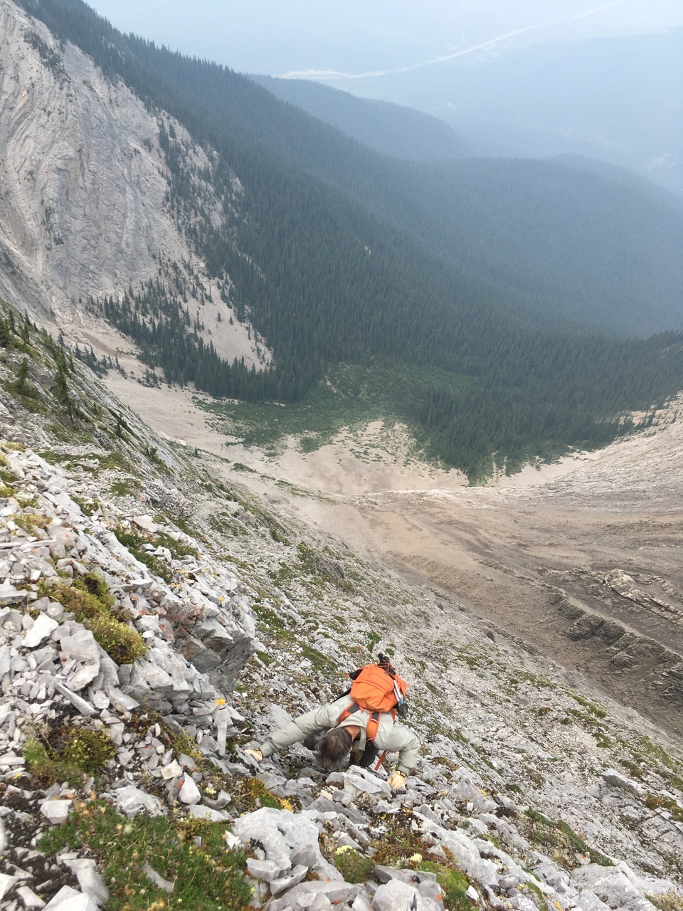 My dad climbing up the seriously exposed left side of the ridge! I gotta say my heart was racing as I stood at the top, watching him climb this horrific slope! This route started off okay near the bottom (not quite as steep or exposed) but that quickly changed! The slope steepened, and the long drop to the valley opened up below us! It would be one thing if we were on solid rock, but it was a mixture of dirt, moss, and rock, and holds were downsloping and would often pull out! Testing every hold was crucial, and there was no margin for error! If planning on doing this scramble, I strongly recommend taking the ridge crest, and don't even allow this route to be an option!
