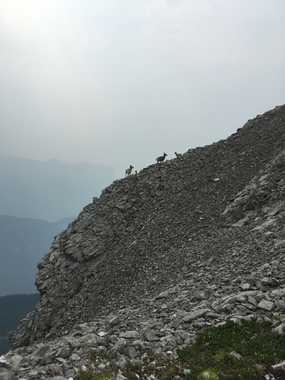 After crossing the next gully, we followed its opposite ridge (this one much longer and up tiresome scree), eventually reaching a small plateau that Kane refers to as a good place to "reap the scenic rewards of your toil thus far"...or not. From here, the slope angles up to the right, towards the summit! Just when you think the summit is within reach, a herd of Bighorn Sheep stare down at you from above and decide it would be fun to send rocks barrelling down towards you! They sure were reluctant to make way for us, standing their ground as if guarding the summit, but we tried to make it clear that we came in peace, and eventually navigated our way past them.