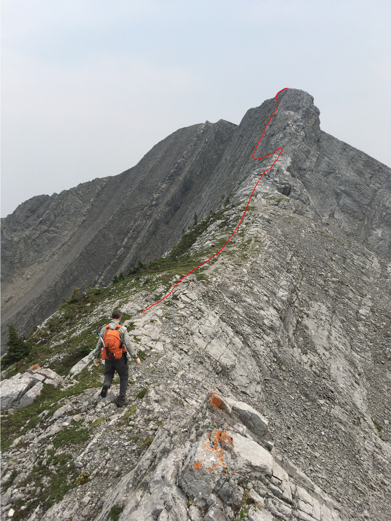 Approaching the second highpoint, with the approx. route we would end up taking! Use this as an example of what not to do!! We would descend the ridge crest on return, where there was one awkward, difficult step, but at least it's solid and not exposed!