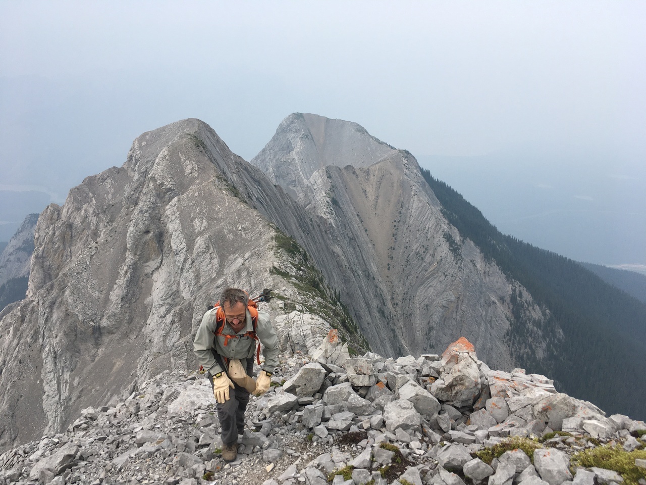 My dad checking out the crux! We wanted to avoid the route we took up if at all possible, and easily descended the ridge crest until we reached this step, which we had analyzed on our ascent. My dad is holding the solid hand hold with his left hand, and has to swing down, around this rock, to a step below. This was not an easy task with no in-between foot holds! I dropped down to the platform he is on, and found a small foothold (that the climber can't see while pressed against the rock). I helped guide his foot to it, and from that position, it was much easier to step down to the platform below. From below, he then helped guide my foot, and we were back to easy terrain!