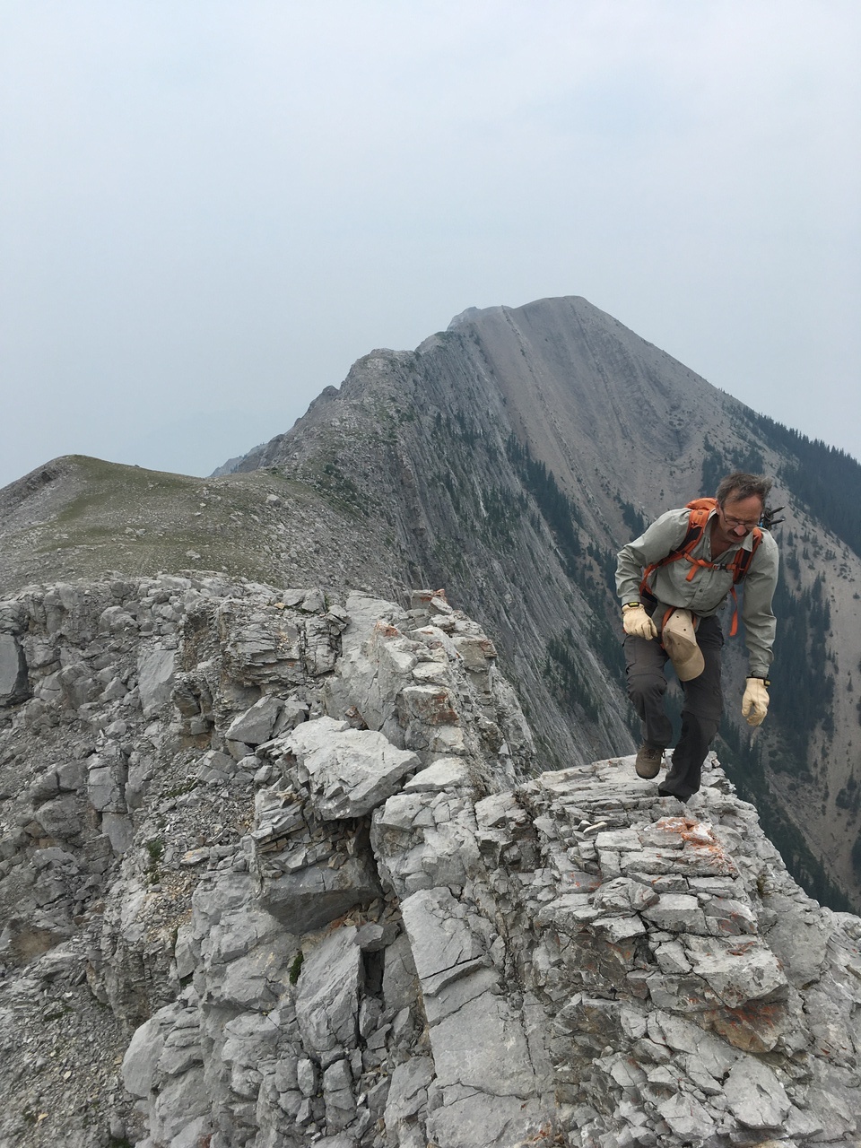 My dad downclimbing some moderate terrain on the crest, leading to the short crux!