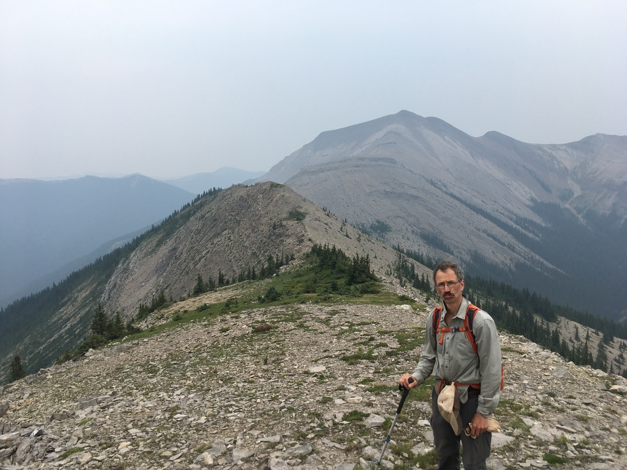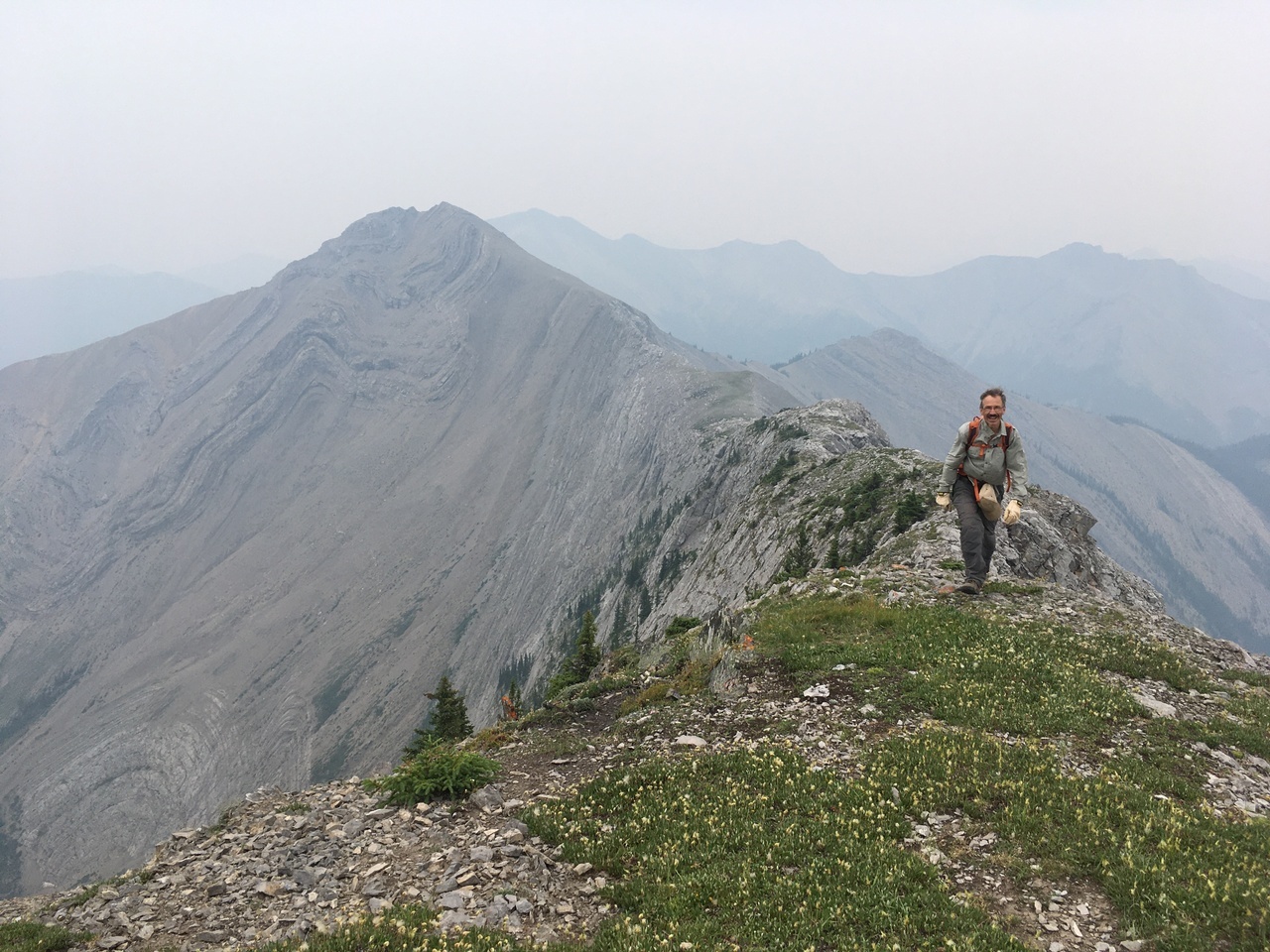 We tried side hilling below the next highpoint in the ridge, to cut off time, but it wasn't the most ankle-friendly terrain, and probably didn't save any time in the end. Just past 4:00, we had circled around the highpoint, and were rewarded with this extremely discouraging view of how much farther there was to go! My dad's face represents the mood pretty well :( . We reluctantly made the decision to turn around, as we still had to retrace our steps across a long ridgewalk, followed by the whole descent down Roche à Perdrix, and then a four hour drive back to Edmonton!
