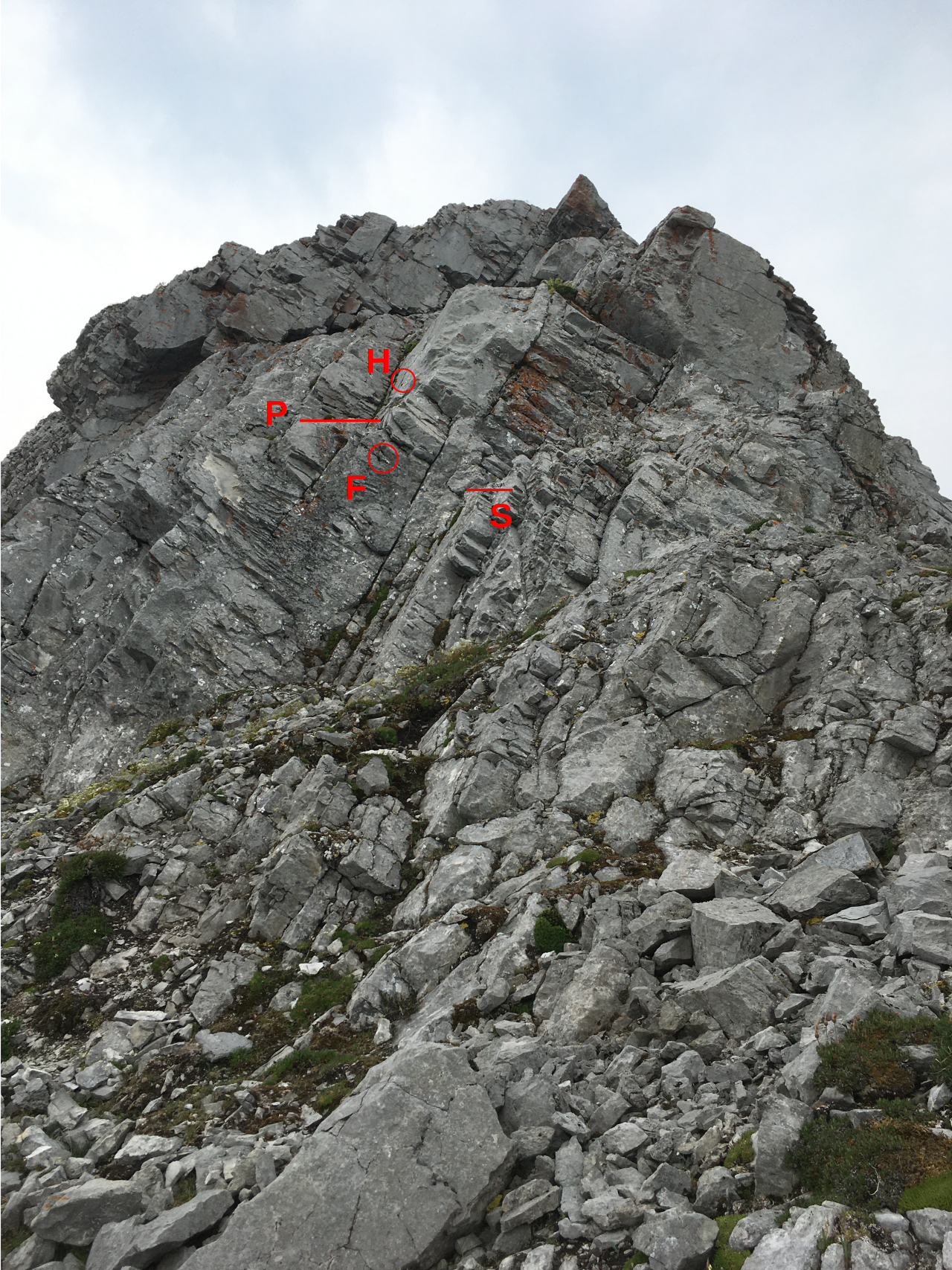 Looking up at the crux! H - the crack in the rock that offers a very solid hand hold, P - the platform, F - the general area of the foot hold (hard to tell exactly), S - the lower step we had to swing down to.