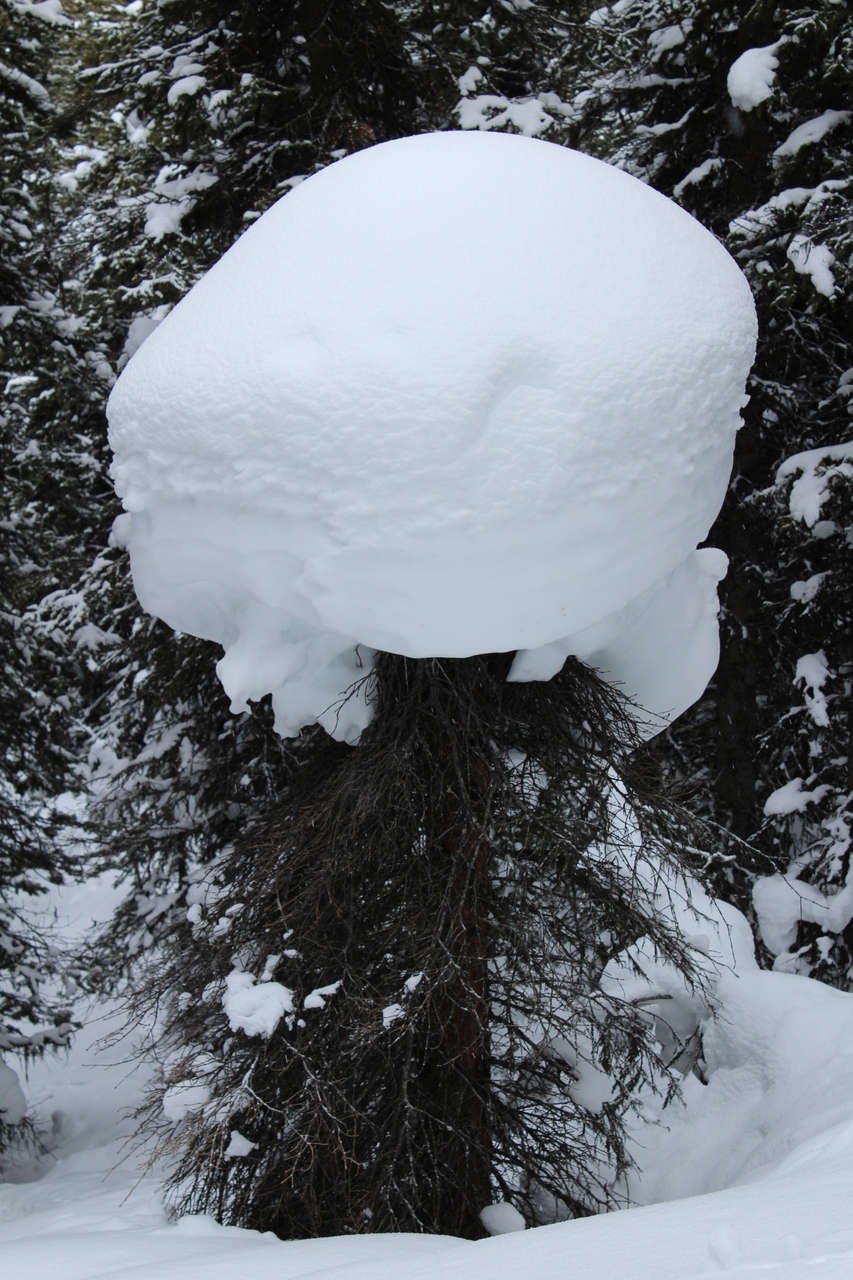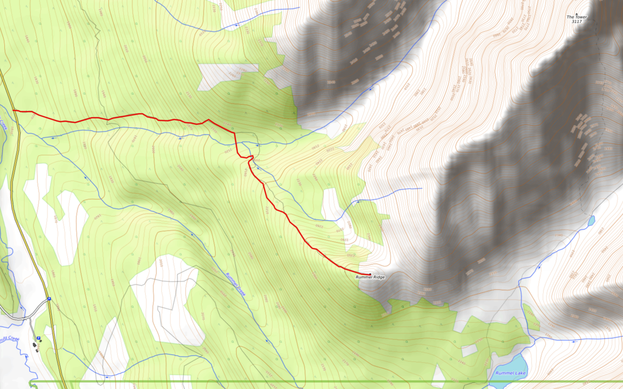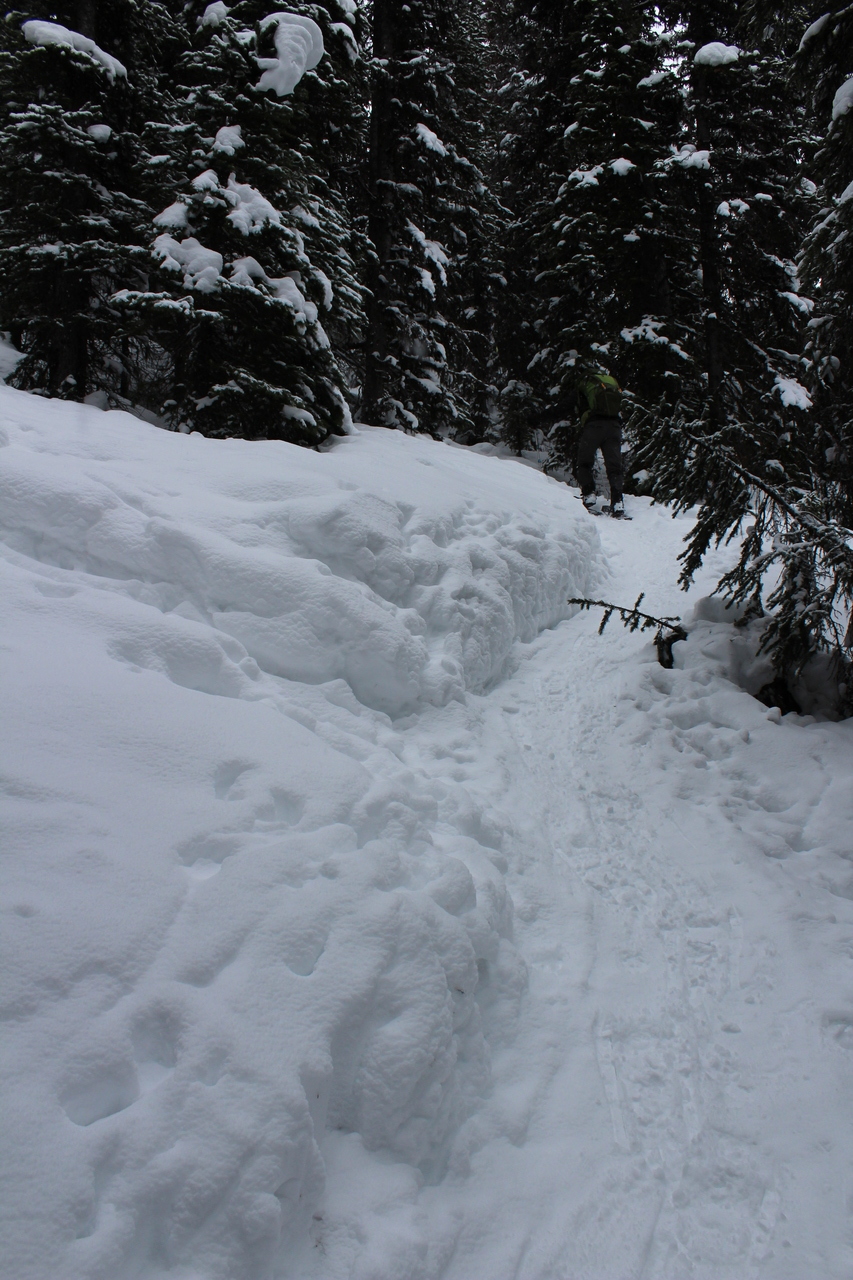 We made it down the ridge in no time at all, and almost got carried away, descending the west slopes of Rummel Ridge, before realizing we had to angle back to skier's right! After descending a short steep slope (maybe the reason for the round-a-bout trail we followed on ascent), we intercepted the trail, just before the creek crossing.