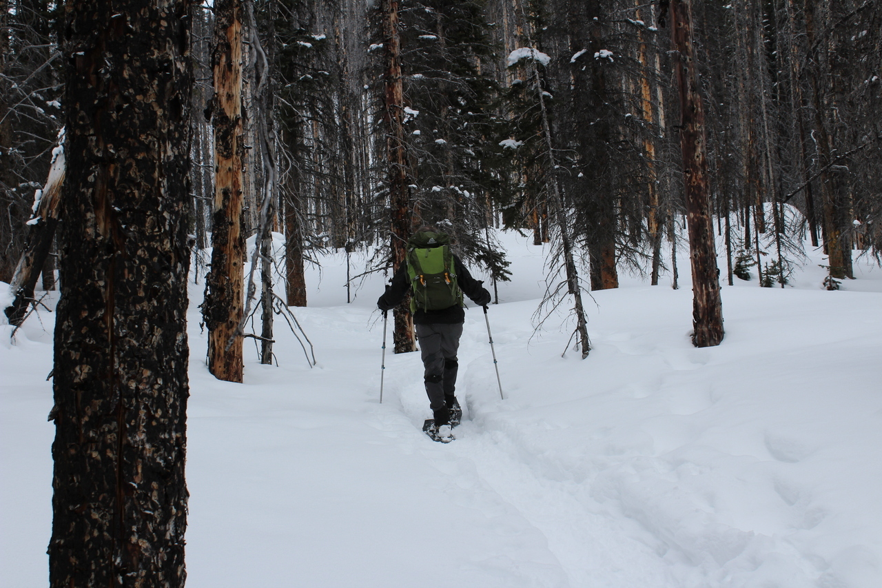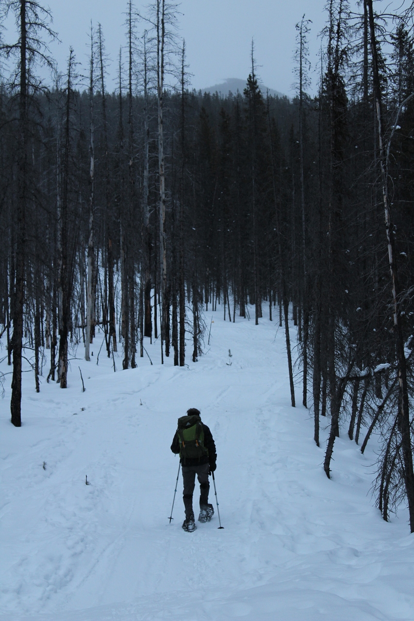 Starting up the wide, heavily skied off trail, through the burnt forest. Would make for a great, low hazard, place to ski...You just gotta make it before the crowds! Rummel Ridge rises distant-center.