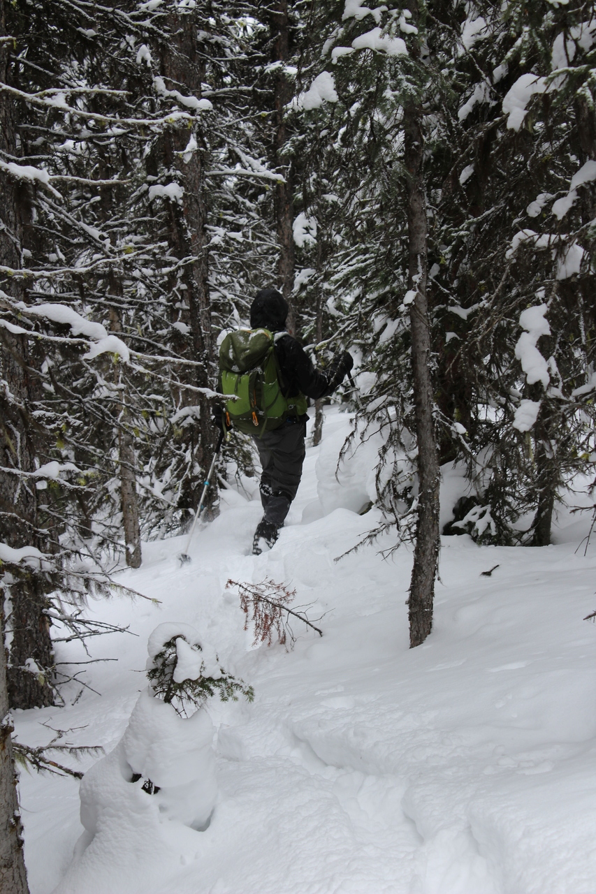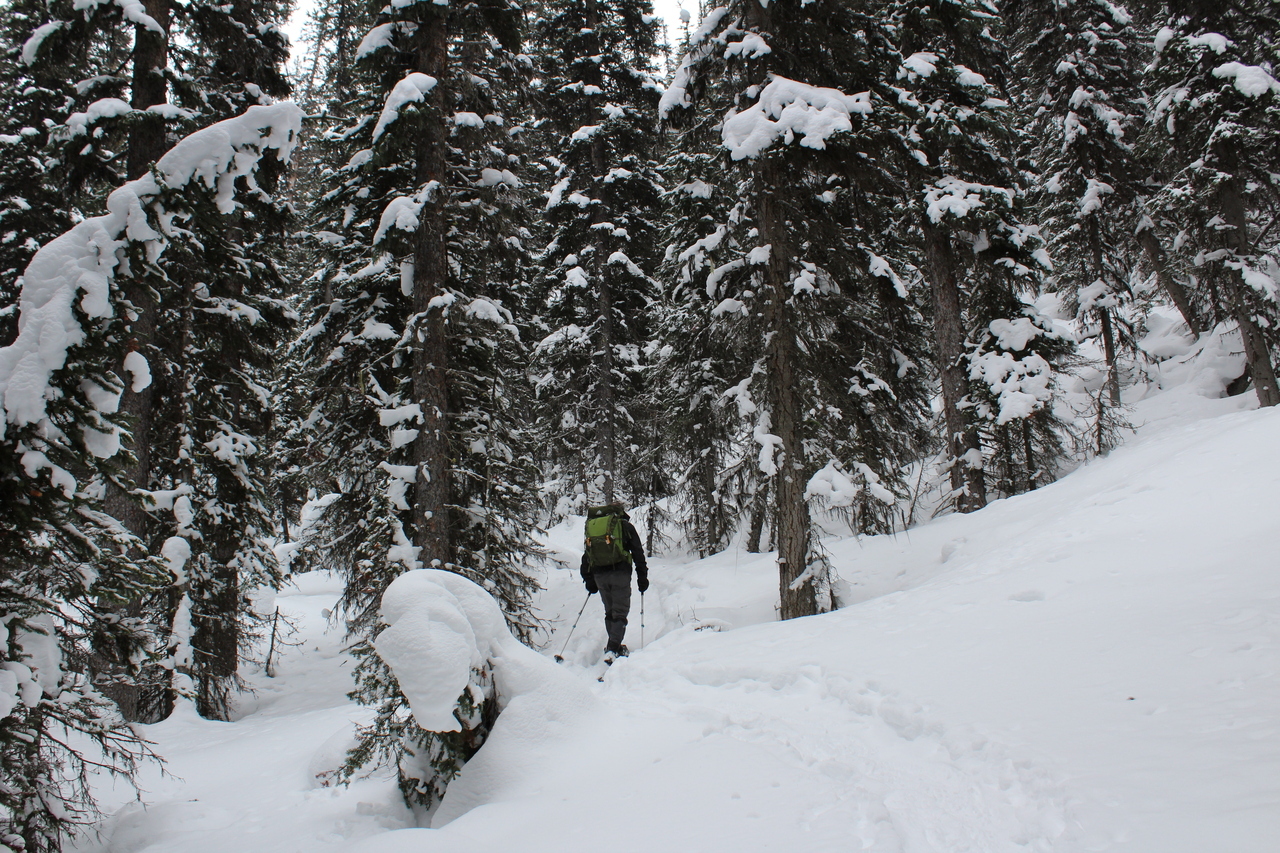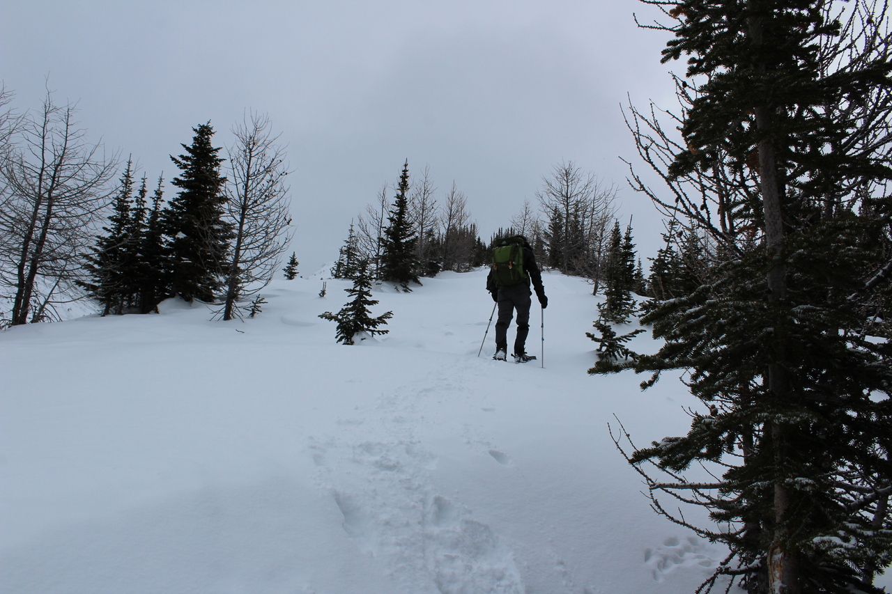 After a short, steep climb to gain the ridge, it was smooth sailing, up gentle treed slopes.