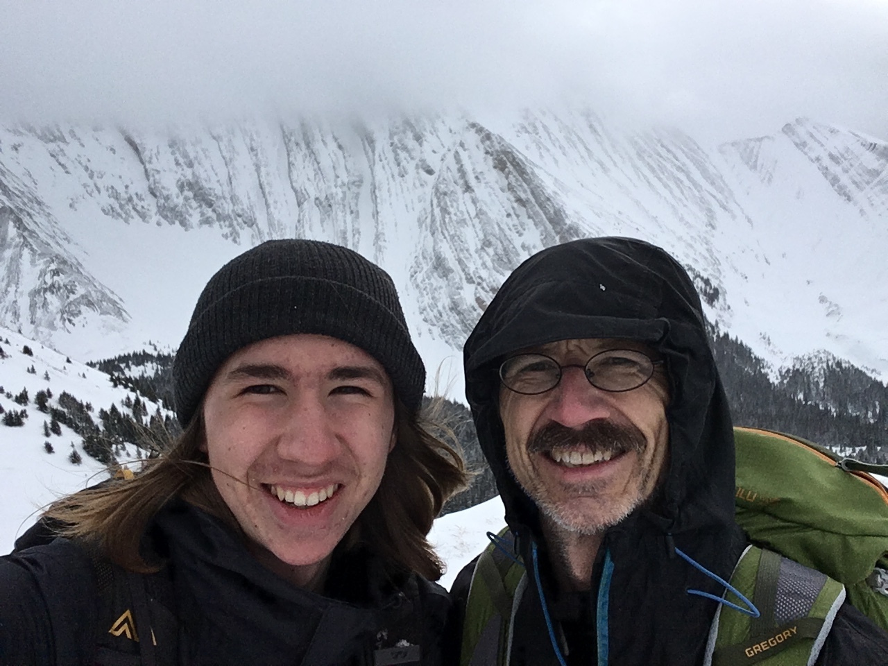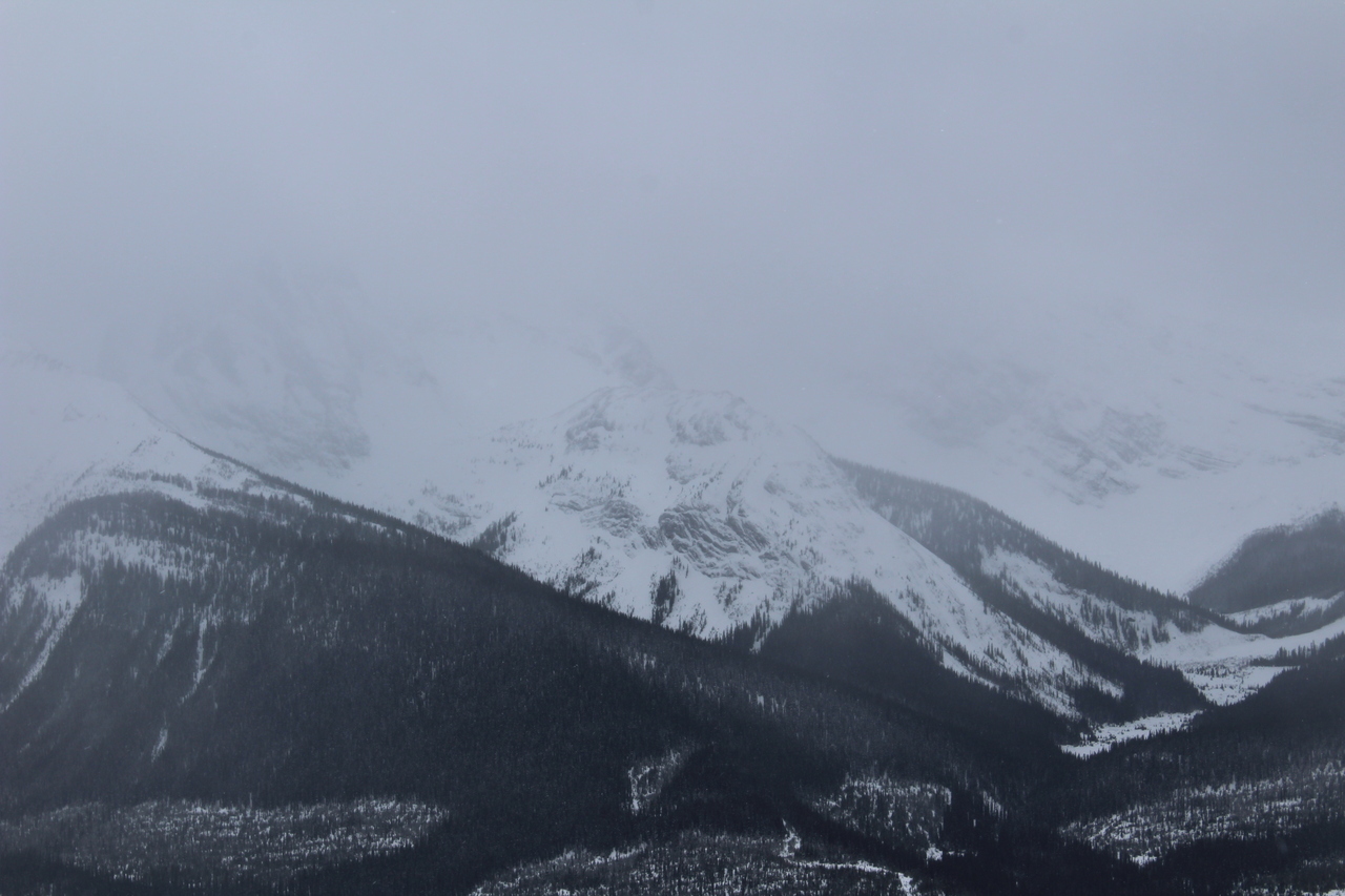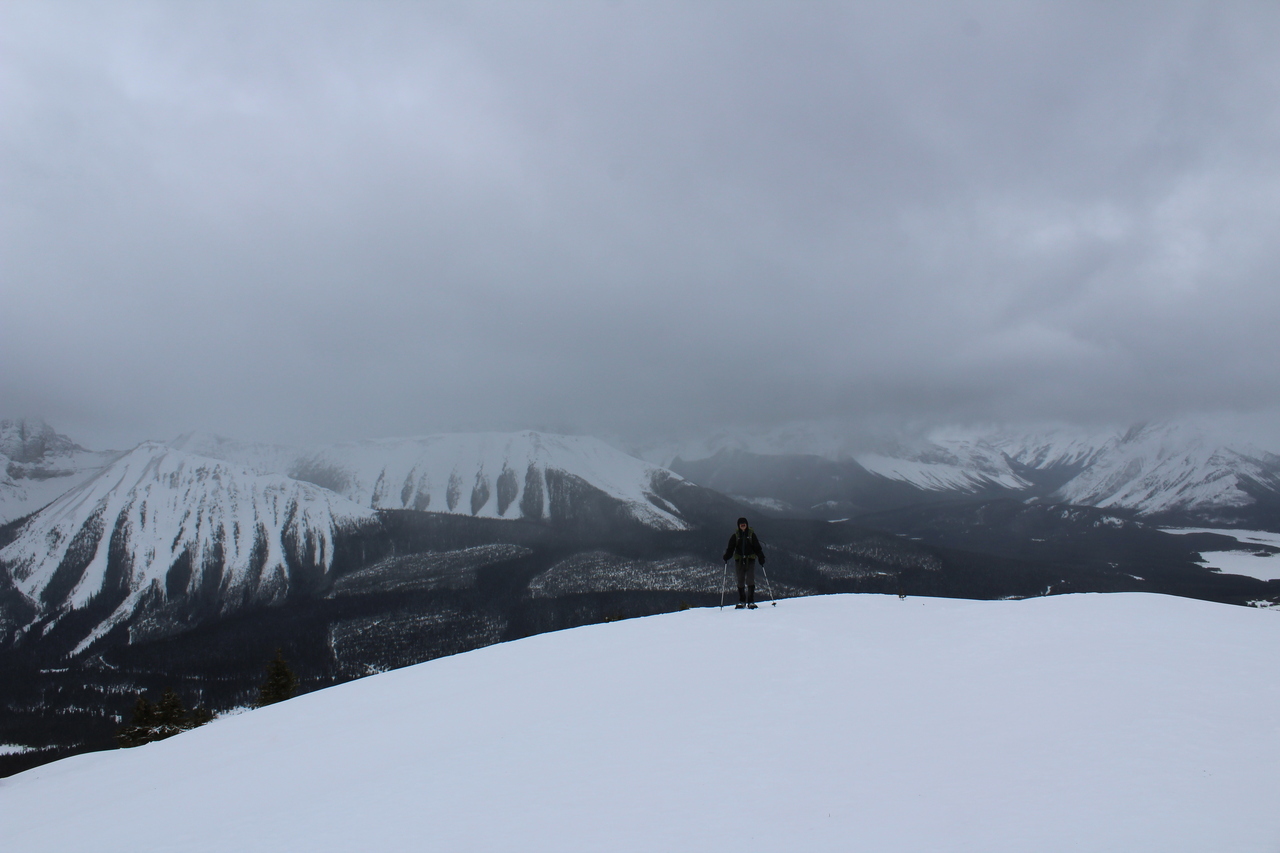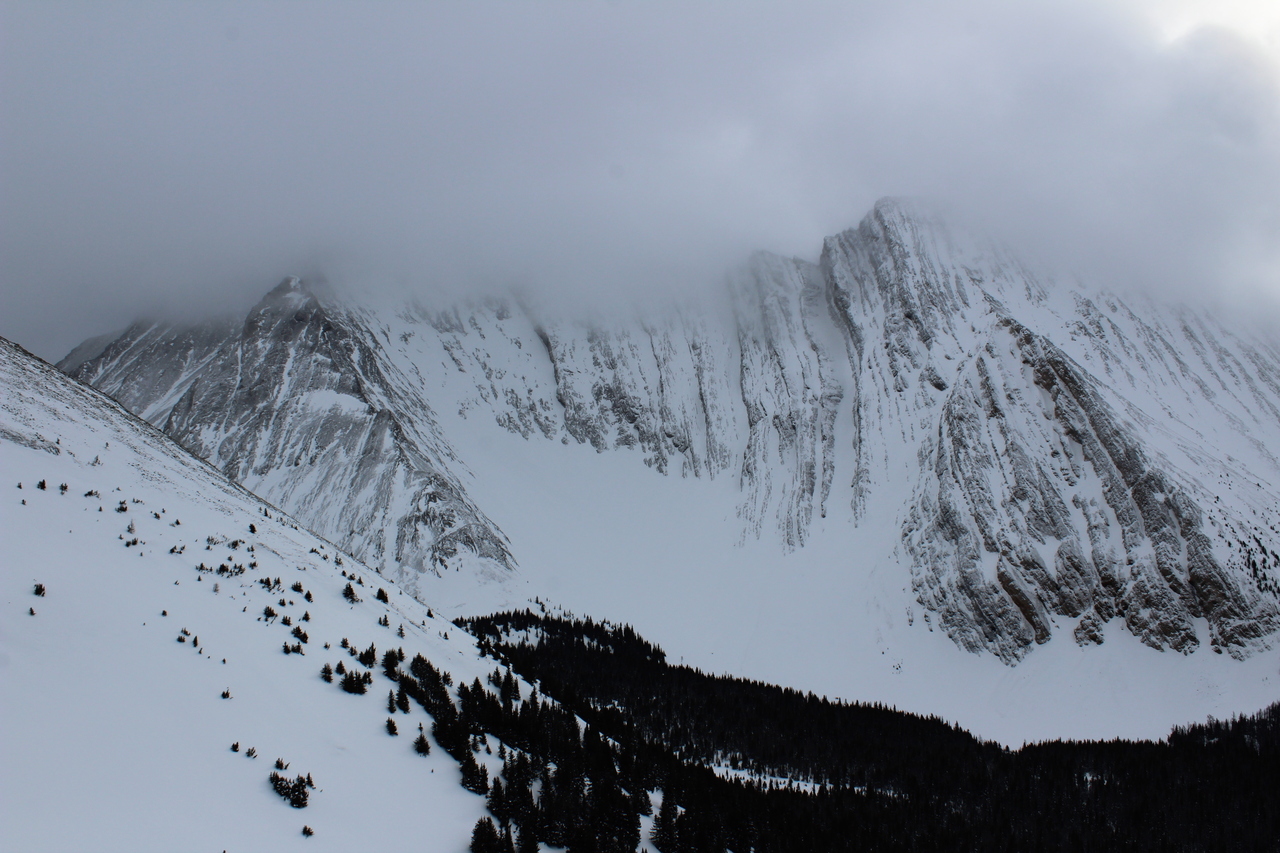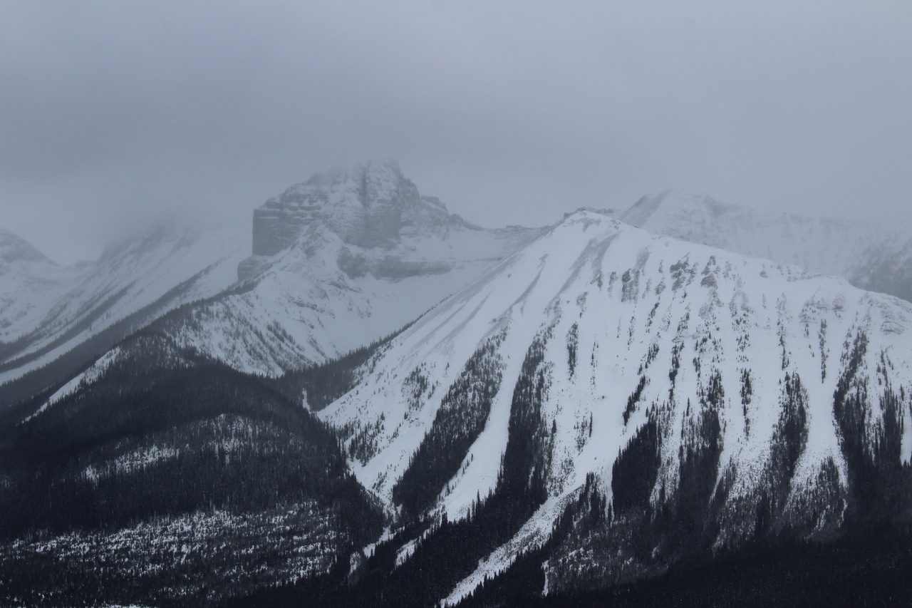 Looking back to cloudy Mount Engadine from a brief clearing along the ridge! Our first view of the day, after first being in a snowy whiteout, followed by dense forest!