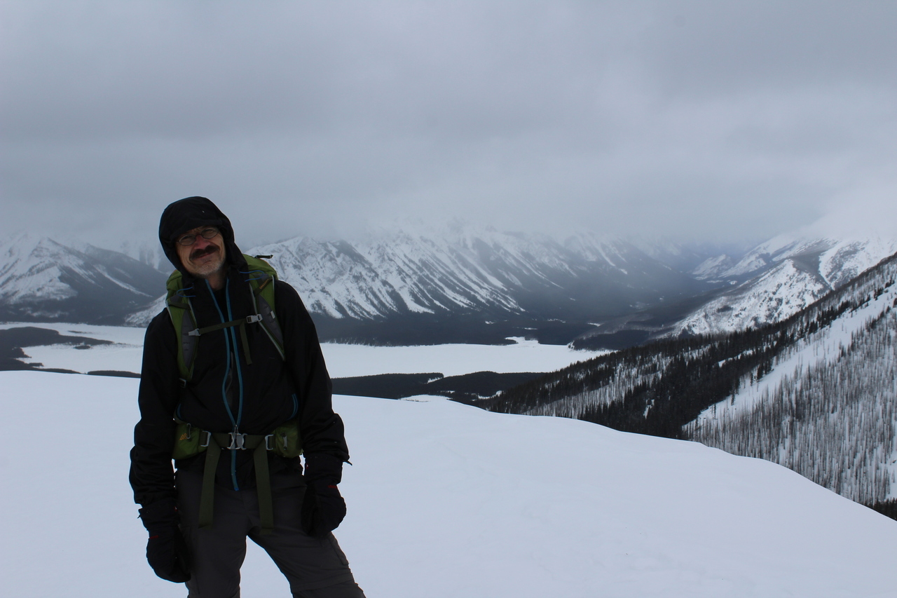My dad, with snow-covered Spray Lake beyond!