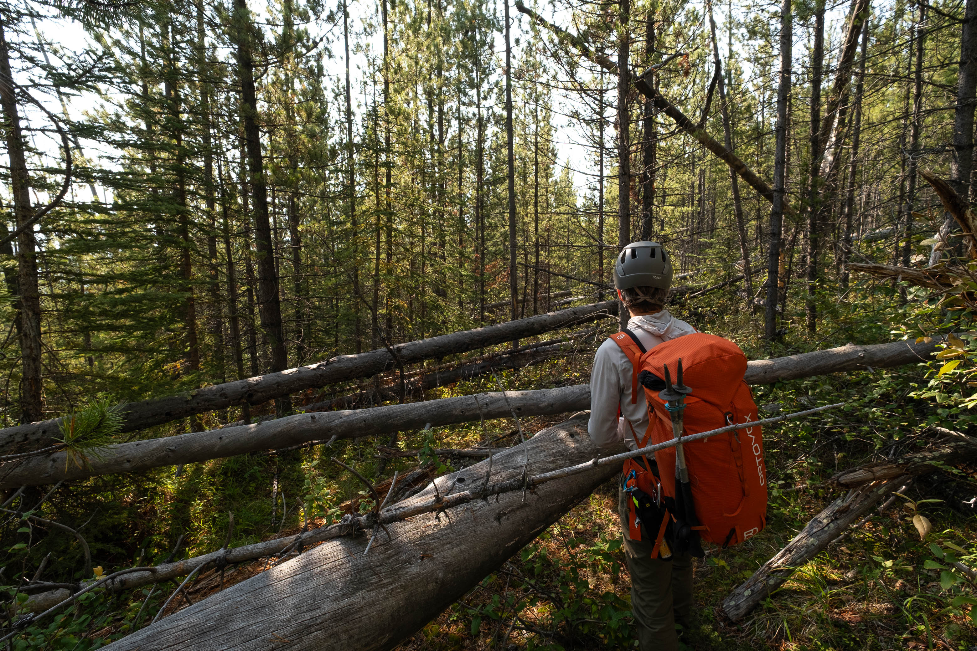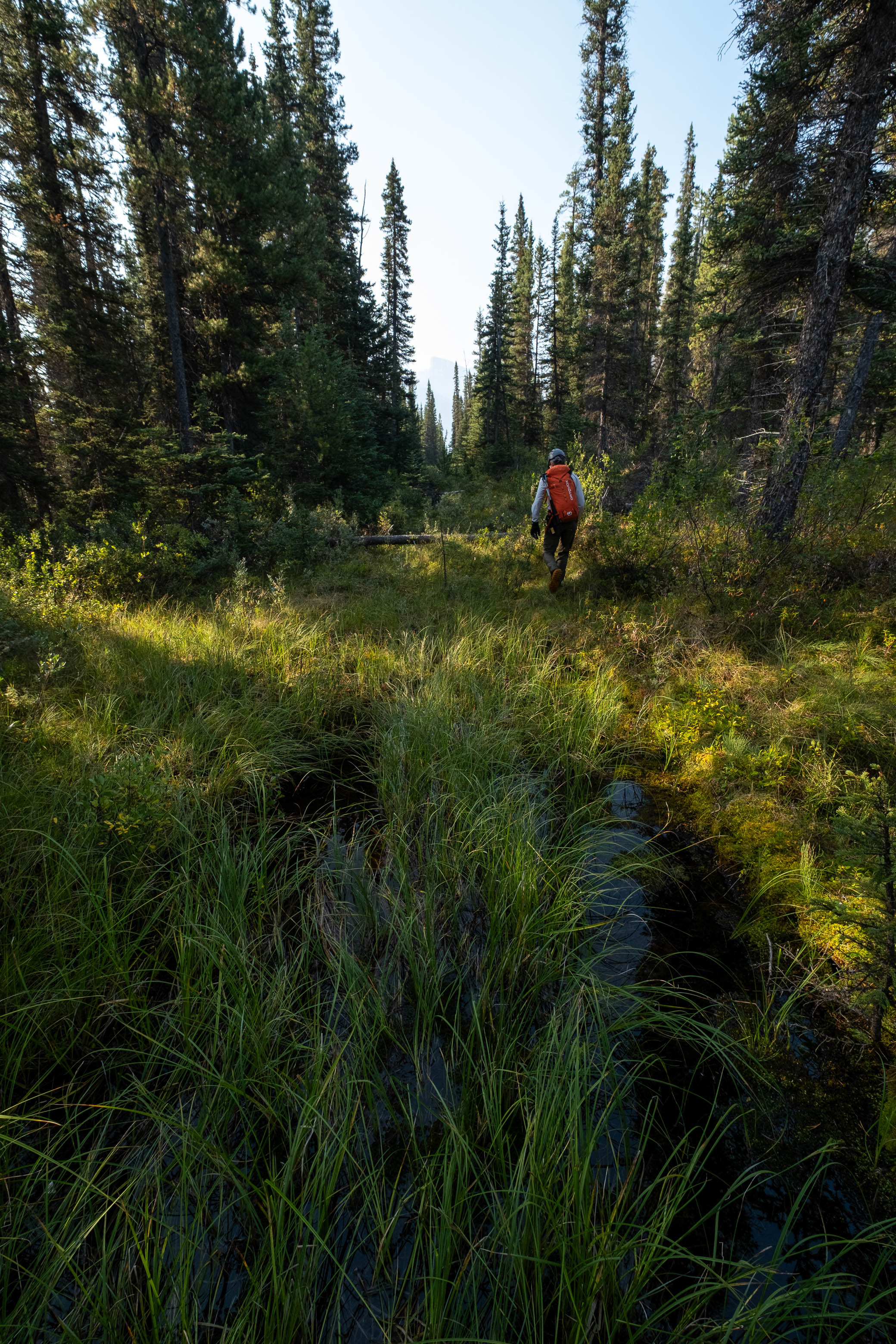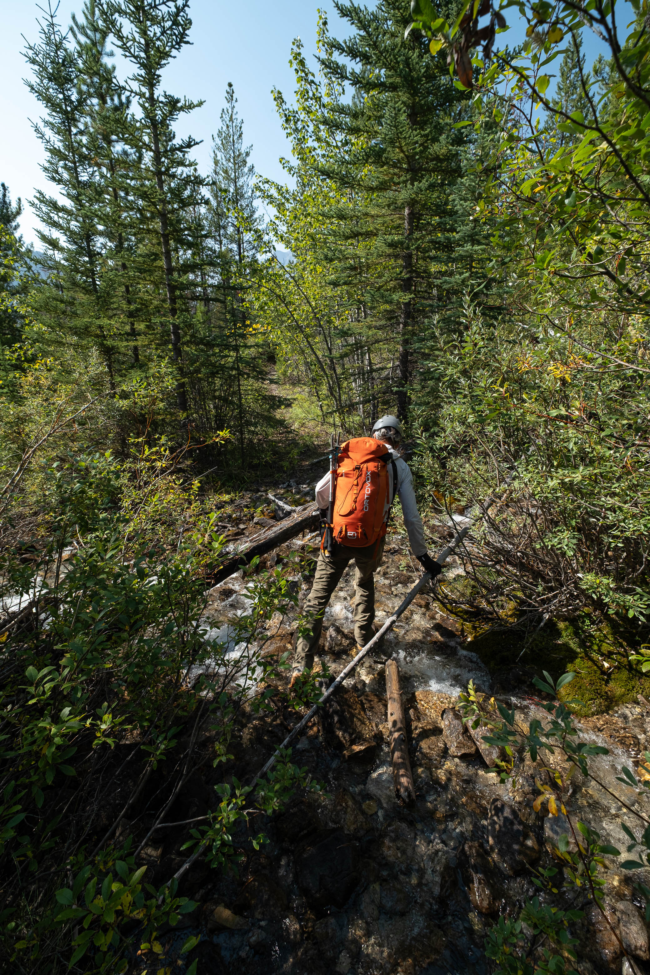As Vern points out, the trail does indeed deteriorate significantly from this point forward, but after what we'd just been through on our bikes, I actually found these first few kilometers on foot to be quite pleasant! Navigating deadfall is A LOT easier when you don't have to heave your bike over it and although the cutline definitely has it's boggy sections, I think we benefitted from a couple weeks of warm weather since Vern's ascent and with our leather boots and some careful footing, we managed to keep our feet completely dry! I know Vern swears by approach shoes and the benefits of being able to just trudge through creeks, rivers...and in this case bogs(!), knowing your feet will dry in a few hours - and to be completely honest I'll definitely be adopting this strategy for certain trips that I have planned 😉 - but I think our heavy, clunky boots actually saved us on this one. Let's be honest, benefits aside, no one actually likes dealing with cold, swampy feet and combine that with hours and hours of less than ideal trail conditions and there's a recipe for bad vibes! I truly believe that having dry, comfortable feet made a big difference in keeping our spirits high on this challenging approach, and my dad even commented multiple times, "so when does it get bad?"