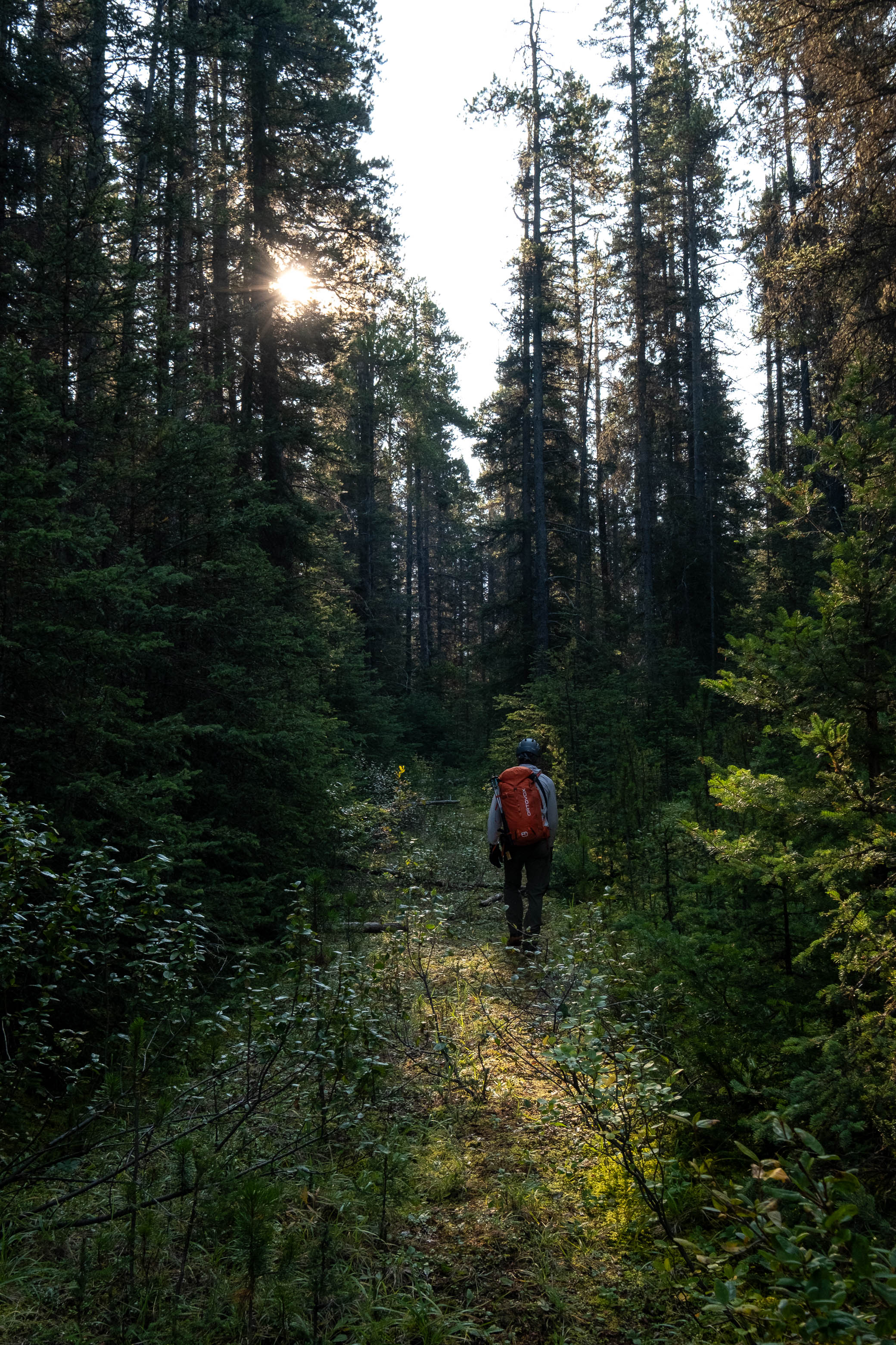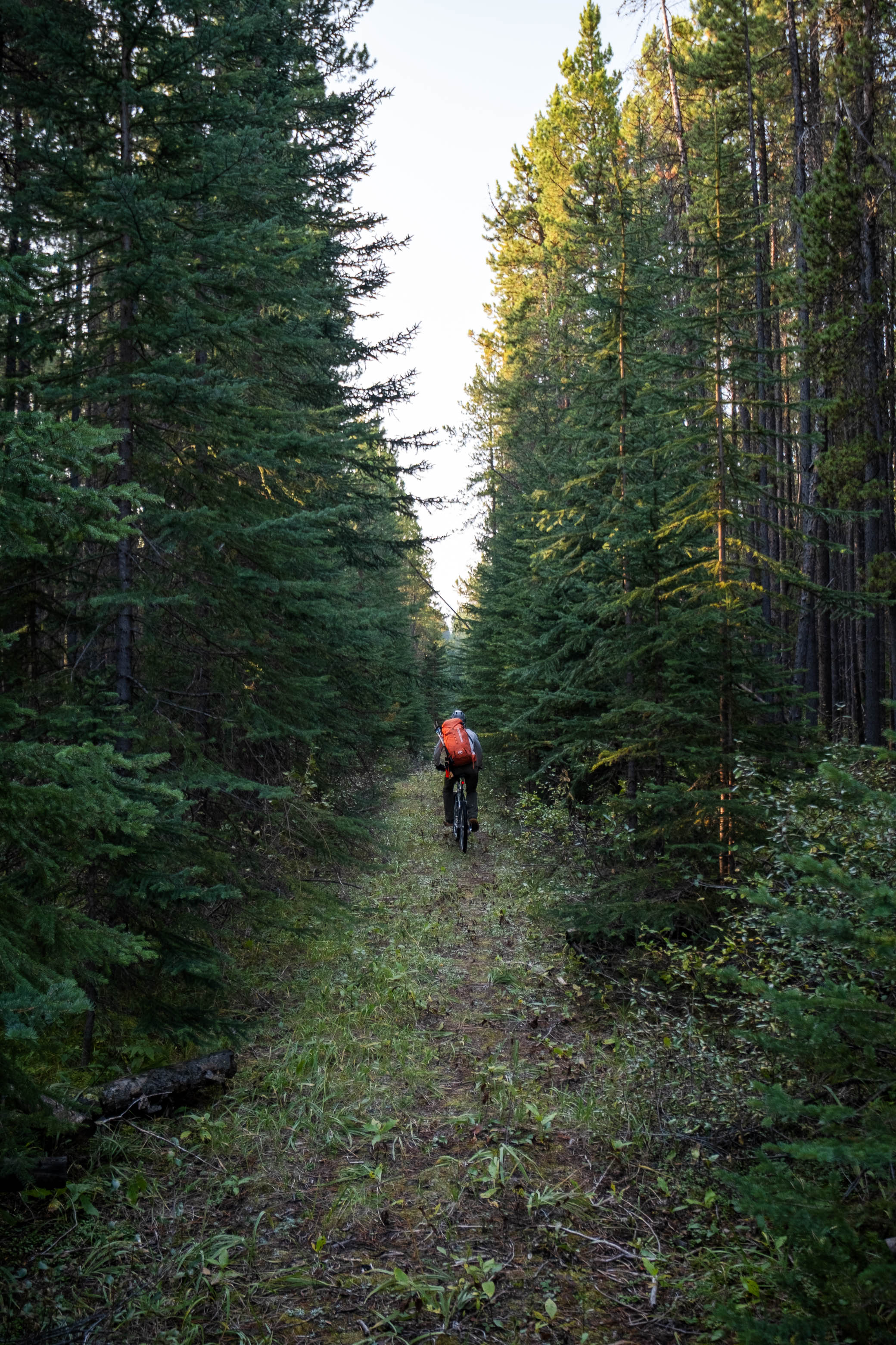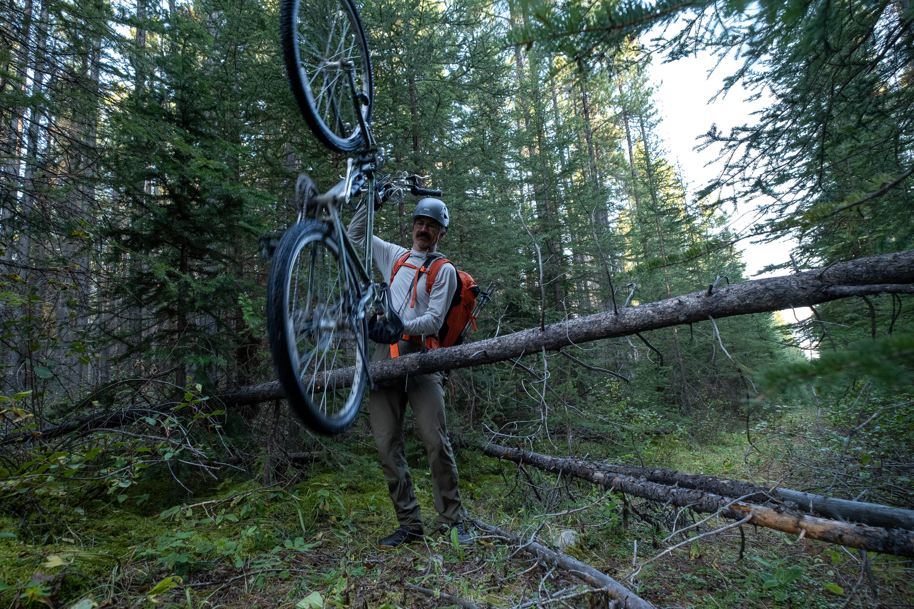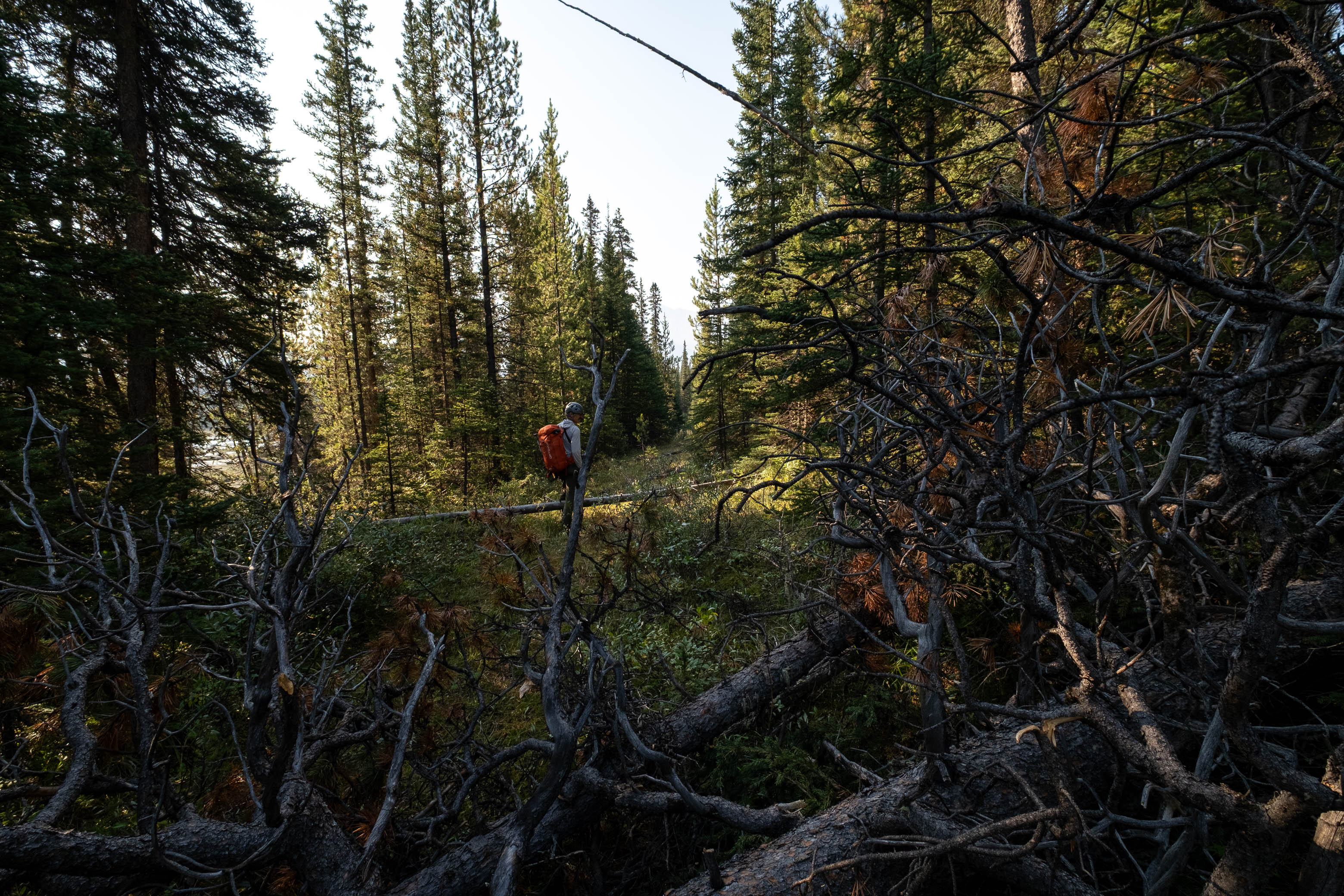 As Vern points out, the trail does indeed deteriorate significantly from this point forward, but after what we'd just been through on our bikes, I actually found these first few kilometers on foot to be quite pleasant! Navigating deadfall is A LOT easier when you don't have to heave your bike over it and although the cutline definitely has it's boggy sections, I think we benefitted from a couple weeks of warm weather since Vern's ascent and with our leather boots and some careful footing, we managed to keep our feet completely dry! I know Vern swears by approach shoes and the benefits of being able to just trudge through creeks, rivers...and in this case bogs(!), knowing your feet will dry in a few hours - and to be completely honest I'll definitely be adopting this strategy for certain trips that I have planned 😉 - but I think our heavy, clunky boots actually saved us on this one. Let's be honest, benefits aside, no one actually likes dealing with cold, swampy feet and combine that with hours and hours of less than ideal trail conditions and there's a recipe for bad vibes! I truly believe that having dry, comfortable feet made a big difference in keeping our spirits high on this challenging approach, and my dad even commented multiple times, "so when does it get bad?"