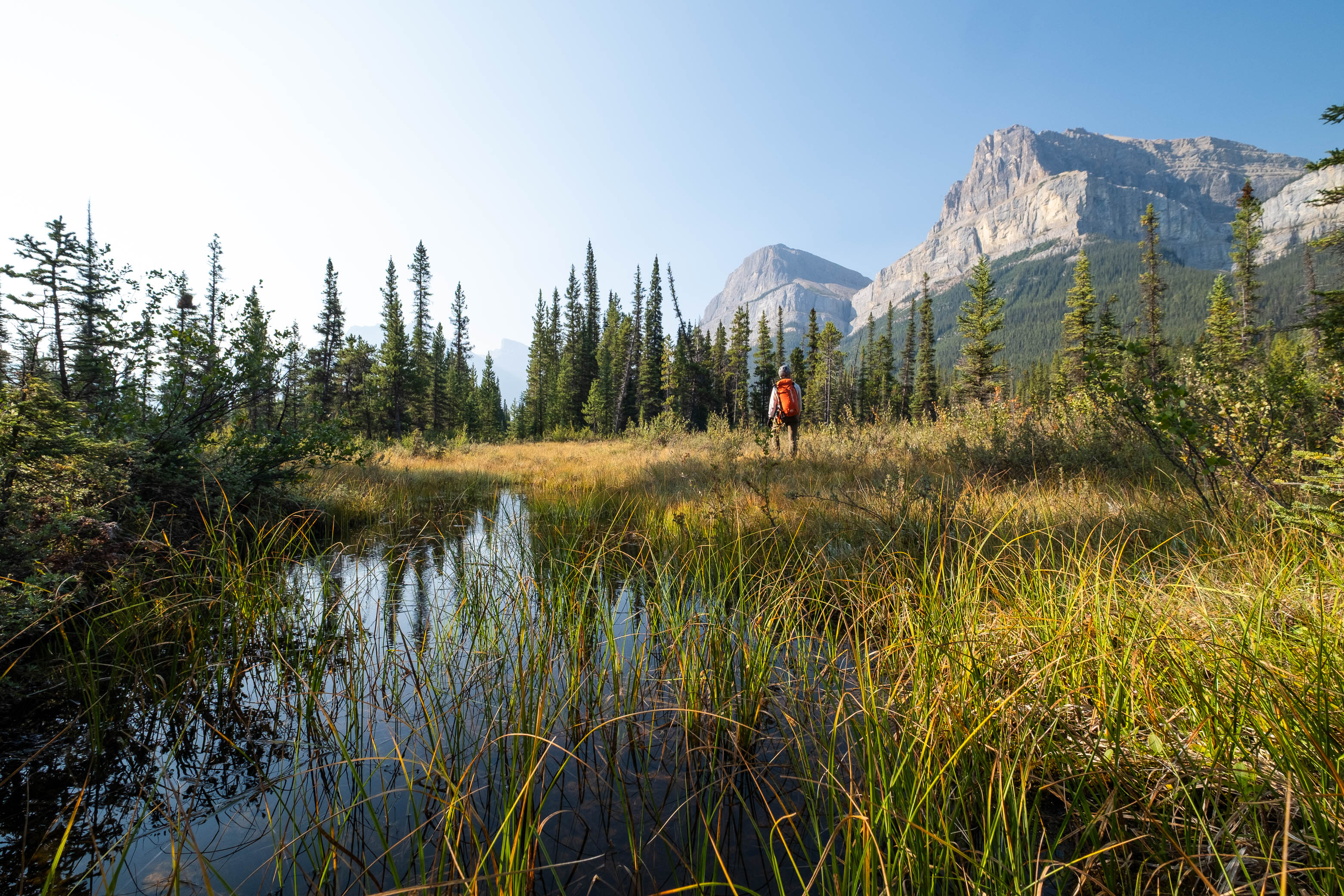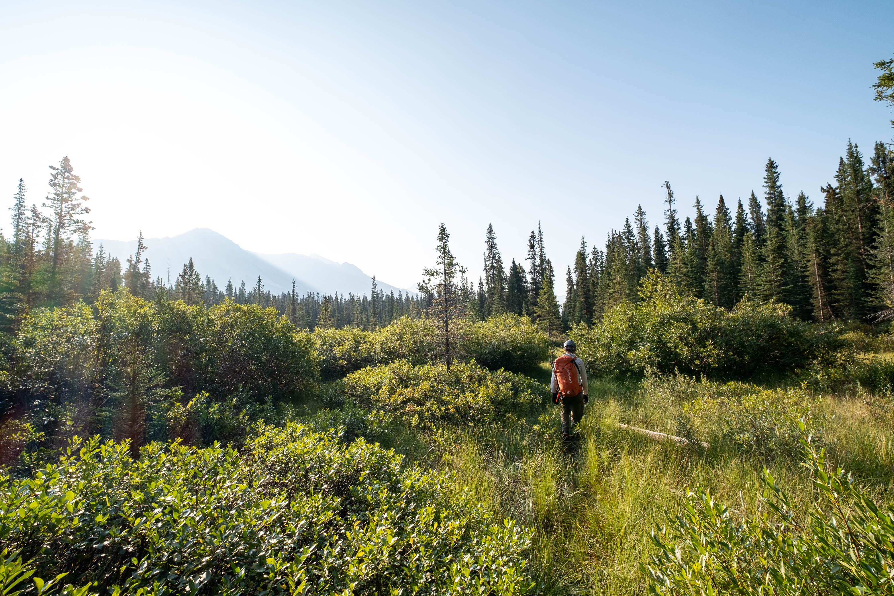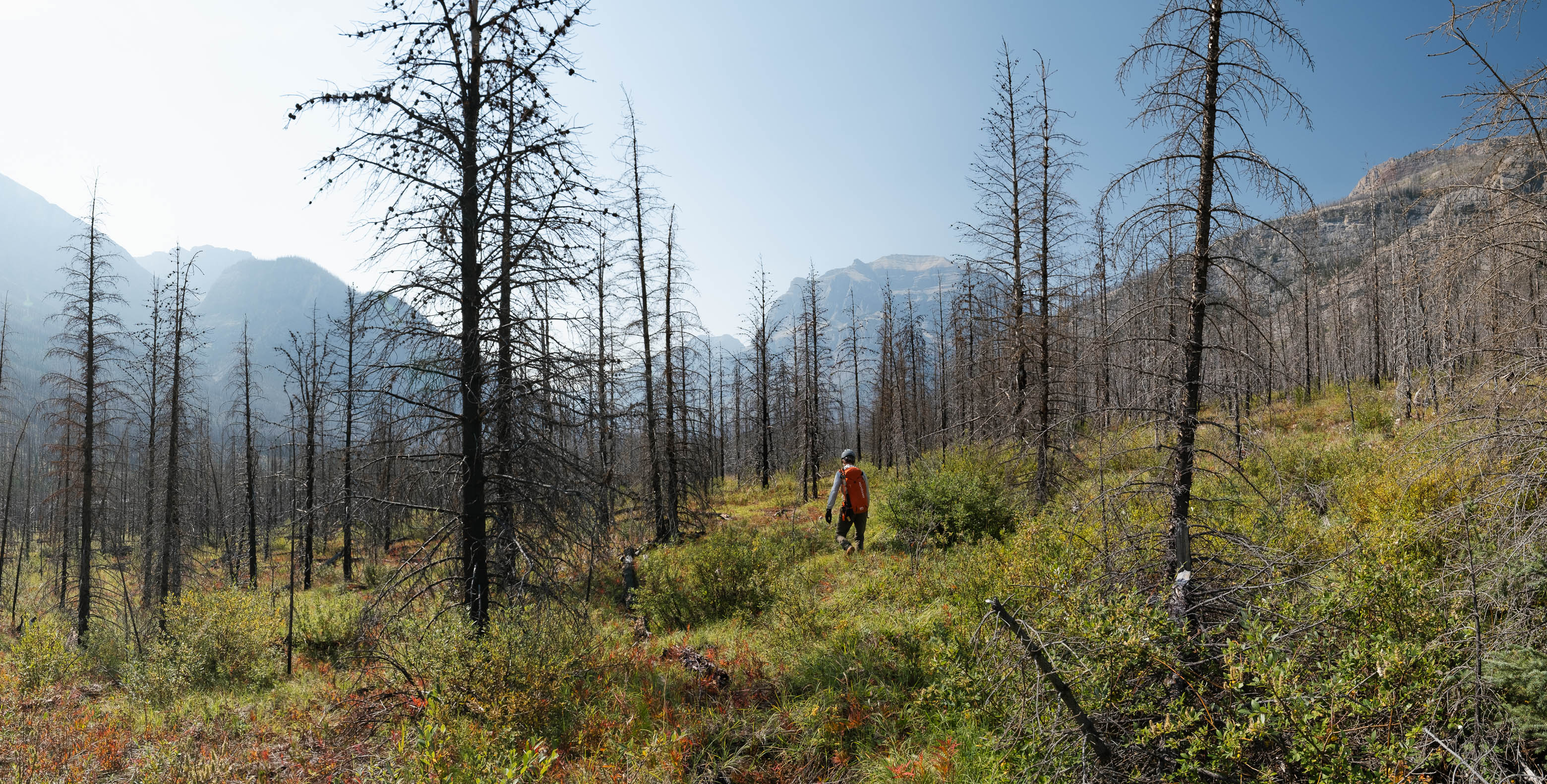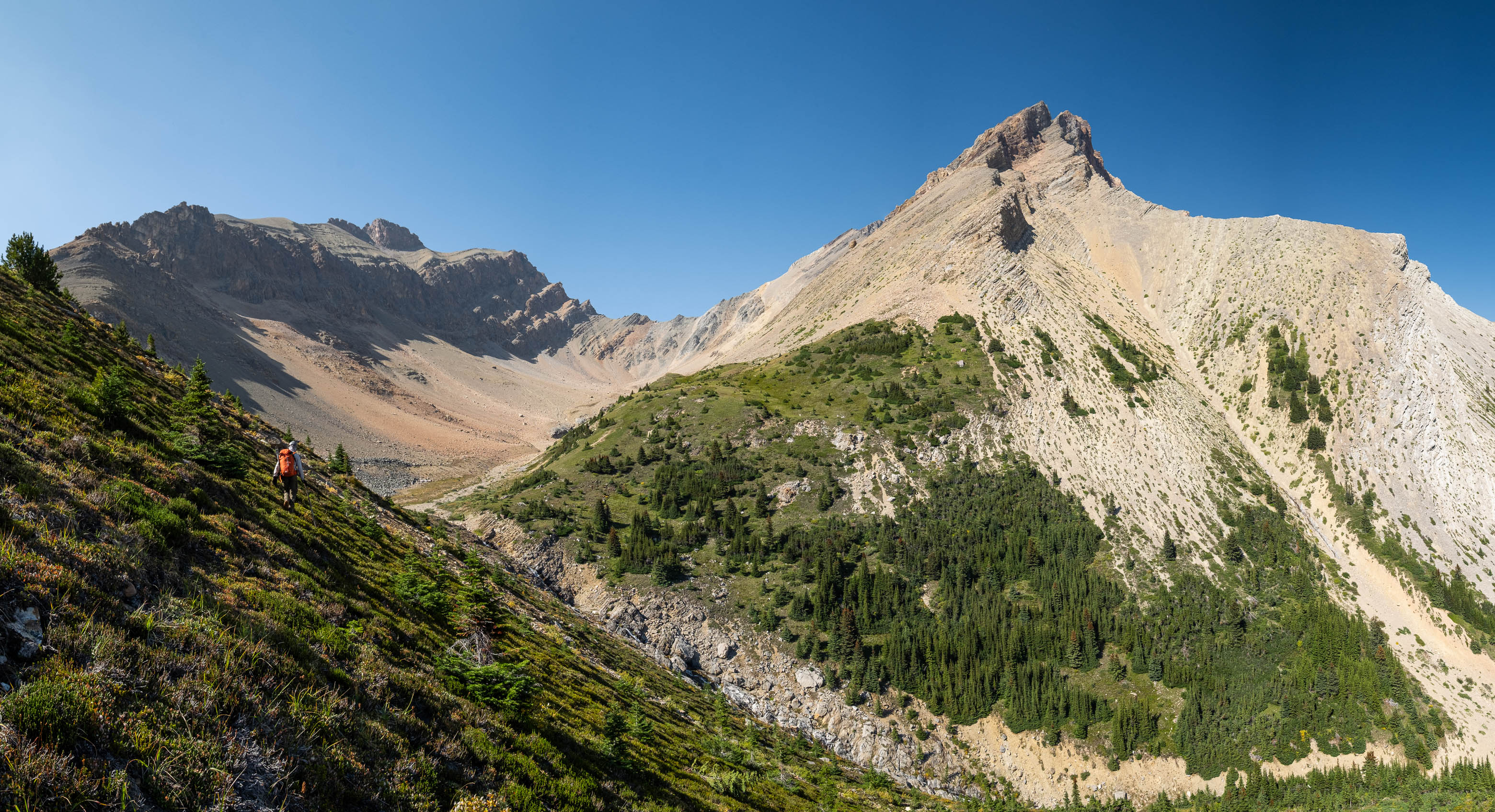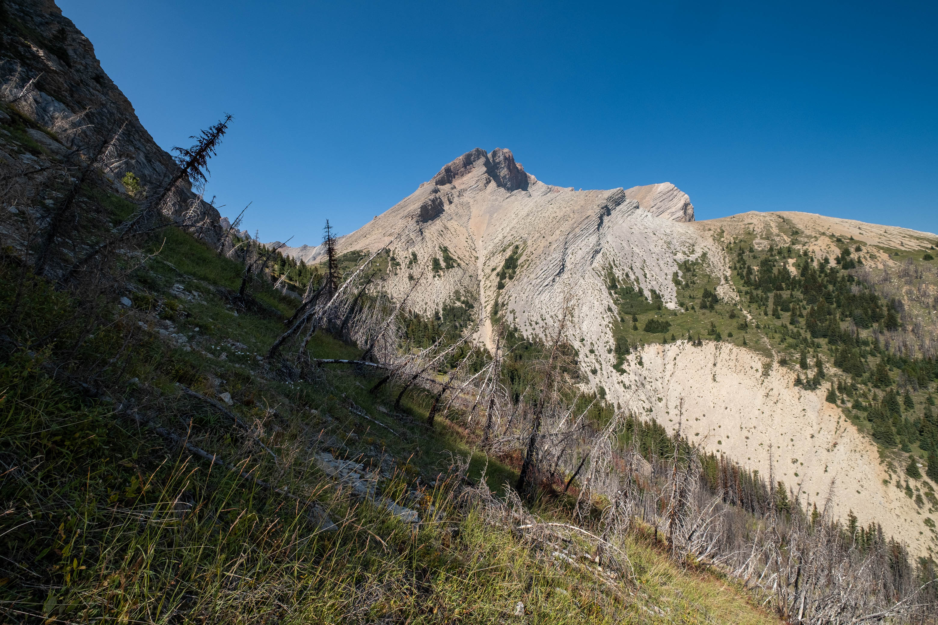 Hiking through the burn for the next kilometer was a nice change in scenery, and we enjoyed impressive views of Siffleur's SE cliffs still looming high above and some greatly improved travel conditions leading up to the base of our ascent slopes.