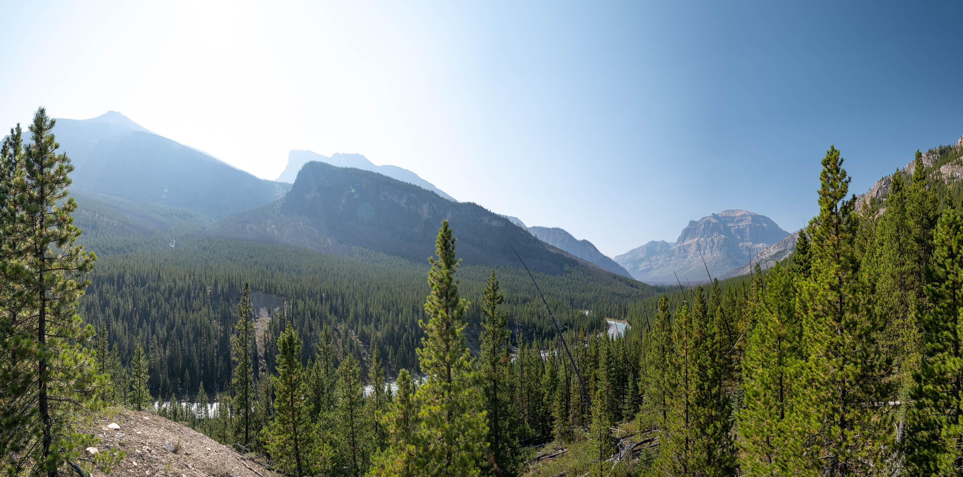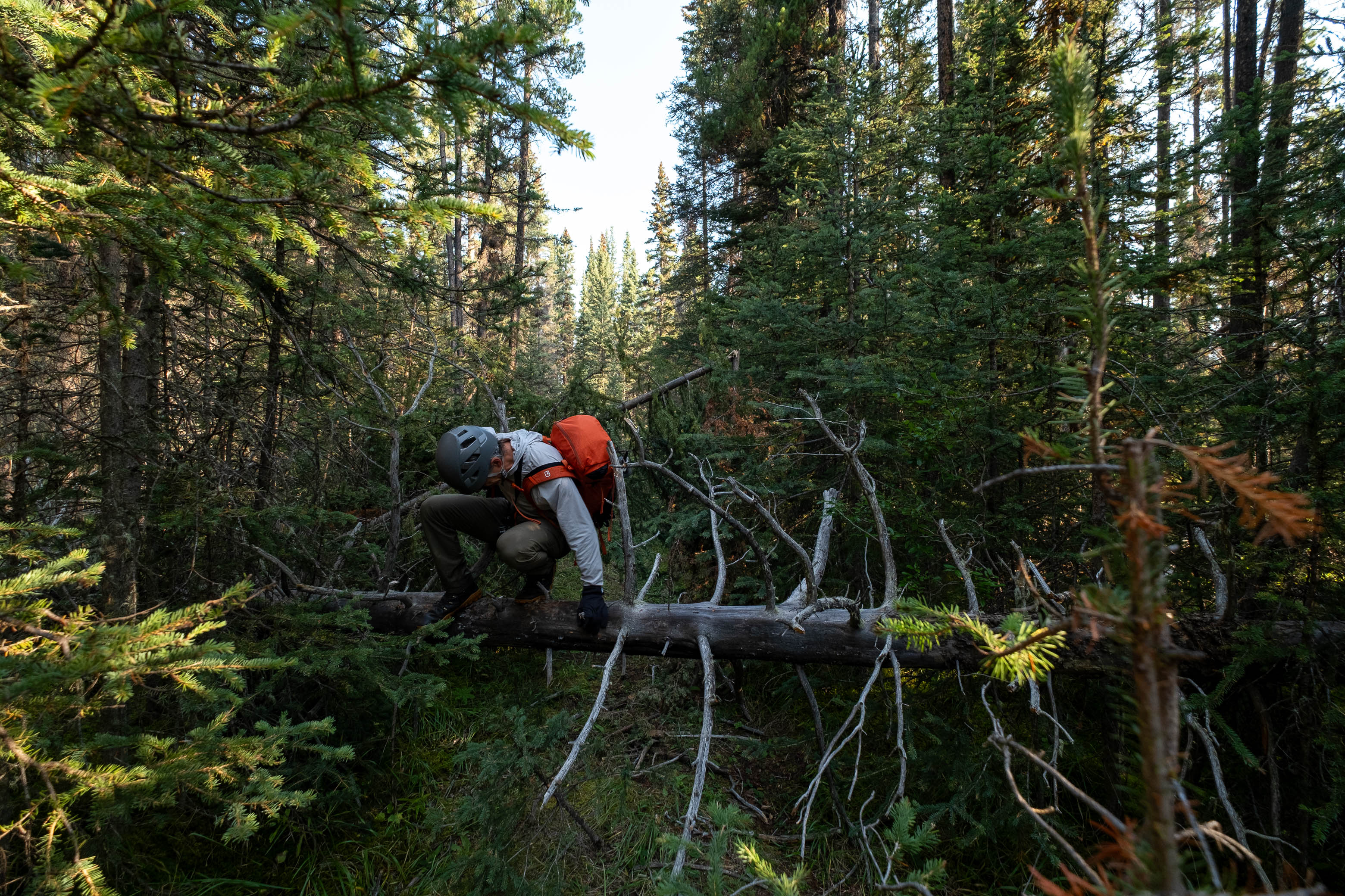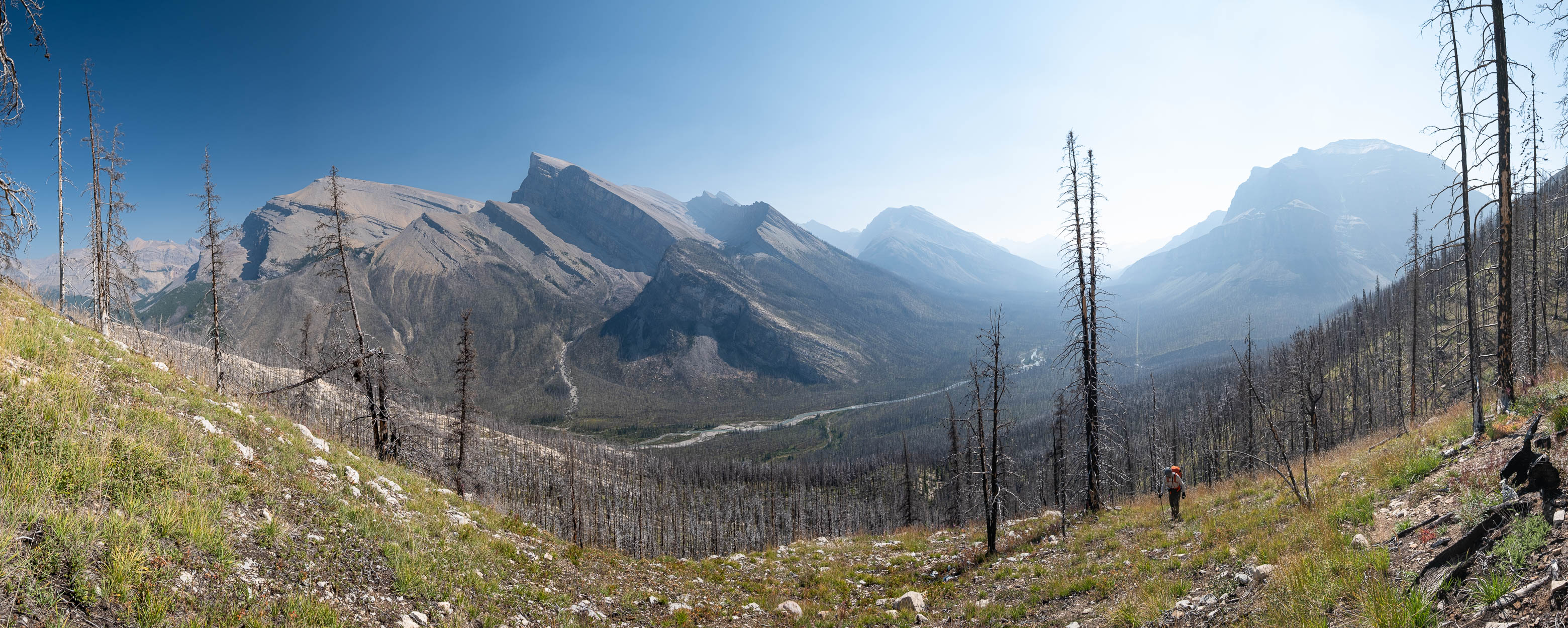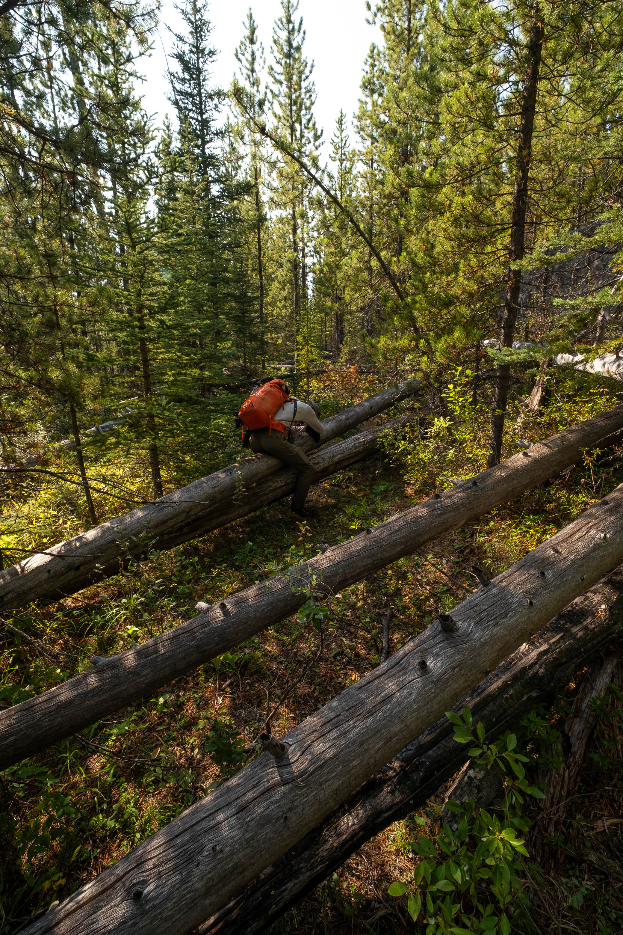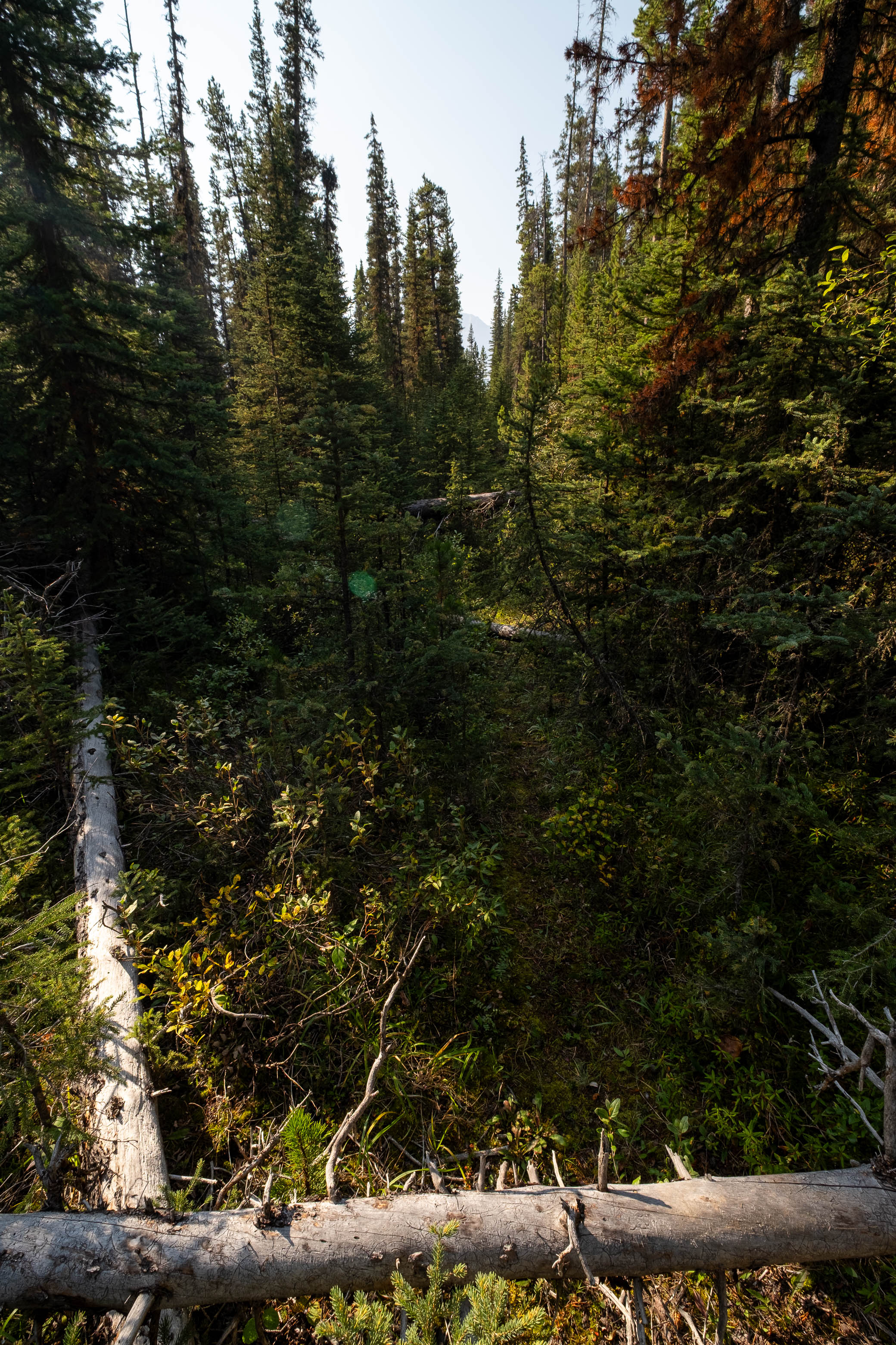 Dense forest with sharp branches gave way to heaps of deadfall, which gave way to more dense forest mixed with heaps of deadfall, and we kept our helmets on 1. to protect us as we put our heads down and fought to free ourselves from the forest's tight grasp and 2. having helmets hanging from our packs would've only made matters worse with our backpacks already getting caught up on everything! Our pace slowed drastically along this stretch and it was quite a relief when we emerged to a beautiful viewpoint over the Siffleur River some 3 km later with the worst now behind us.