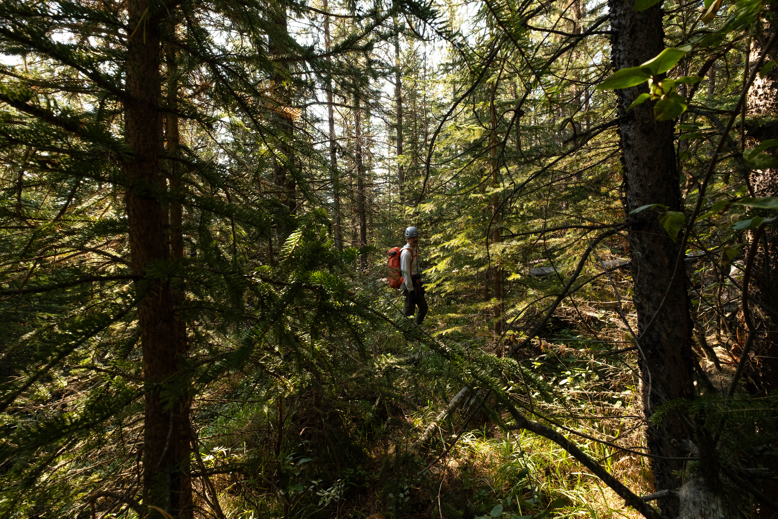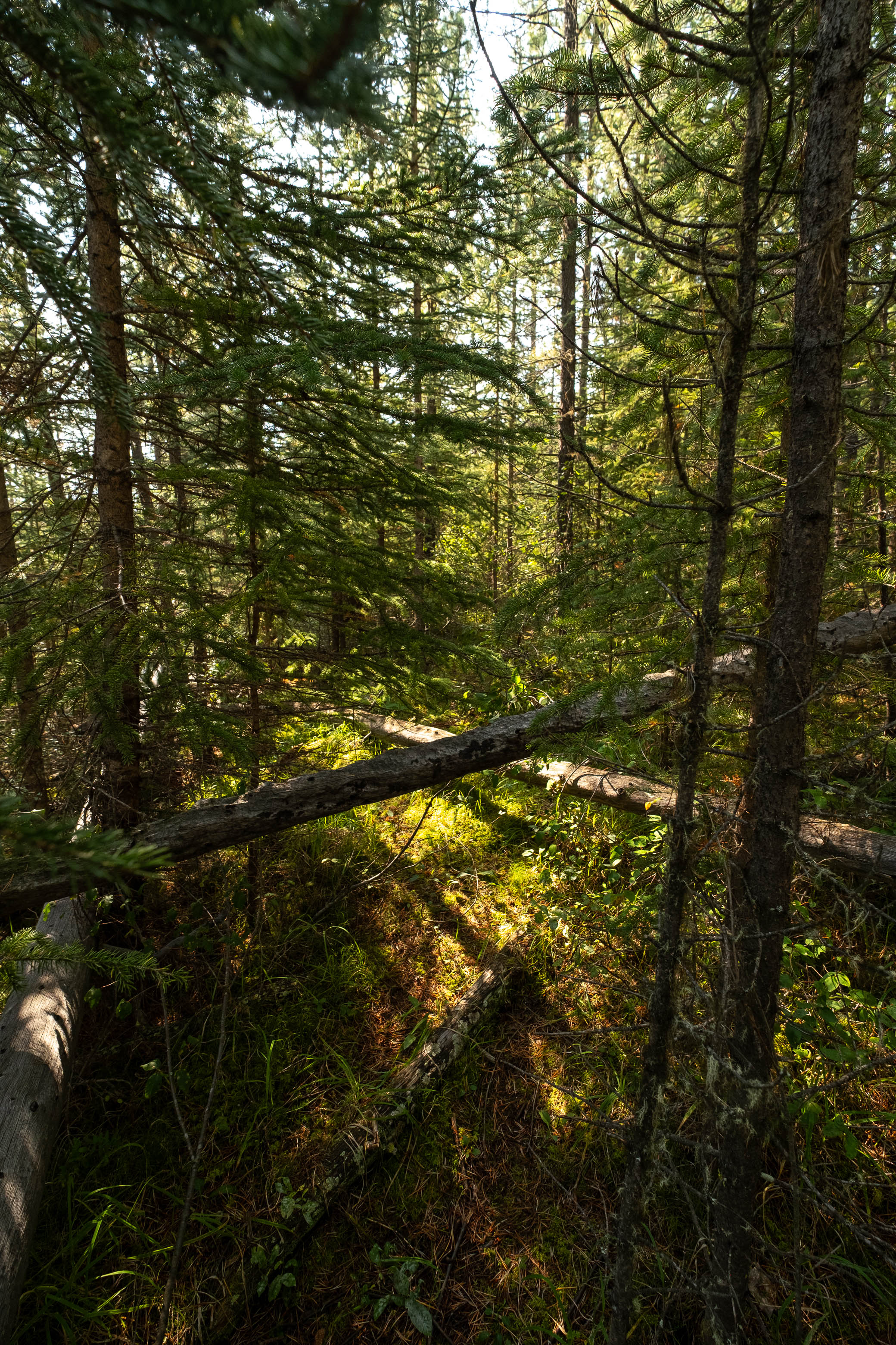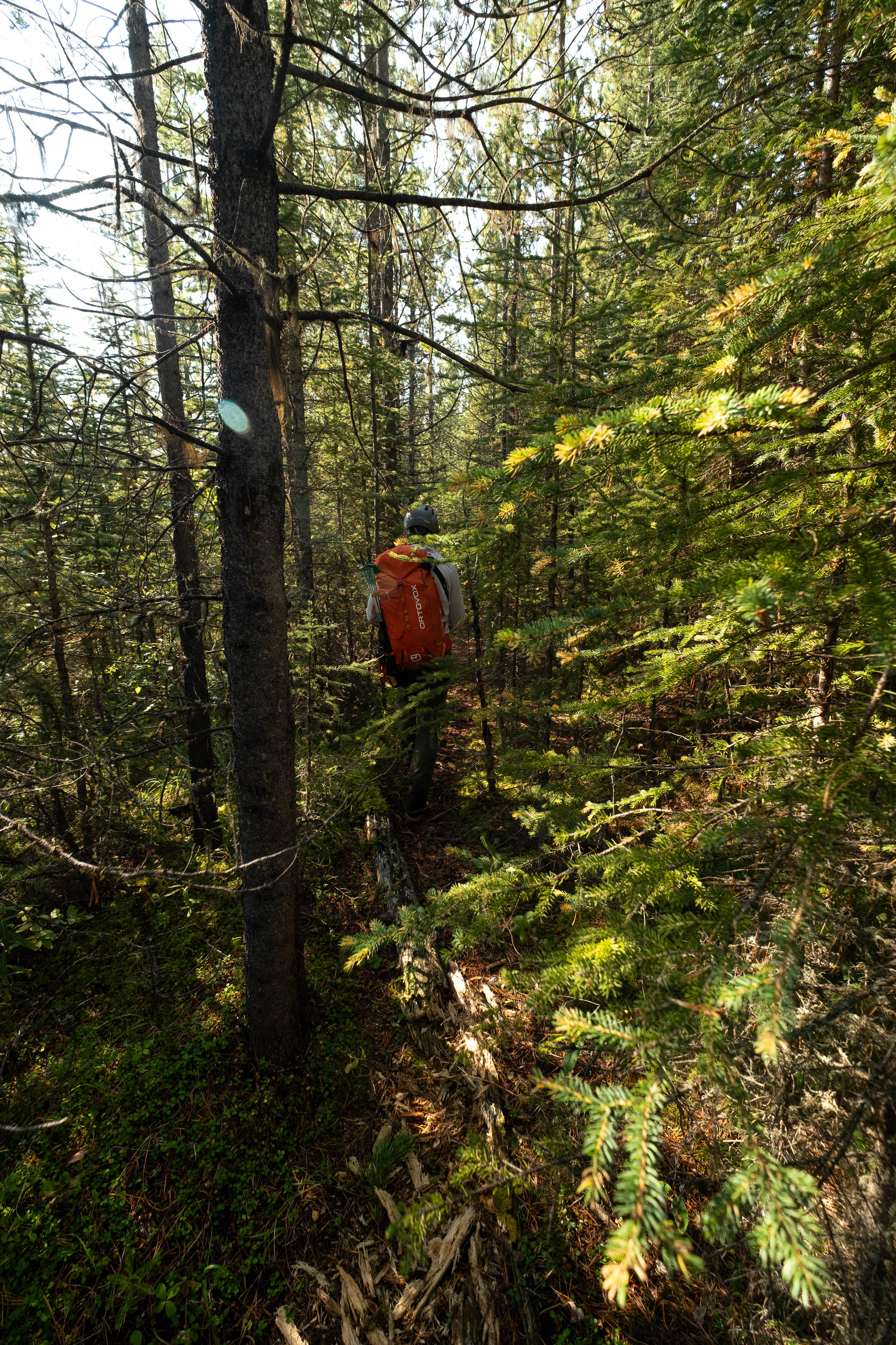 Unfortunately for us, we'd have our answer sooner than later, and it was about 6 km after the boundary that the fun really began. One minute we were still enjoying a beautiful August morning on the relatively open cutline and the next minute we were completely engulfed in a forest jail! The ground beneath our feet continued to give us signs that we were following a "trail" of sorts, but looking straight ahead you'd never know it!