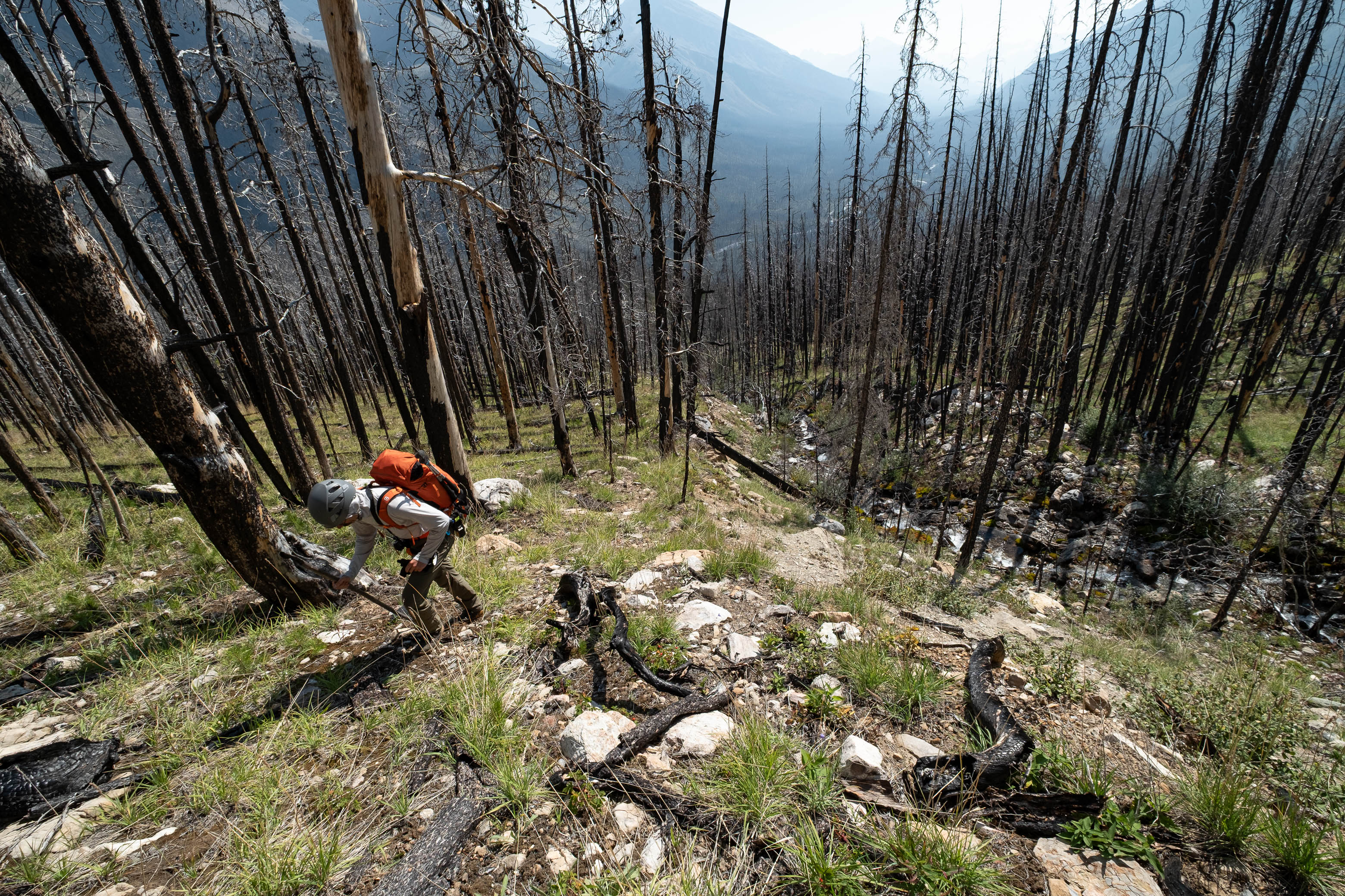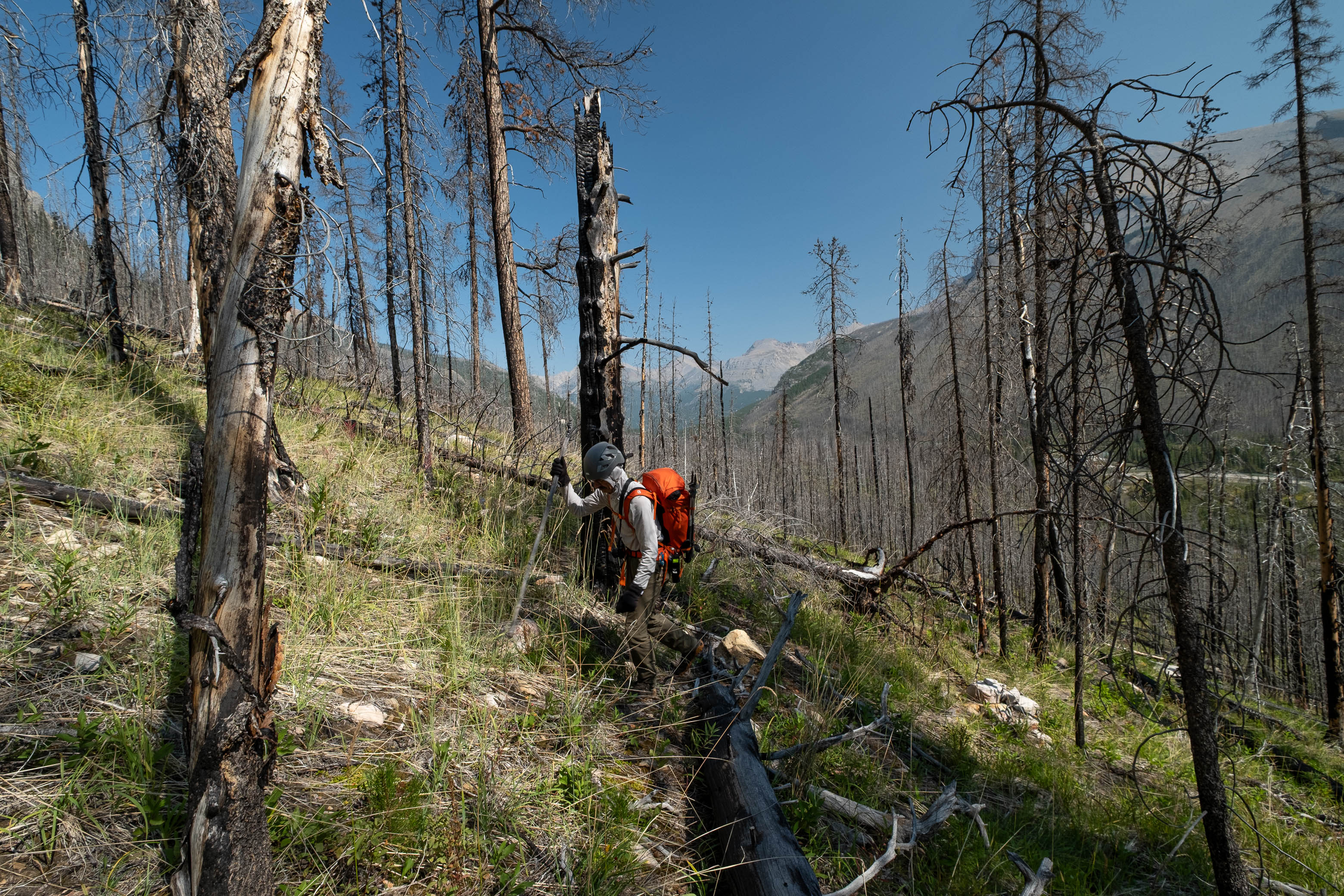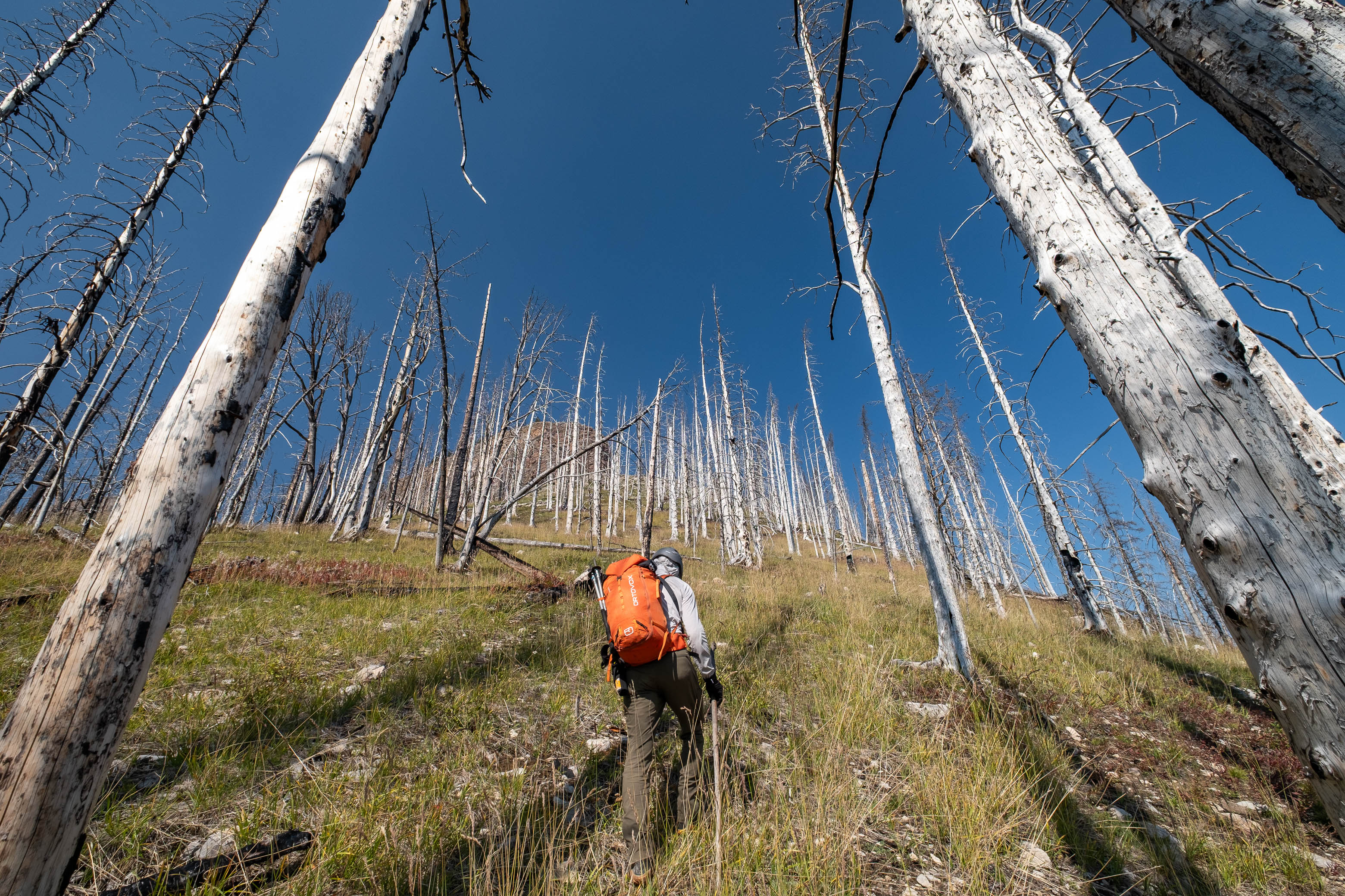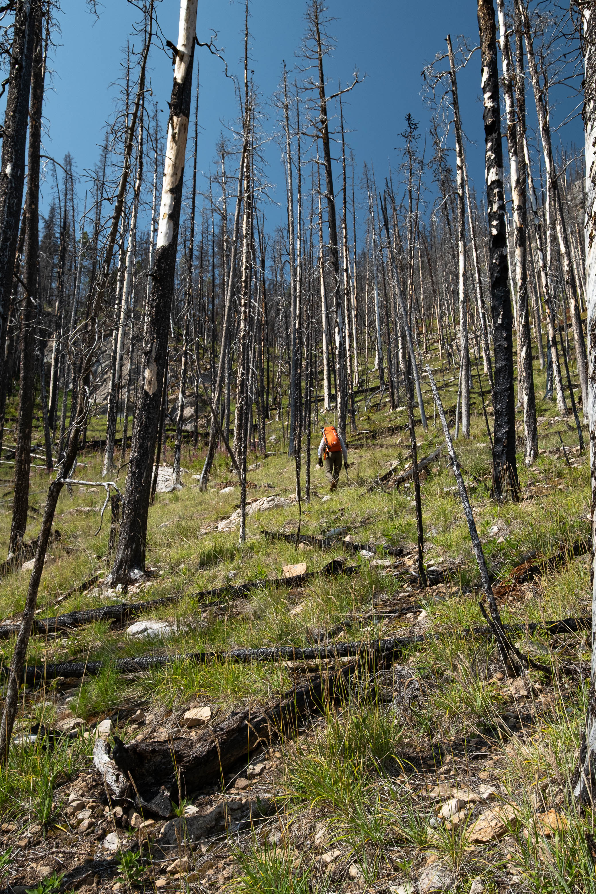 Although still very tight, bushy, and at times hard to follow, the cutline (now having changed direction and traveling SW) started to become more managable once again, and it wasn't long before we were crossing a bubbling stream - our first clean water source and a real lifesaver given the heat of the day - and approaching the aftermath of the 2018 Porcupine Wildfire. Now don't get me wrong, this "trail" was still in absolutely brutal condition as far as trails go, but I'd argue that this approach shouldn't be looked at as the most heinous trail in the world, but rather a lengthy bushwhack, sped up significantly by an invaluable line guiding you through the forest, and saving you hours of aimless, disoriented wandering. Might improve your mood a bit when you're really in the thick of it 😉.