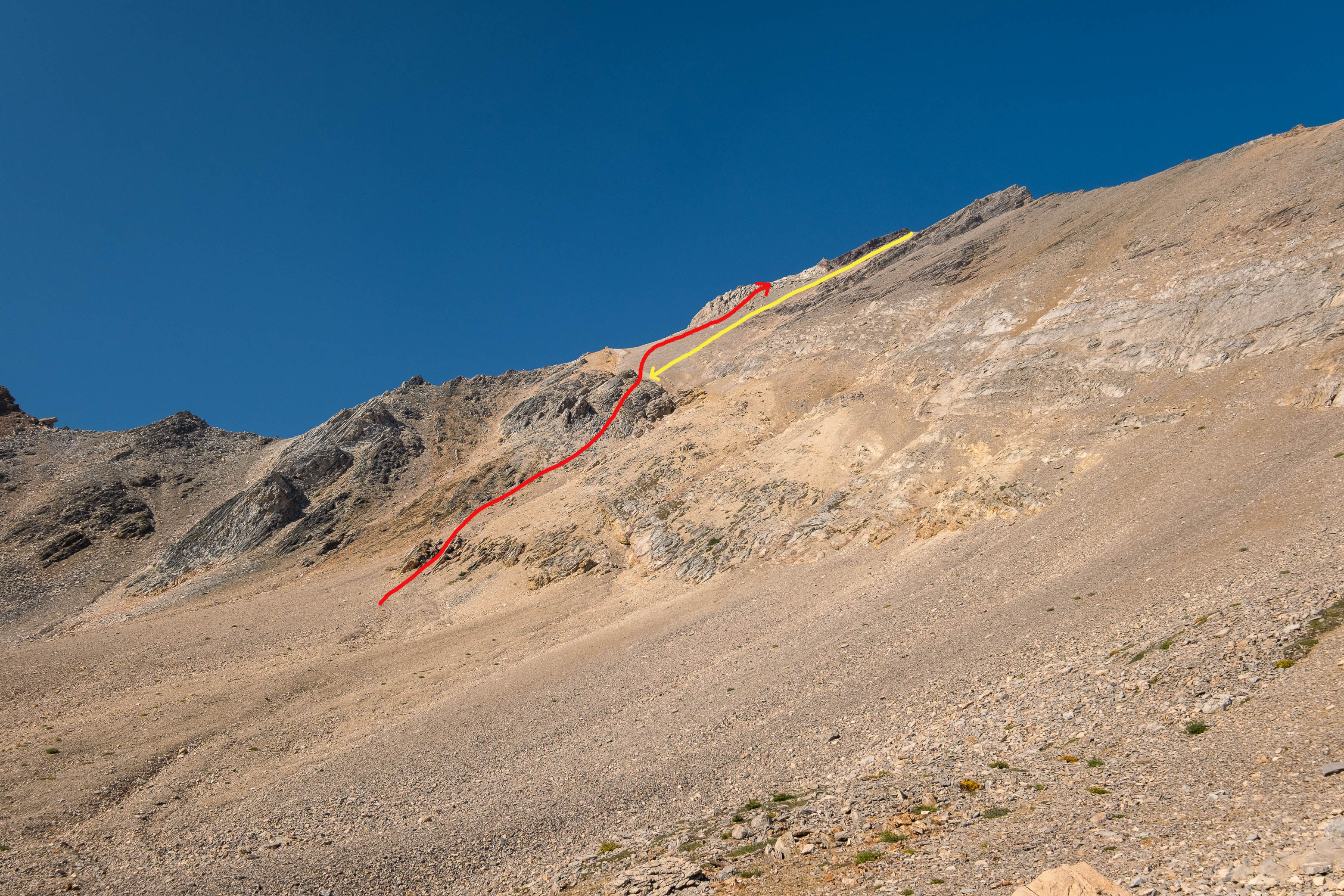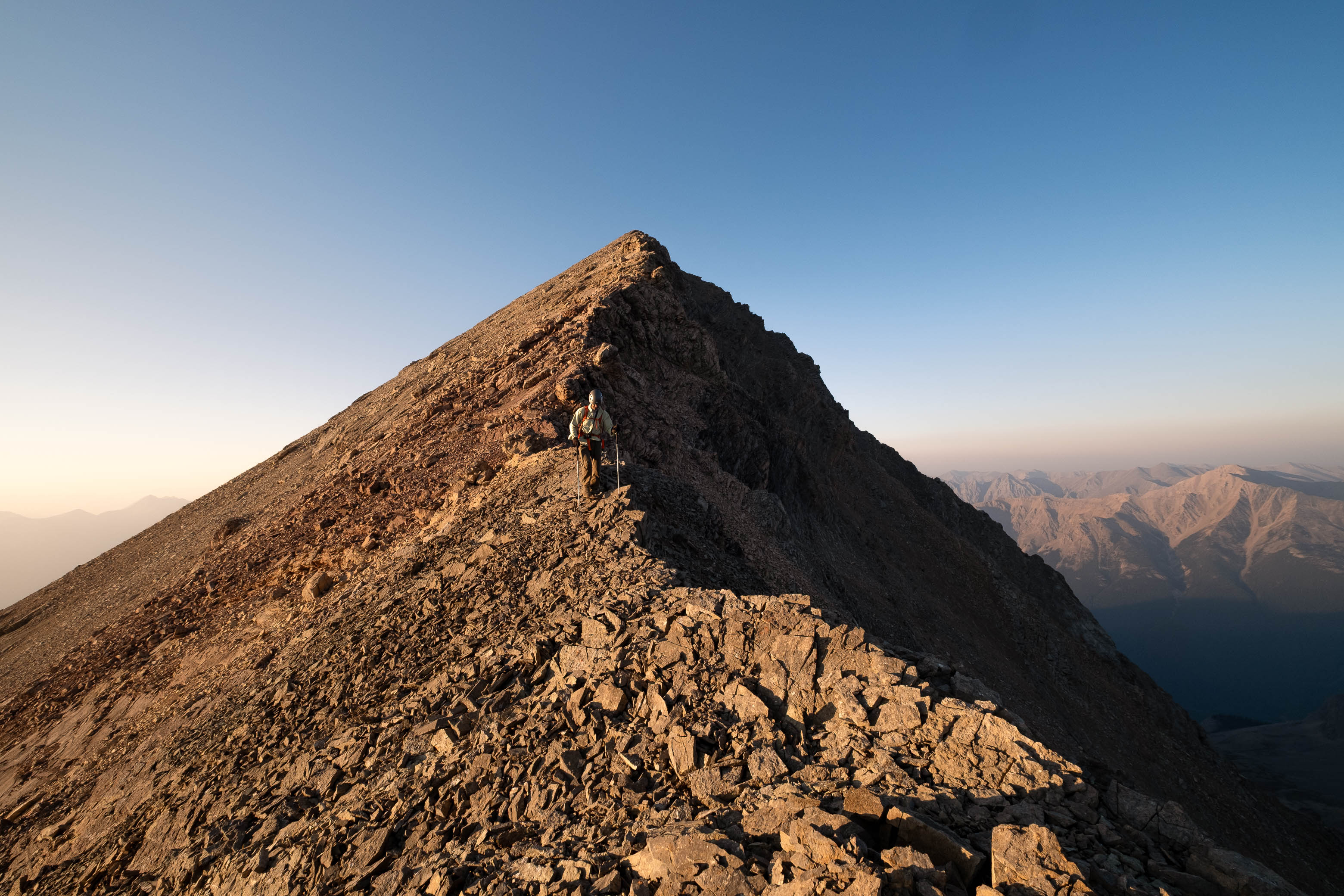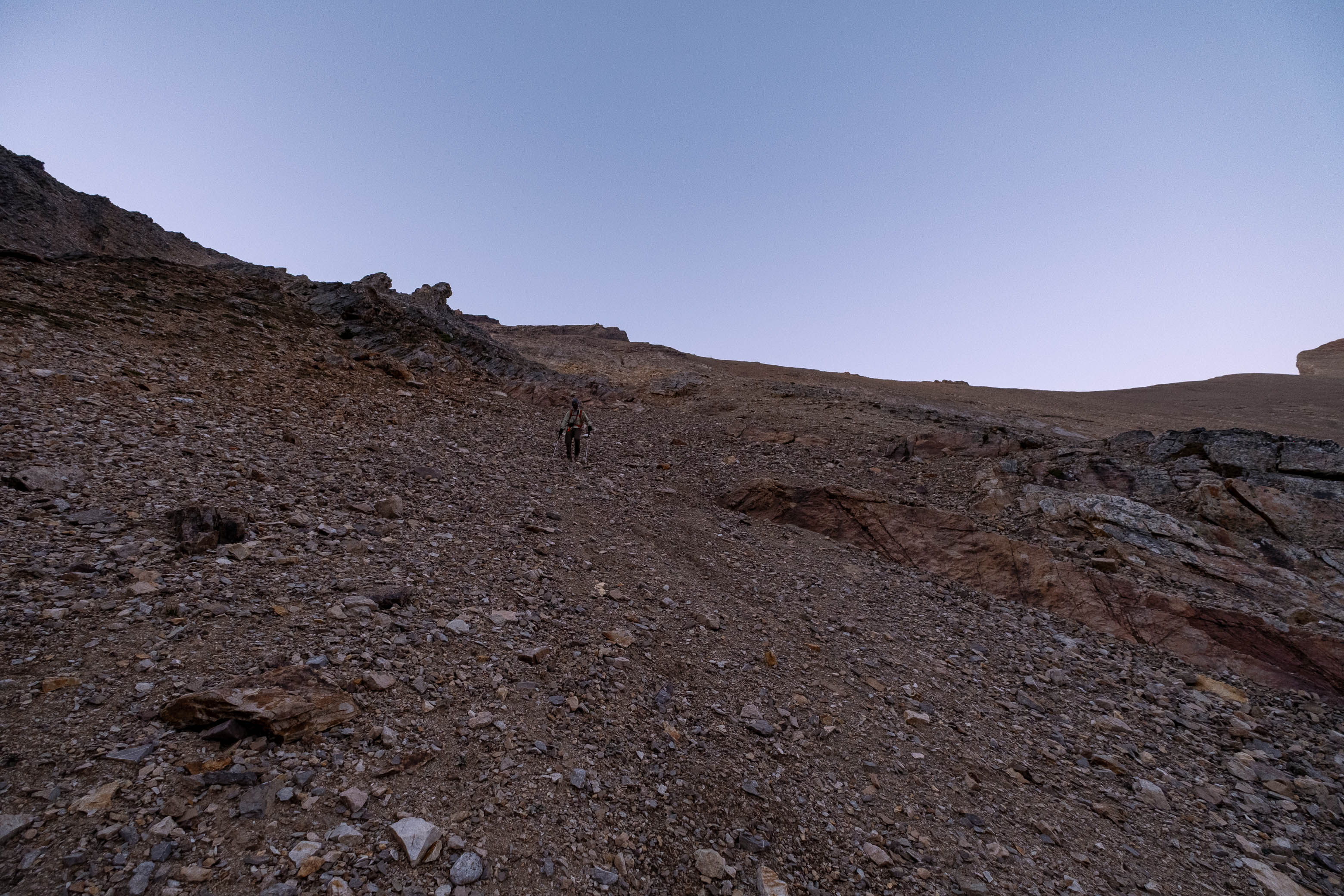 It was painful to watch my dad slowly limp down the summit ridge with the shadows rapidly growing as the sun set behind the mountain tops to the west. Our lengthy summit stay was a nice break from reality, but things were not looking good and I had a feeling we were in for a looong night! When it came time to descend the more solid, knee-jarring rubble slope we'd ascended from the col, I knew I had to find another option and was relieved to discover an incredible scree run by continuing down the summit ridge just a few meters south of our ascent line.
