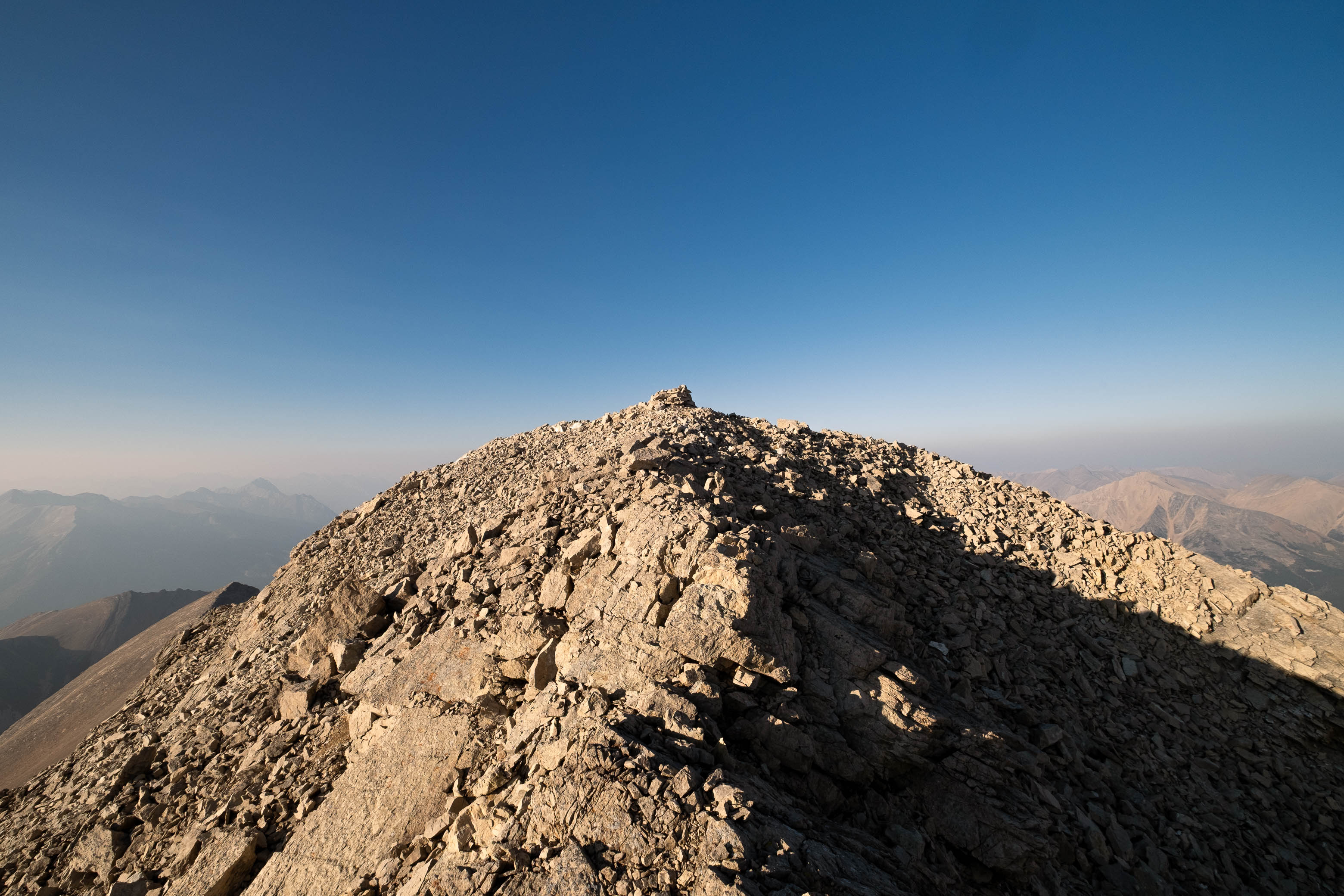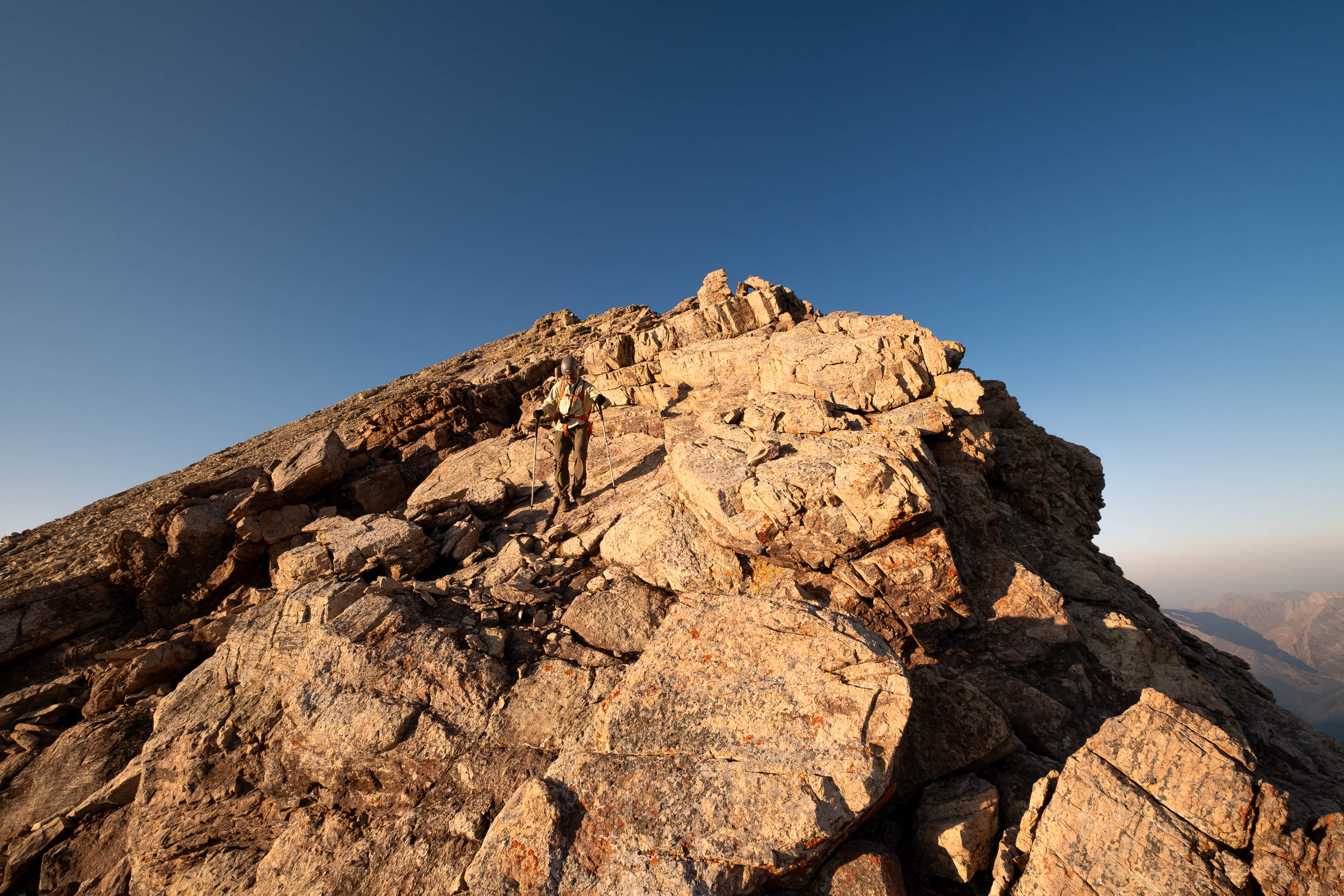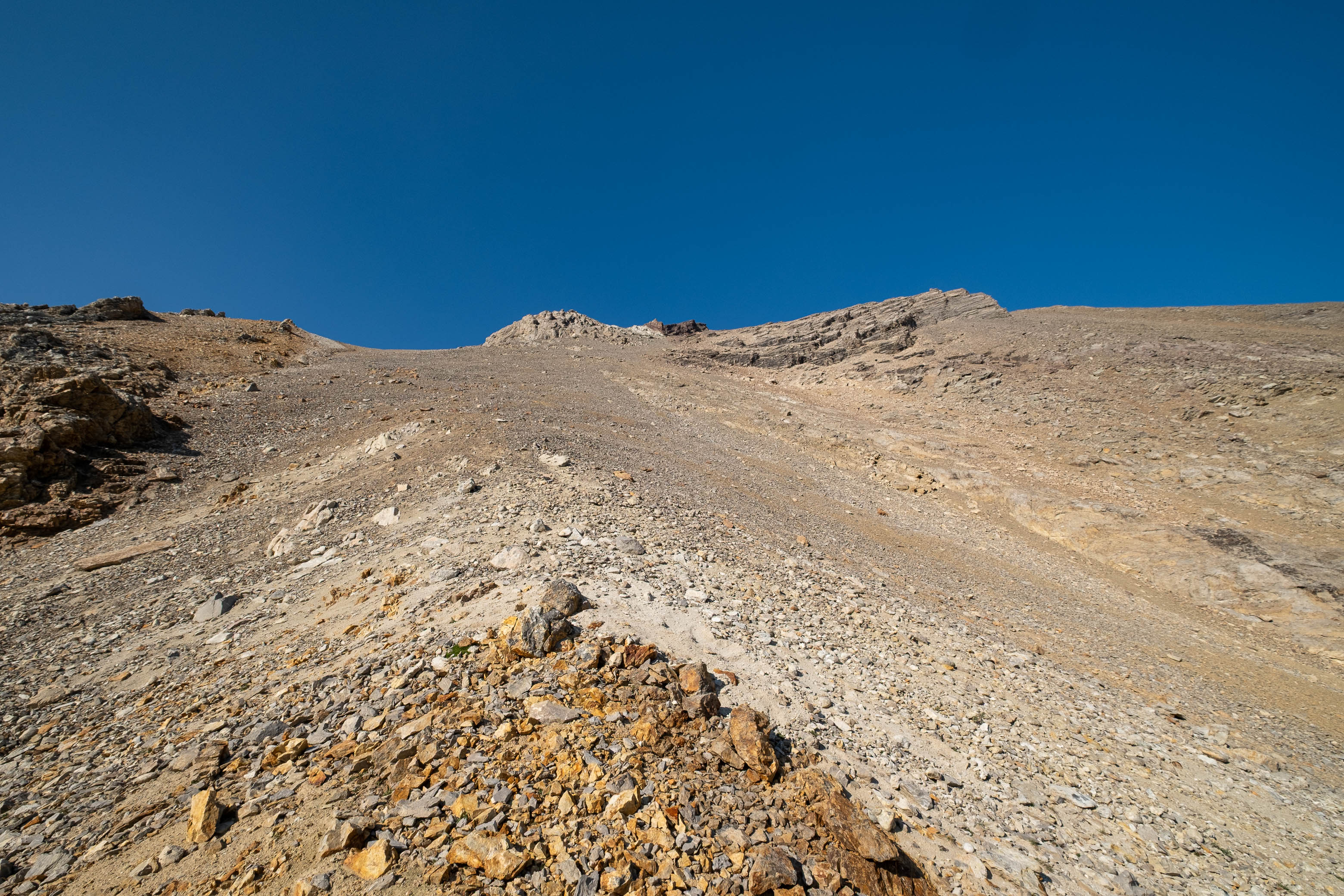 It was painful to watch my dad slowly limp down the summit ridge with the shadows rapidly growing as the sun set behind the mountain tops to the west. Our lengthy summit stay was a nice break from reality, but things were not looking good and I had a feeling we were in for a looong night! When it came time to descend the more solid, knee-jarring rubble slope we'd ascended from the col, I knew I had to find another option and was relieved to discover an incredible scree run by continuing down the summit ridge just a few meters south of our ascent line.