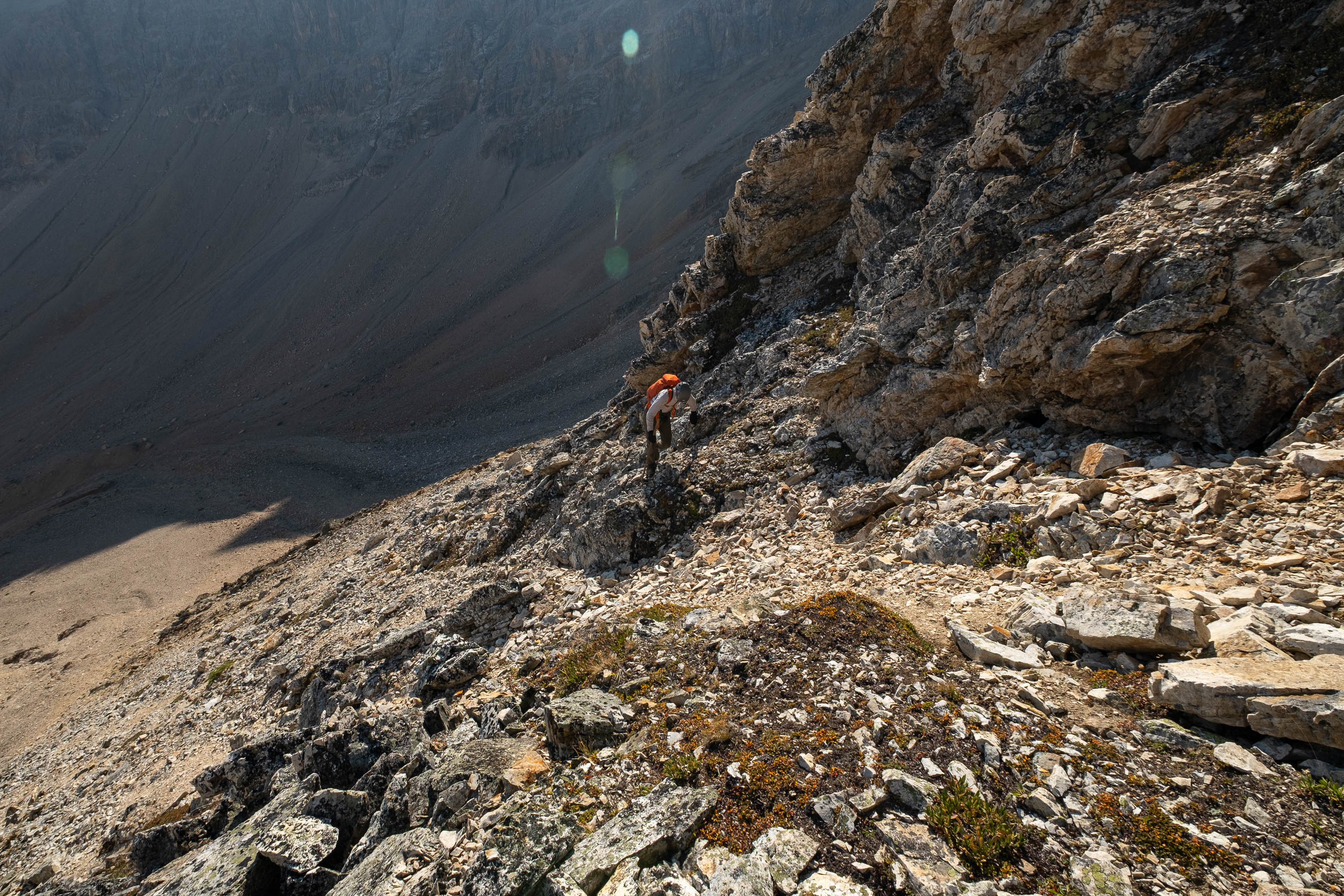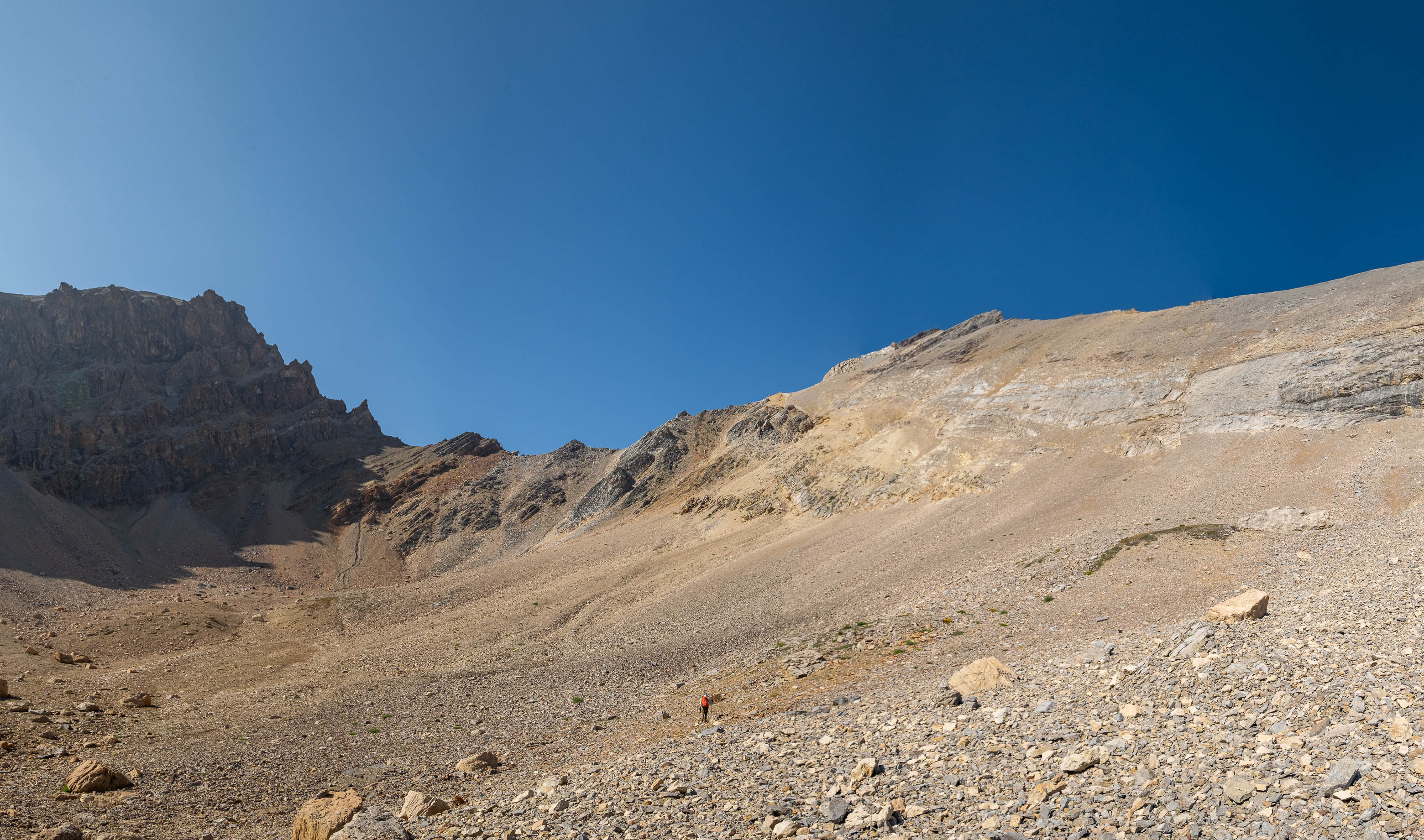 I couldn't help but wonder how many people had set foot in this valley throughout history and felt so incredibly lucky to be experiencing such a wild and remote landscape as we continued towards Siffleur's foreshortened scree ascent slopes - I would've been absolutely on top of cloud nine had it not been for my dad's misfortune. His knee had started causing him trouble during the sidehill and his pace had now slowed significantly. It was already 16:00 as we started up the hanging valley and with still over 800 m to go I was starting to get a little bit worried....Luckily we'd lugged all our camp "supplies" up this far, so it's not like we had to make it all the way back down to the Siffleur River that evening like I had originally planned, but we still had a ways to go nonetheless, and we dropped some of our gear at the last nice grassy "camp spot" to save us some weight and hopefully help my dad out a bit for the final climb.
