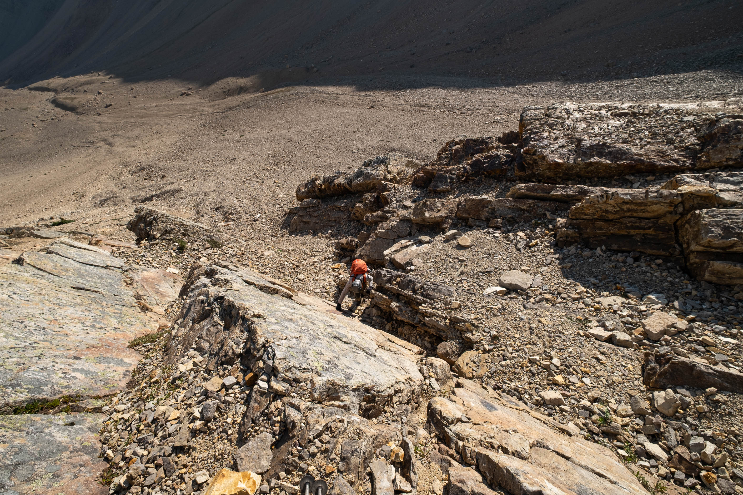 Eventually we reached the rocky outcrop blocking the ridge and followed in Vern and Wietse's footsteps, traversing around it to climber's right. I can't say that sidehilling across these steep grassy slopes was the most enjoyable, but at least we were in the shade for the first time in hours...so that was nice!