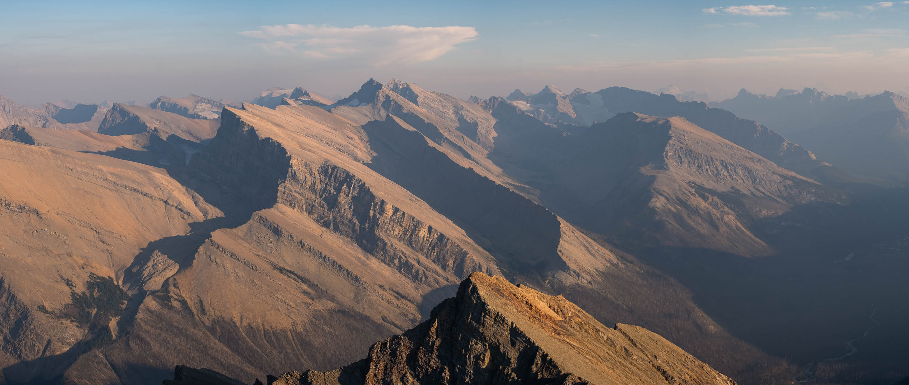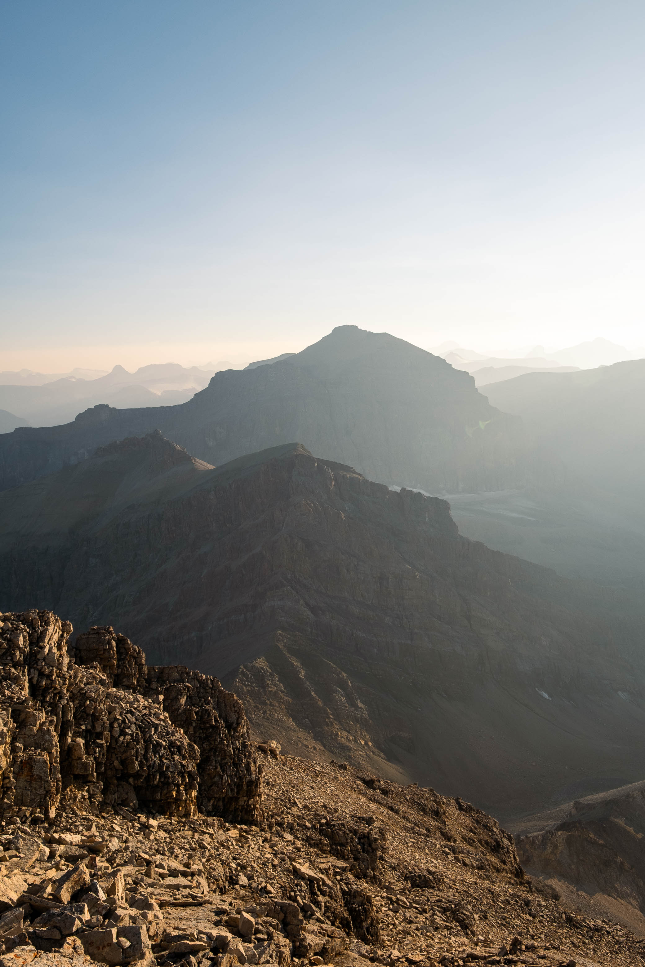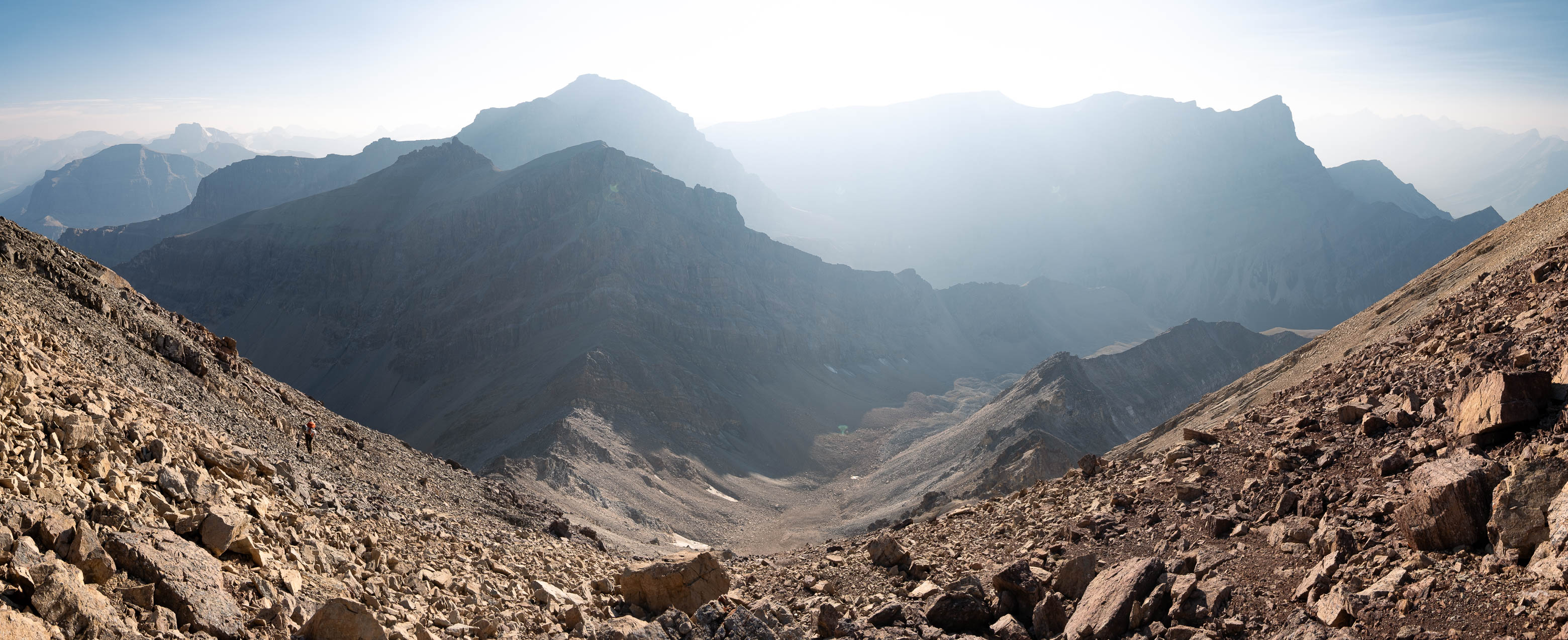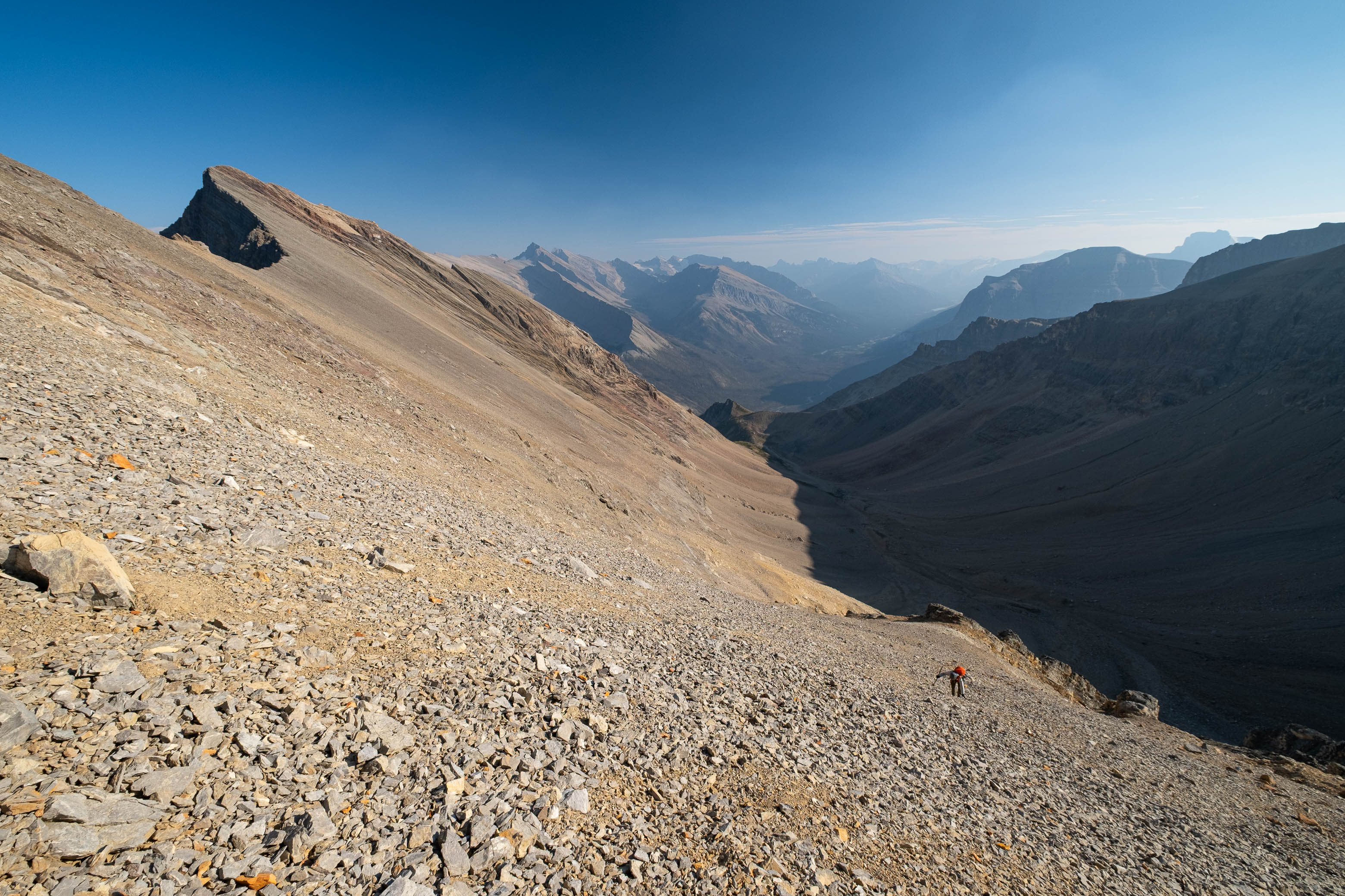 I have two words for the last big climb up this mountain - long and loose! I tried to lead the way up as much solid slab and as little loose scree as possible, but there was just no avoiding the treadmill entirely, and although we've been up much worse, it was obvious that my dad was struggling. Eventually we topped out onto slightly more solid rubble slopes, high above the col between Siffleur and an unnamed outlier to the west, and continued steeply up to the summit ridge. Hazey views back to the silhouetted forms of Loudon and Peskett continued to improve the higher we climbed and an incredible drop off the east side of the summit ridge kept us alert as we grunted up the final 100 meters to Siffleur's lofty apex.