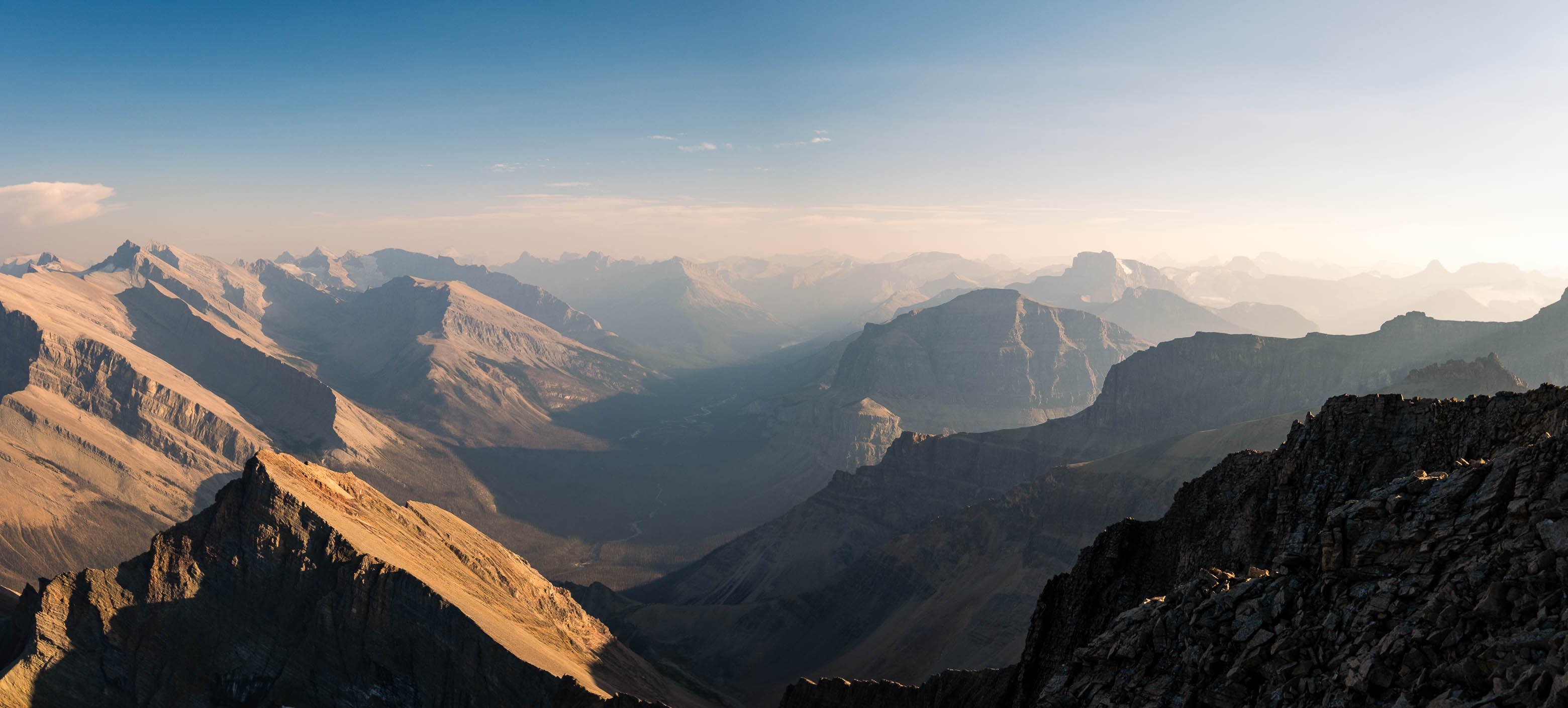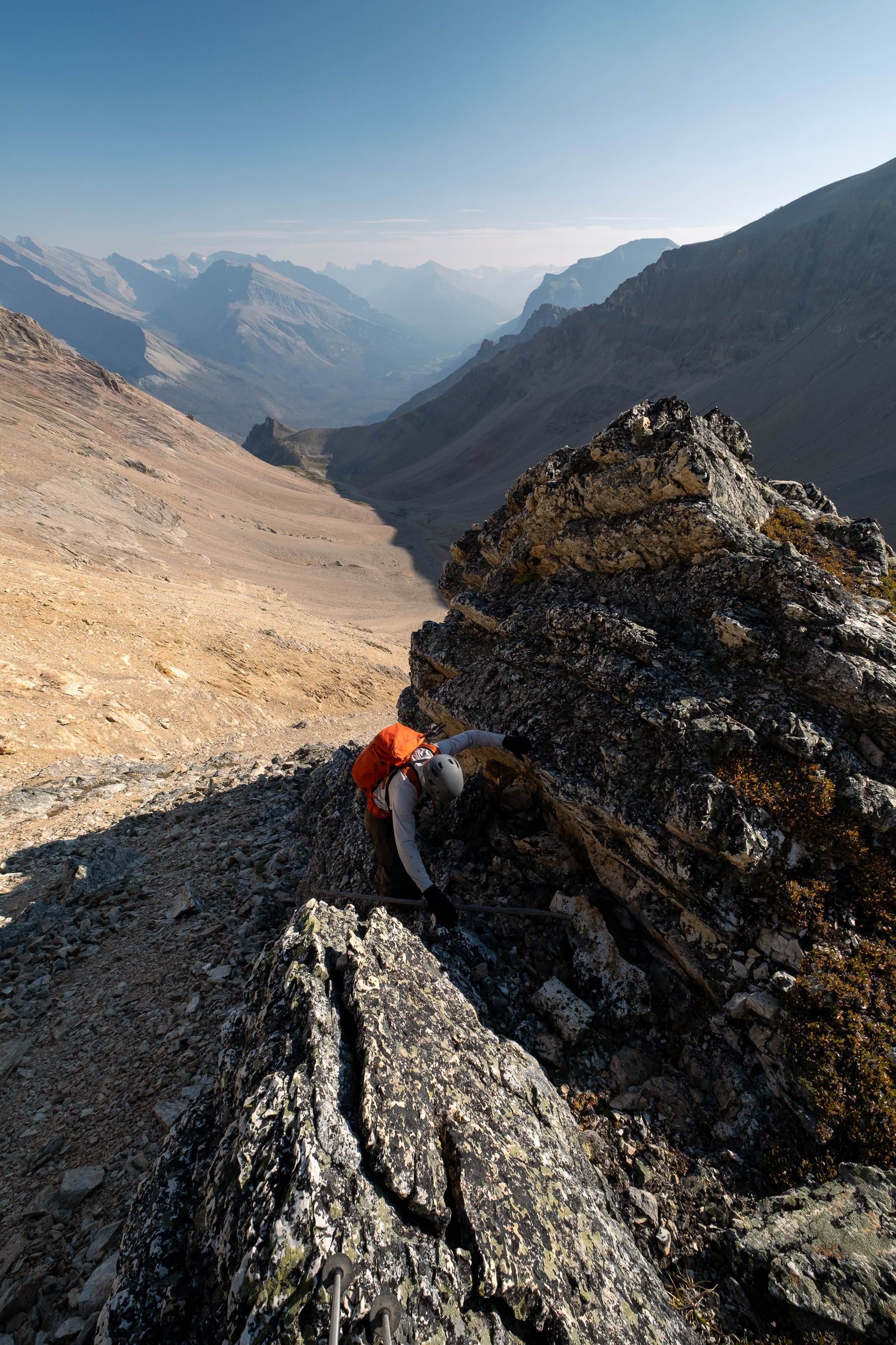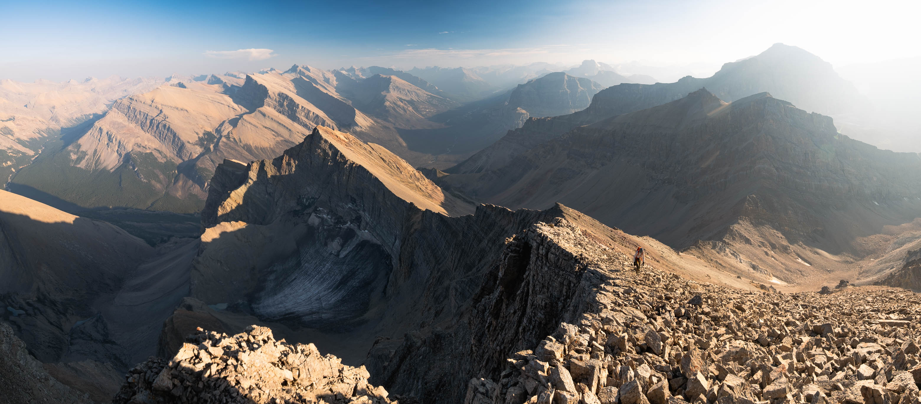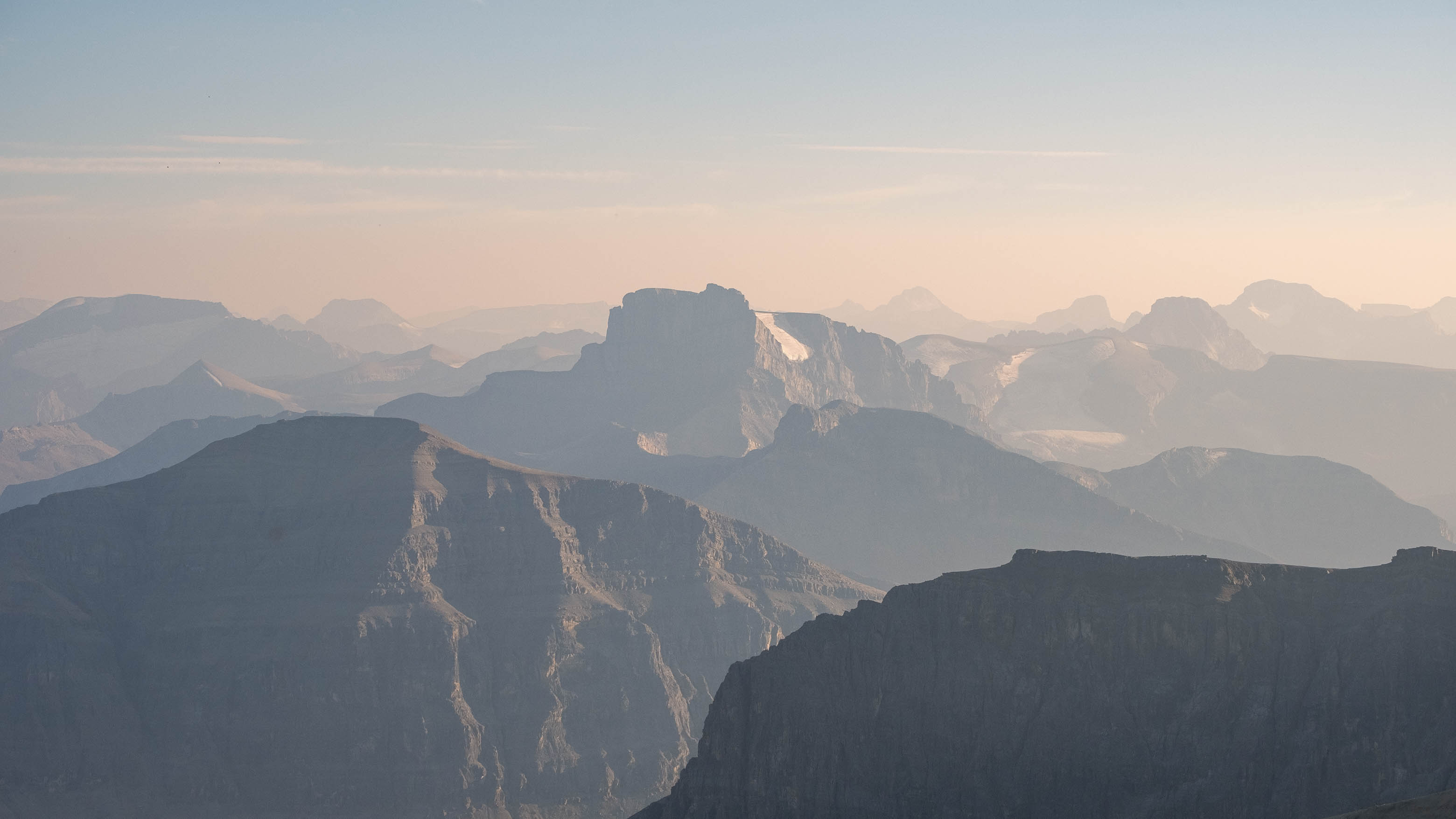 I have two words for the last big climb up this mountain - long and loose! I tried to lead the way up as much solid slab and as little loose scree as possible, but there was just no avoiding the treadmill entirely, and although we've been up much worse, it was obvious that my dad was struggling. Eventually we topped out onto slightly more solid rubble slopes, high above the col between Siffleur and an unnamed outlier to the west, and continued steeply up to the summit ridge. Hazey views back to the silhouetted forms of Loudon and Peskett continued to improve the higher we climbed and an incredible drop off the east side of the summit ridge kept us alert as we grunted up the final 100 meters to Siffleur's lofty apex.