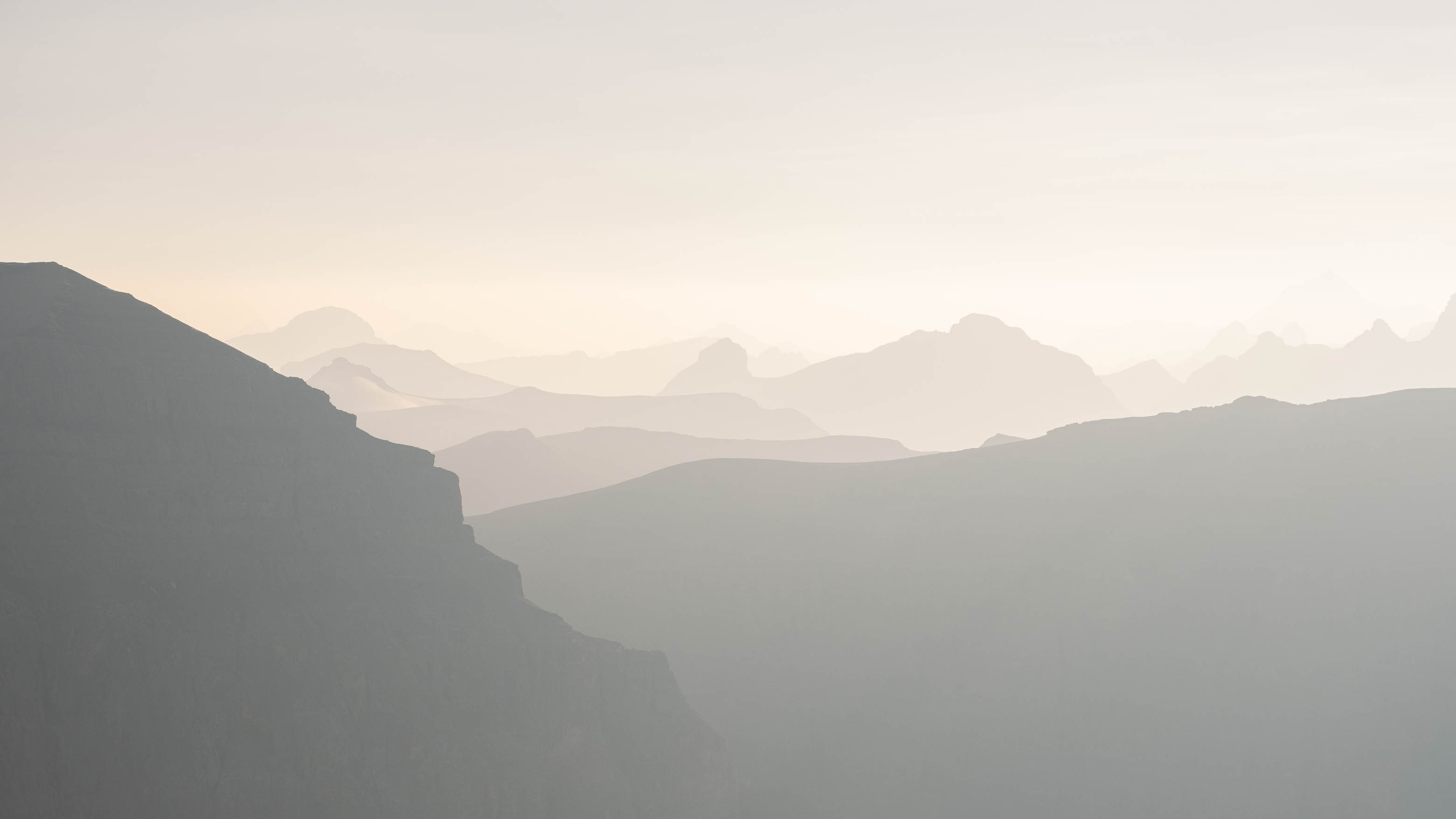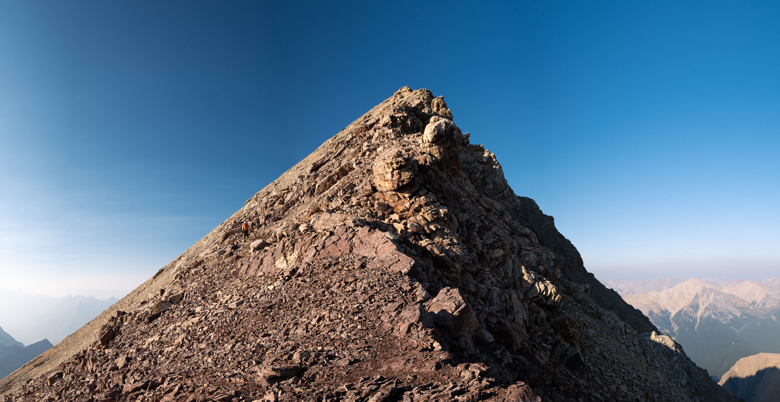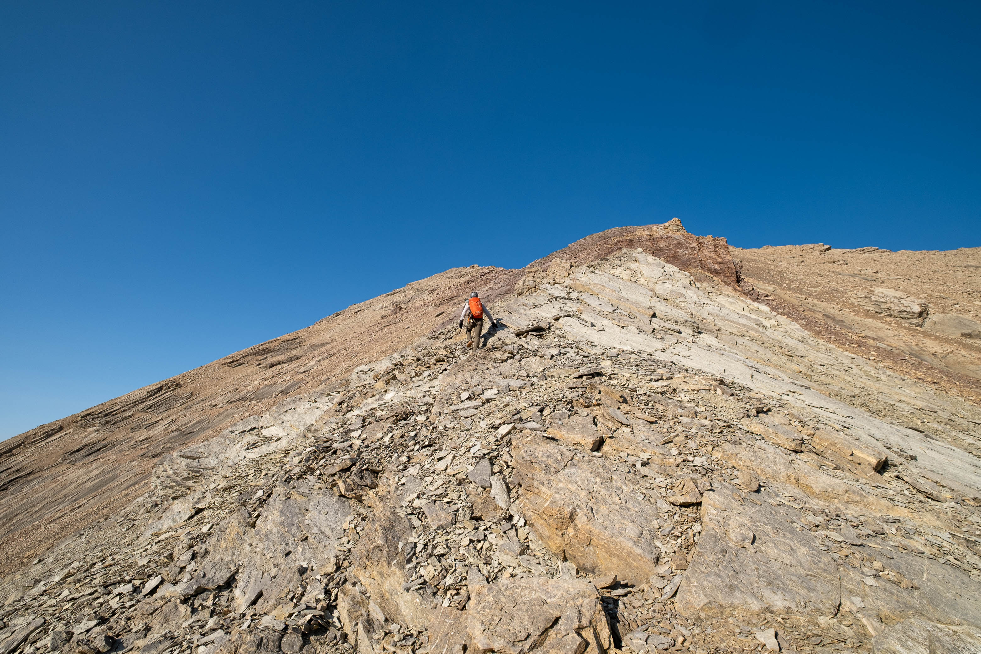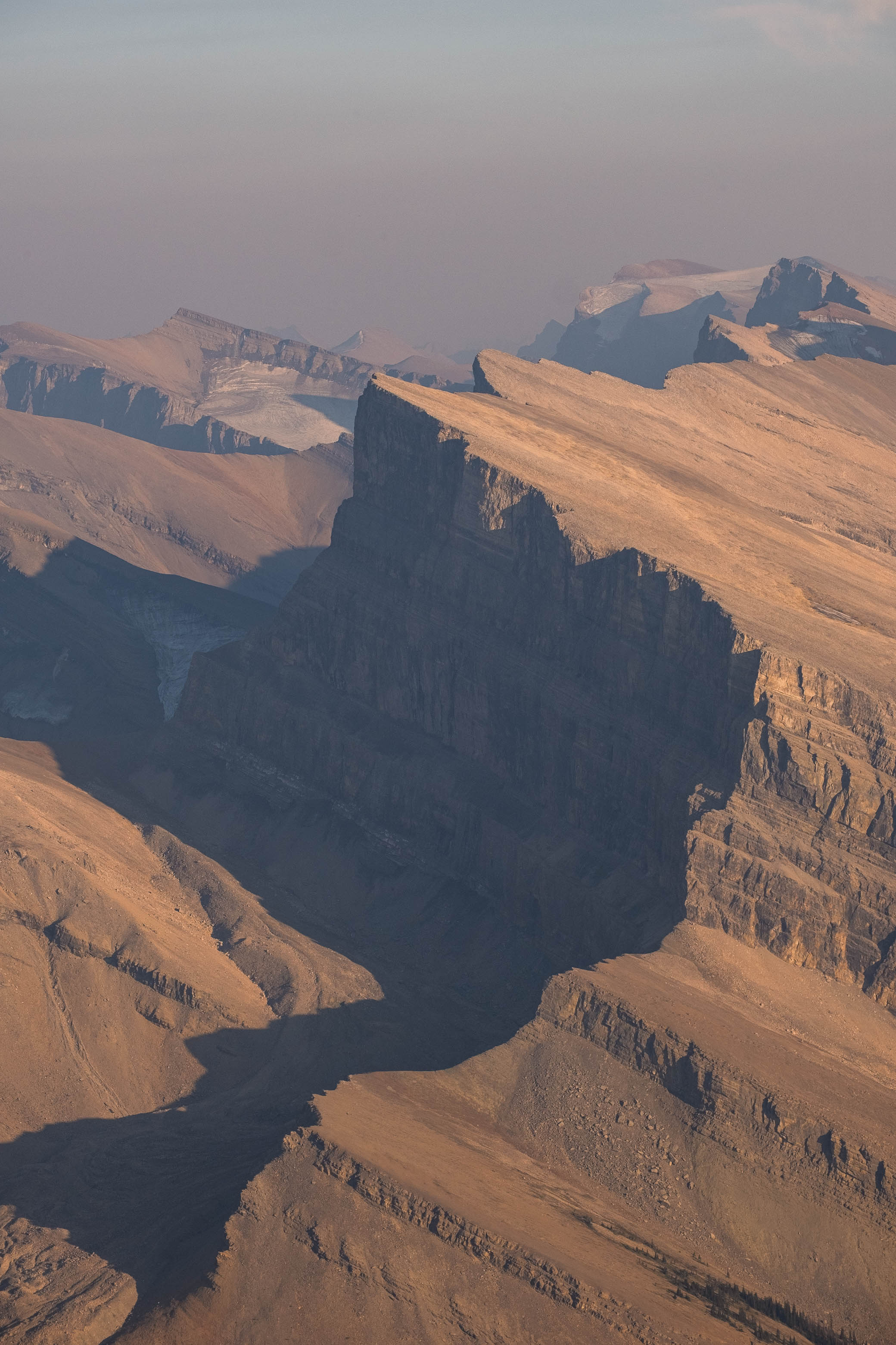I have two words for the last big climb up this mountain - long and loose! I tried to lead the way up as much solid slab and as little loose scree as possible, but there was just no avoiding the treadmill entirely, and although we've been up much worse, it was obvious that my dad was struggling. Eventually we topped out onto slightly more solid rubble slopes, high above the col between Siffleur and an unnamed outlier to the west, and continued steeply up to the summit ridge. Hazey views back to the silhouetted forms of Loudon and Peskett continued to improve the higher we climbed and an incredible drop off the east side of the summit ridge kept us alert as we grunted up the final 100 meters to Siffleur's lofty apex.