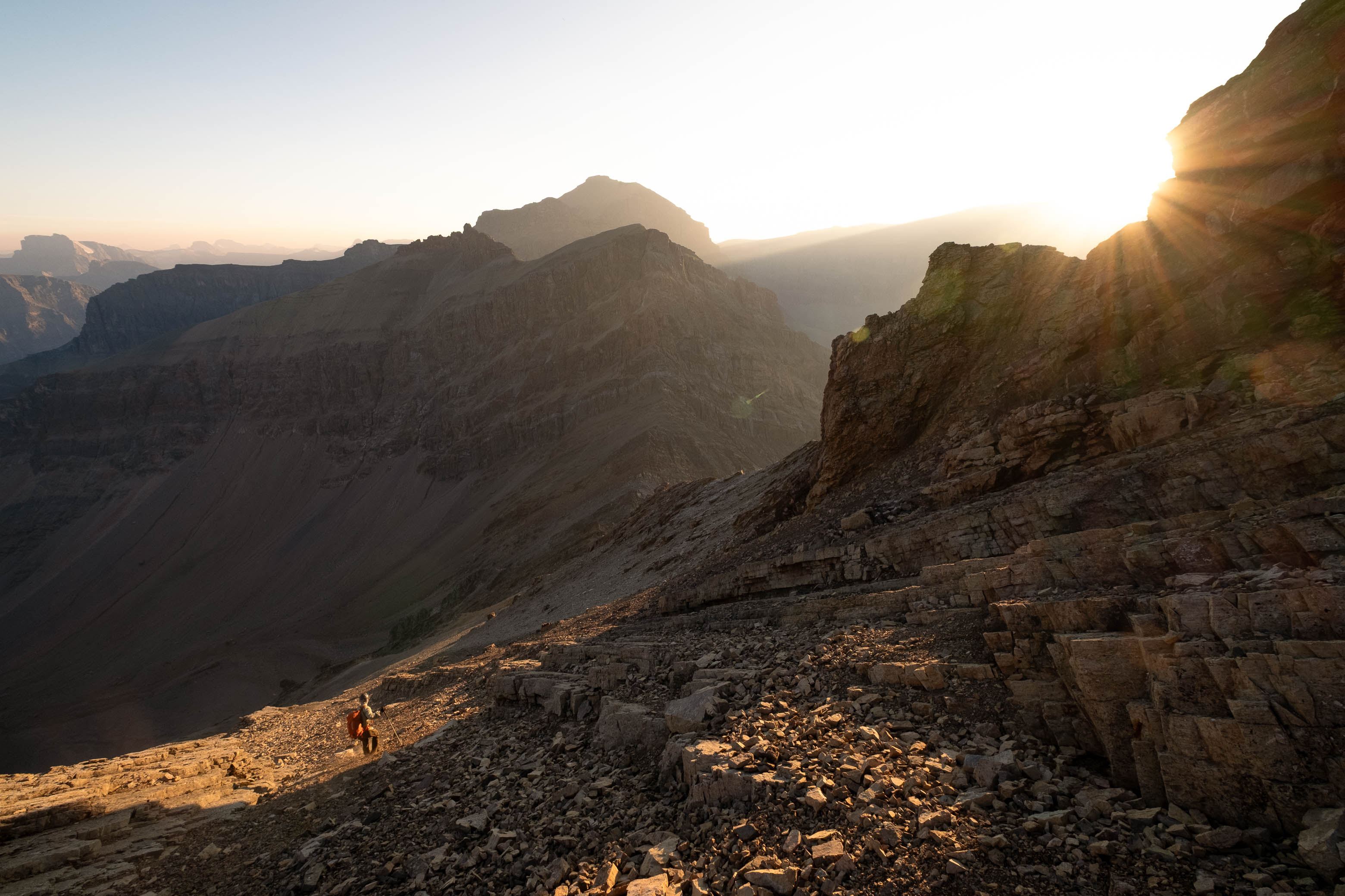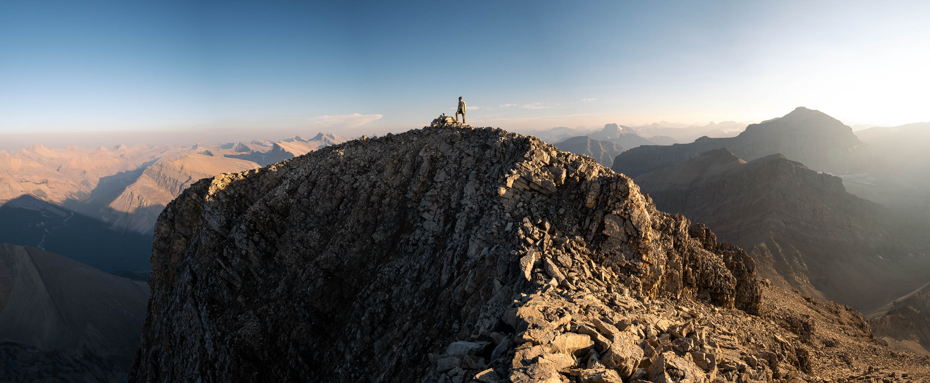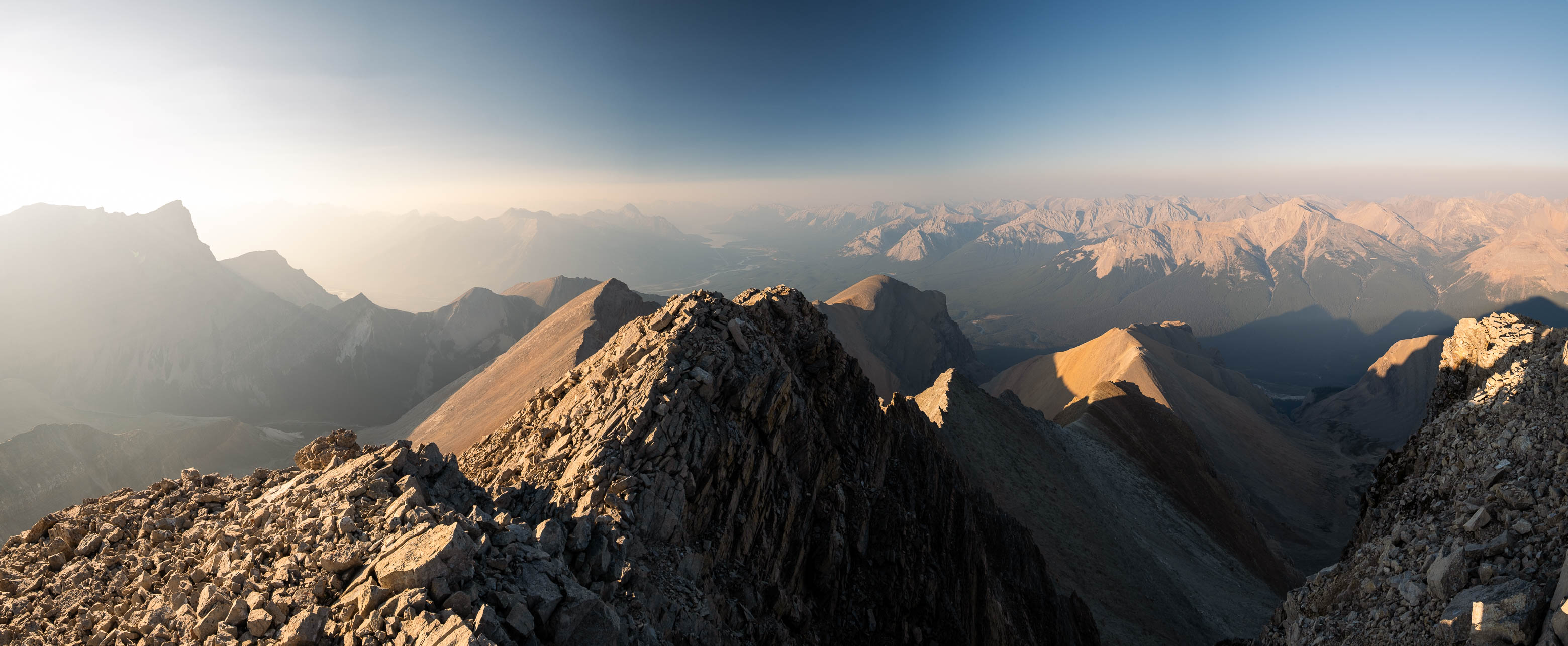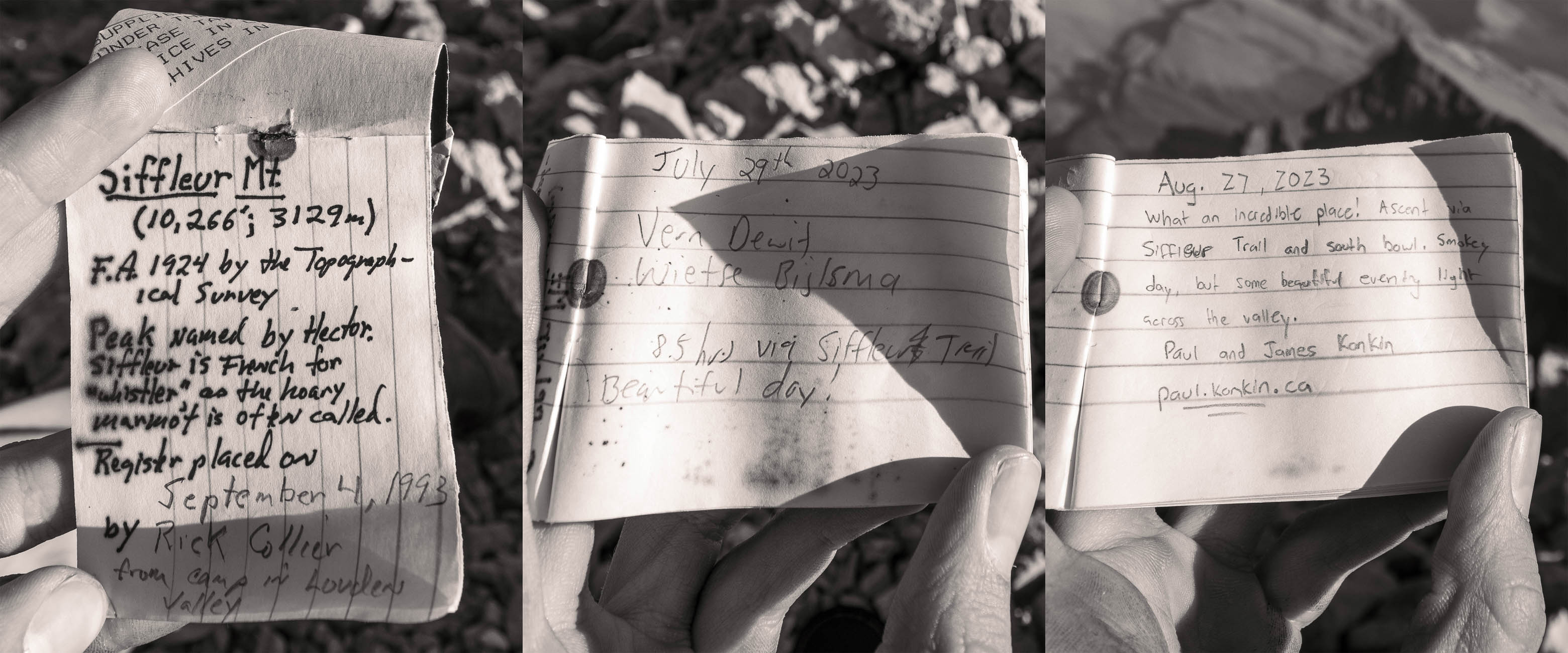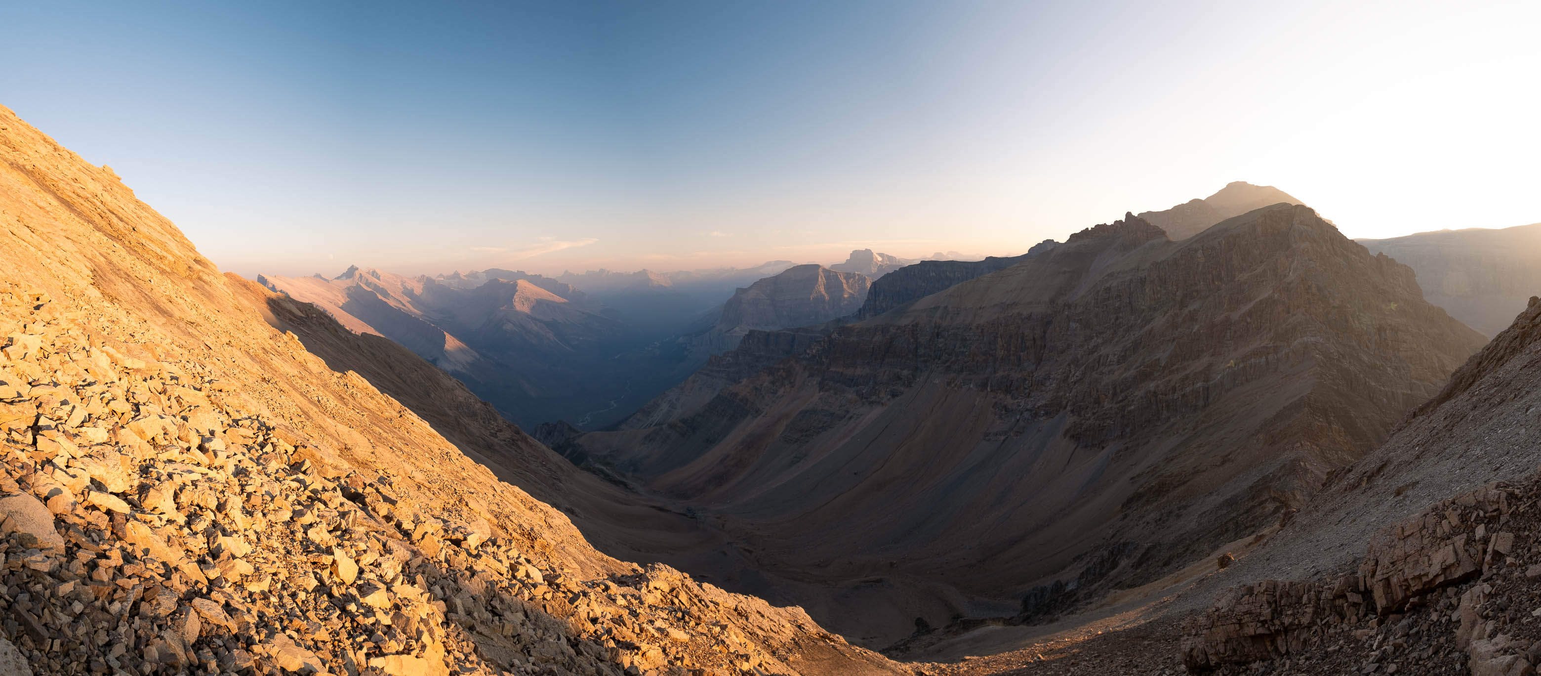 Thanks to our significantly slowed pace, the sun was already starting to set as we reached the summit cairn - its warm golden rays cutting through the haze and casting long shadows across the valley. Not exactly the position I planned to be in, but how could I complain...It was absolutely stunning! I eagerly flipped through the register placed 30 years ago by Rick Collier, containing only three entries to date - 1924 F.A. by Topographical Survey, 1993 Rick Collier, 2023 Vern Dewit and Wietse Bijlsma - and while I just barely missed being the first one to crack it open since it was placed, being the fourth recorded ascent is still pretty darn cool and it was impossible to be upset considering the valuable beta I'd gained from Vern's report.