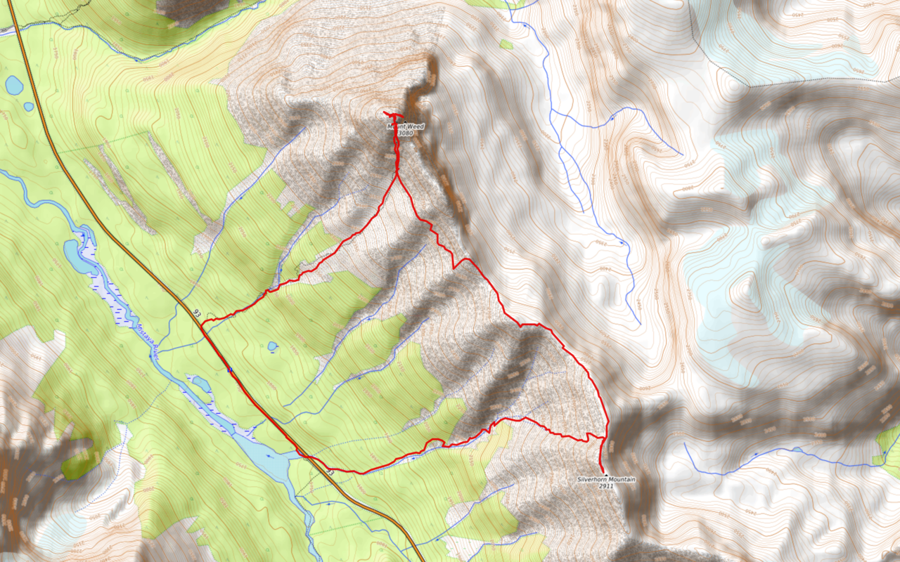 Standing on the top of Mount Weed, I Initially thought there might be an option to drop halfway down the ascent gully, and then traverse left to the ridge. I was hoping we might find a way down to the east side of the ridge that would take us to Silverhorn with less elevation loss. Upon further analysis of the ridge from the east end of Weed's summit however, it looked like the east side of the ridge cliffed out. Our only option would be to see if we could find a route traversing the slopes on the west side of the ridge, once we'd lost all the elevation to the bottom of Weed's steep ascent gully!