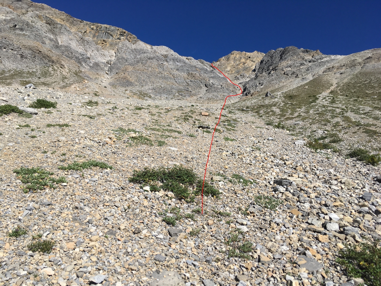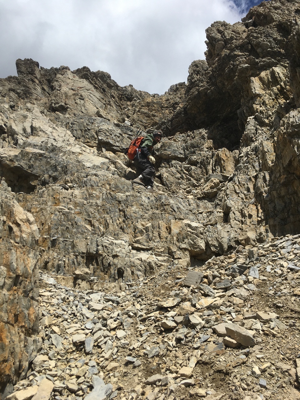 At the base of the gully, just before starting the traverse! Weed's ascent gully curves up to the left, above my dad.