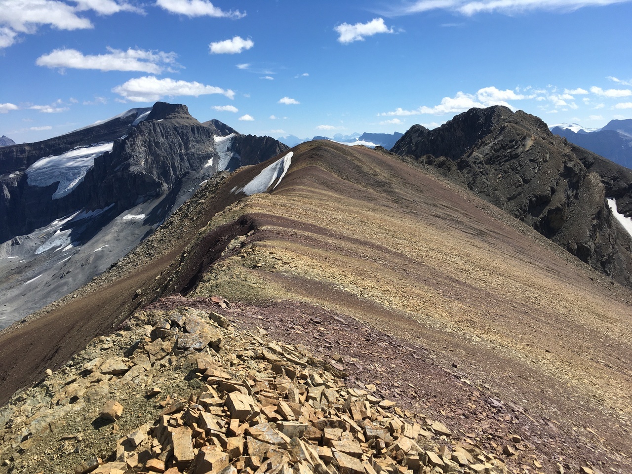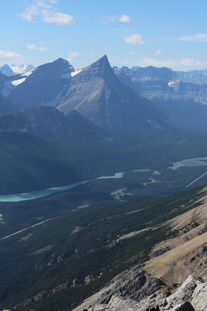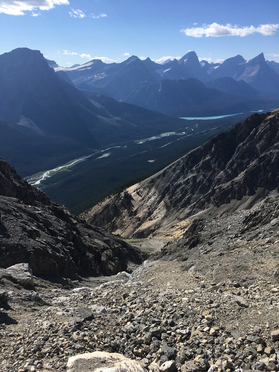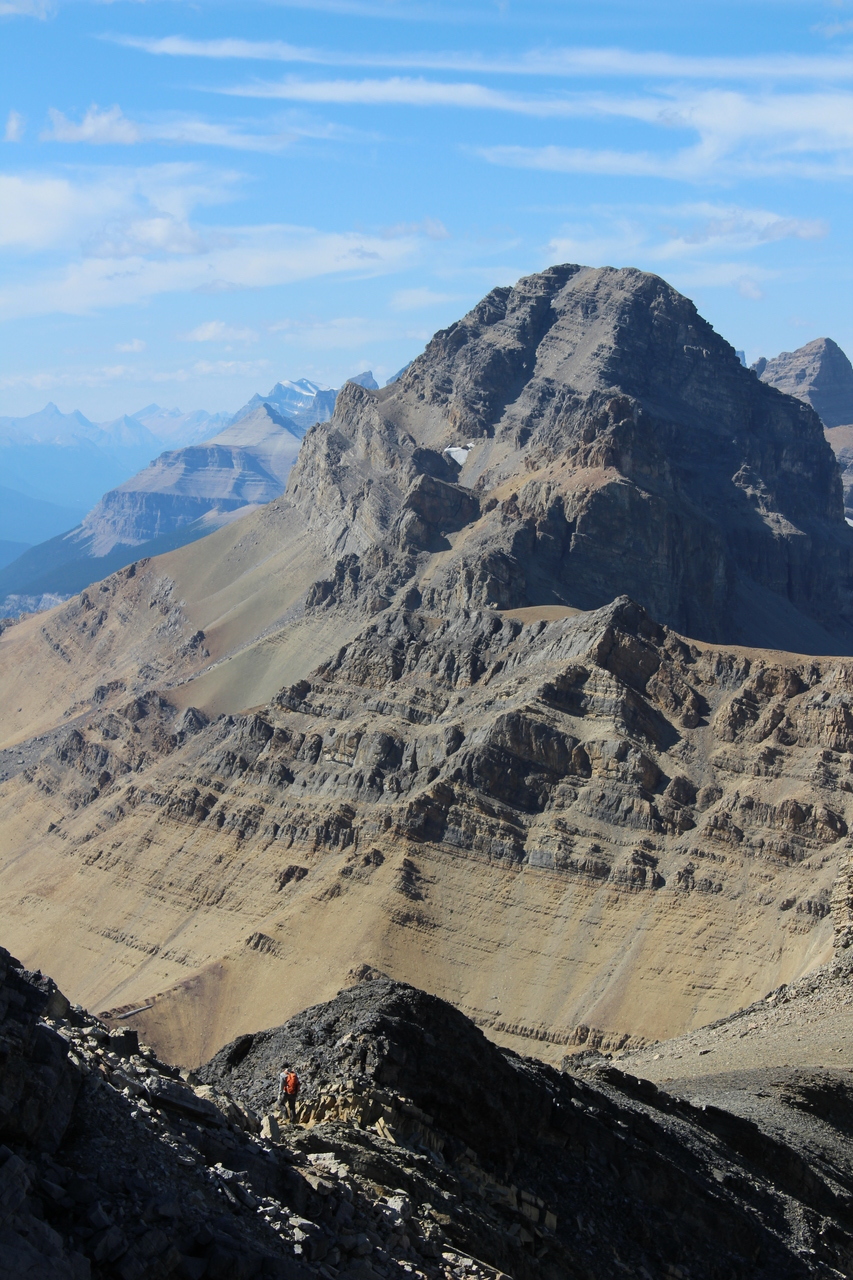 We were up there a few hours ago?! The scramble route we took up Mount Weed sure looks intimidating from here! Bison Peak is the pyramidal shape to the left, with glaciated Wilson in the distance. Mount Noyes can be seen peeking out to the right!