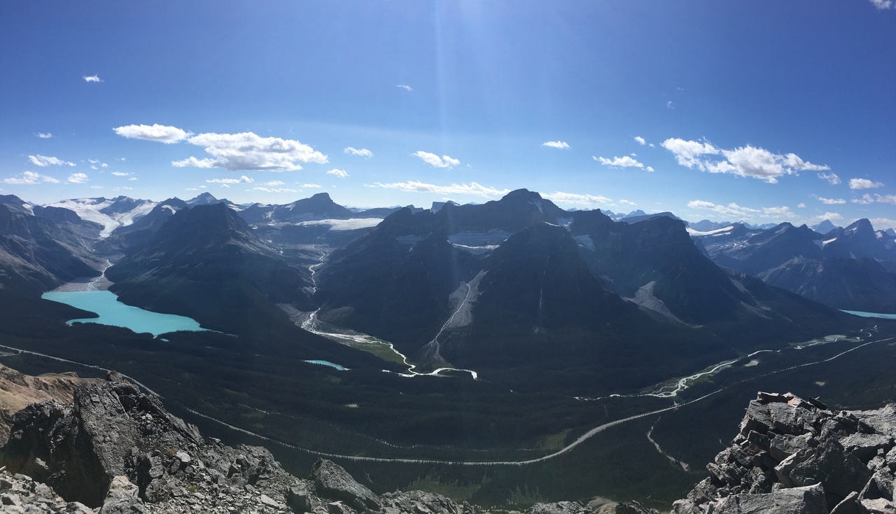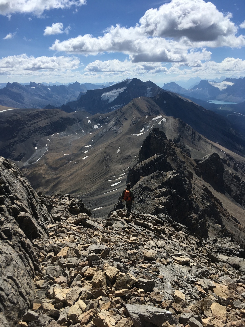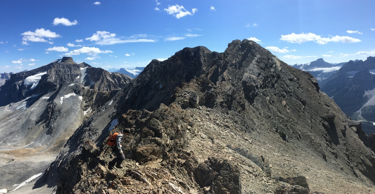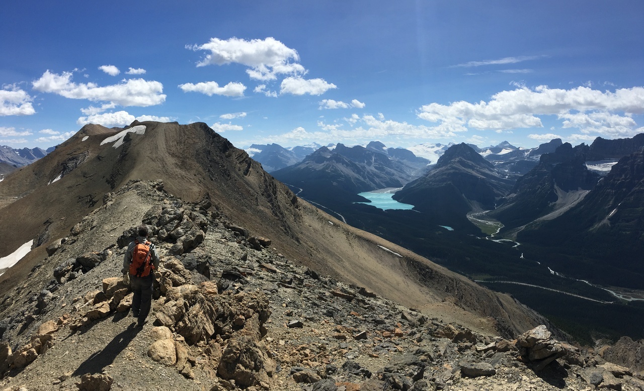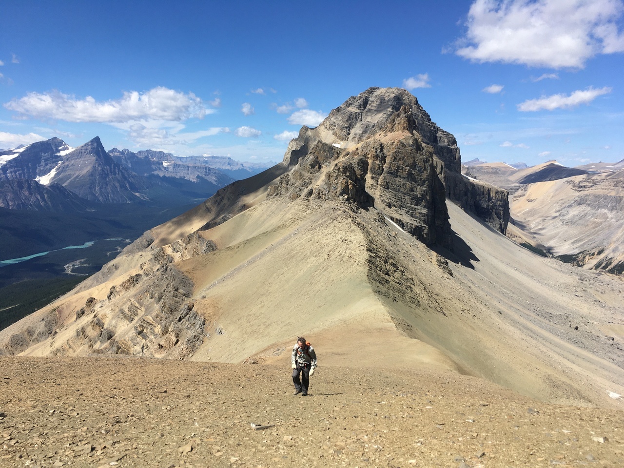 We were up there a few hours ago?! The scramble route we took up Mount Weed sure looks intimidating from here! Bison Peak is the pyramidal shape to the left, with glaciated Wilson in the distance. Mount Noyes can be seen peeking out to the right!