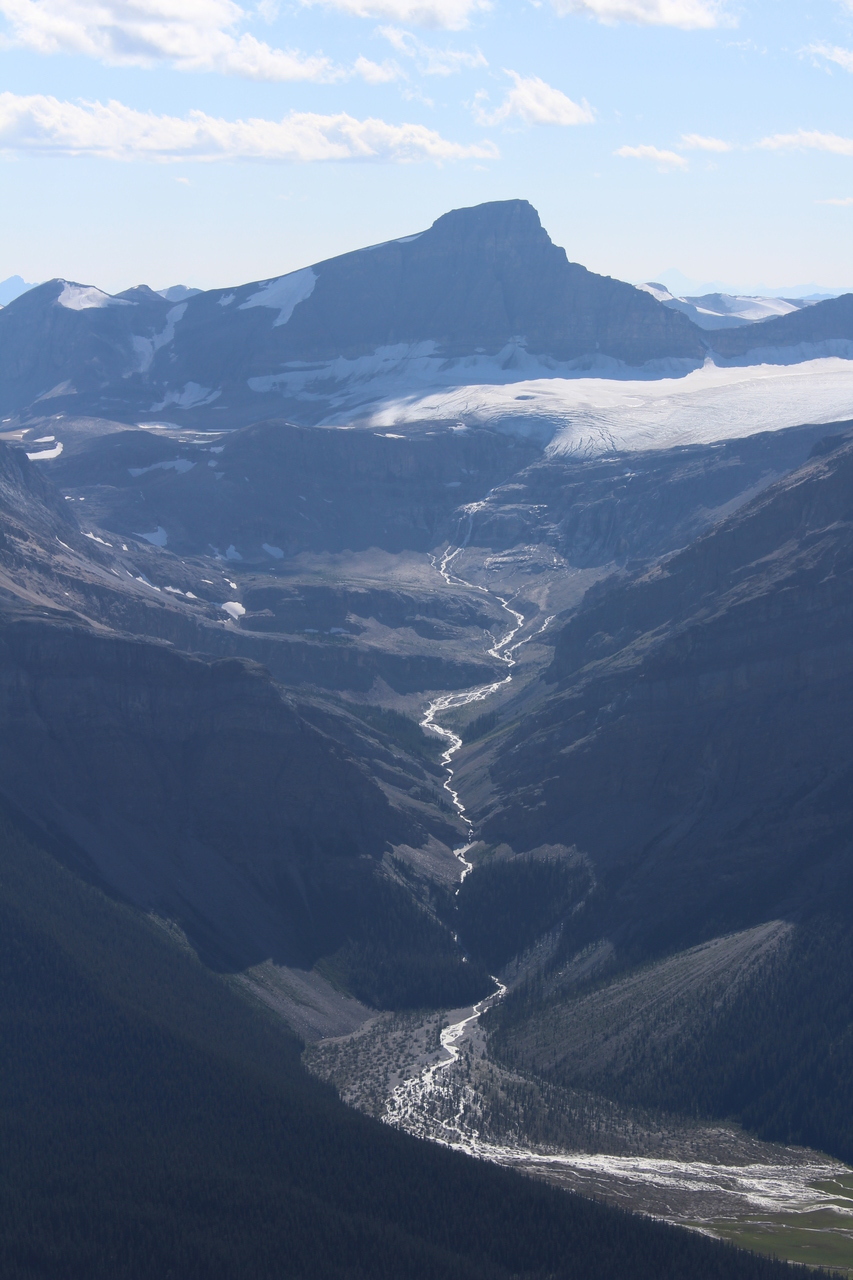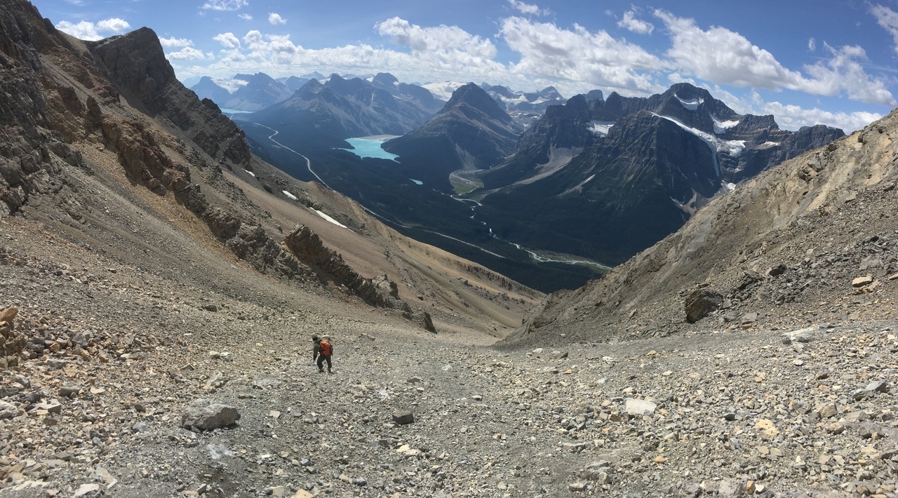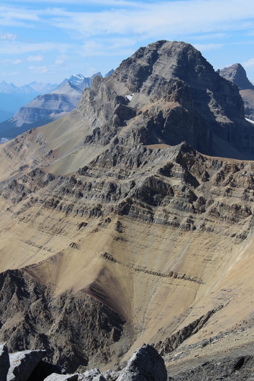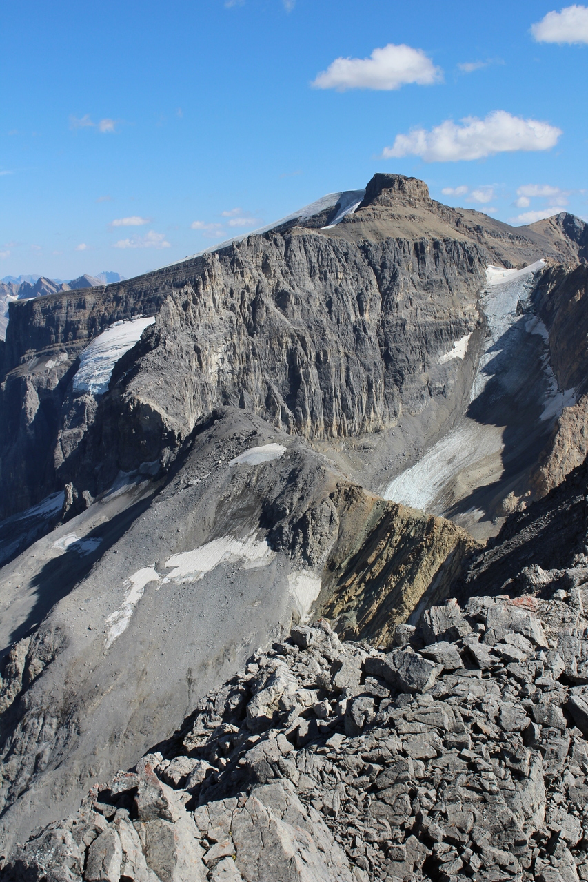 We were up there a few hours ago?! The scramble route we took up Mount Weed sure looks intimidating from here! Bison Peak is the pyramidal shape to the left, with glaciated Wilson in the distance. Mount Noyes can be seen peeking out to the right!