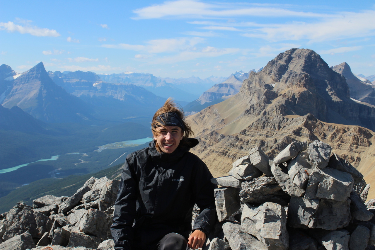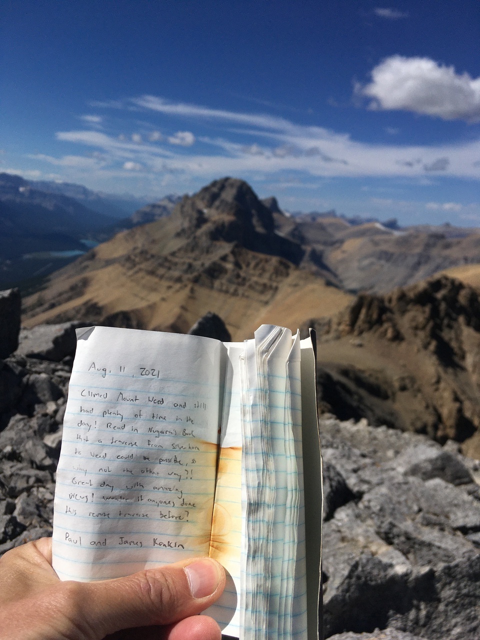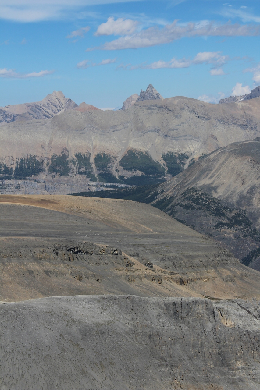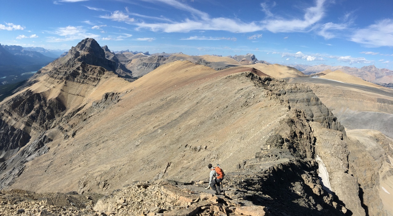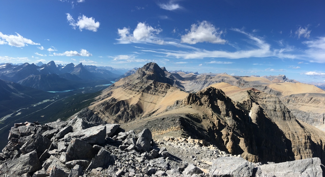 We were up there a few hours ago?! The scramble route we took up Mount Weed sure looks intimidating from here! Bison Peak is the pyramidal shape to the left, with glaciated Wilson in the distance. Mount Noyes can be seen peeking out to the right!